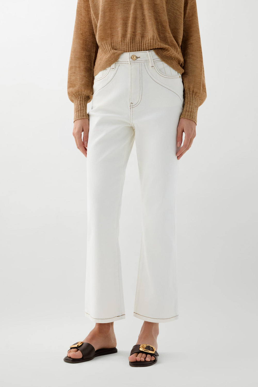Ankle jeans made of BCI Organic Cotton. Two pockets on front and back. Embroidered motif on front and back pockets. Button and zip fastening.