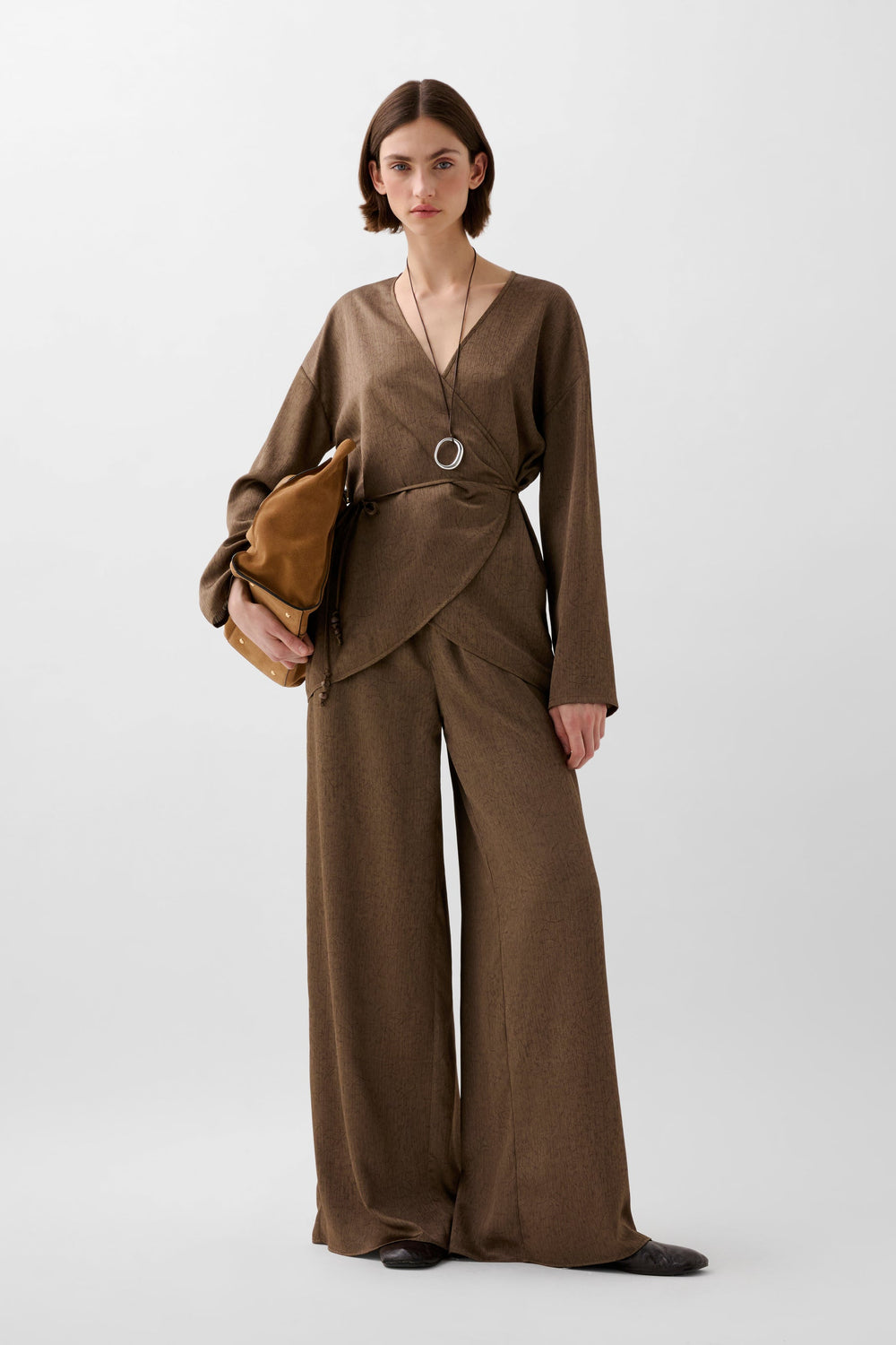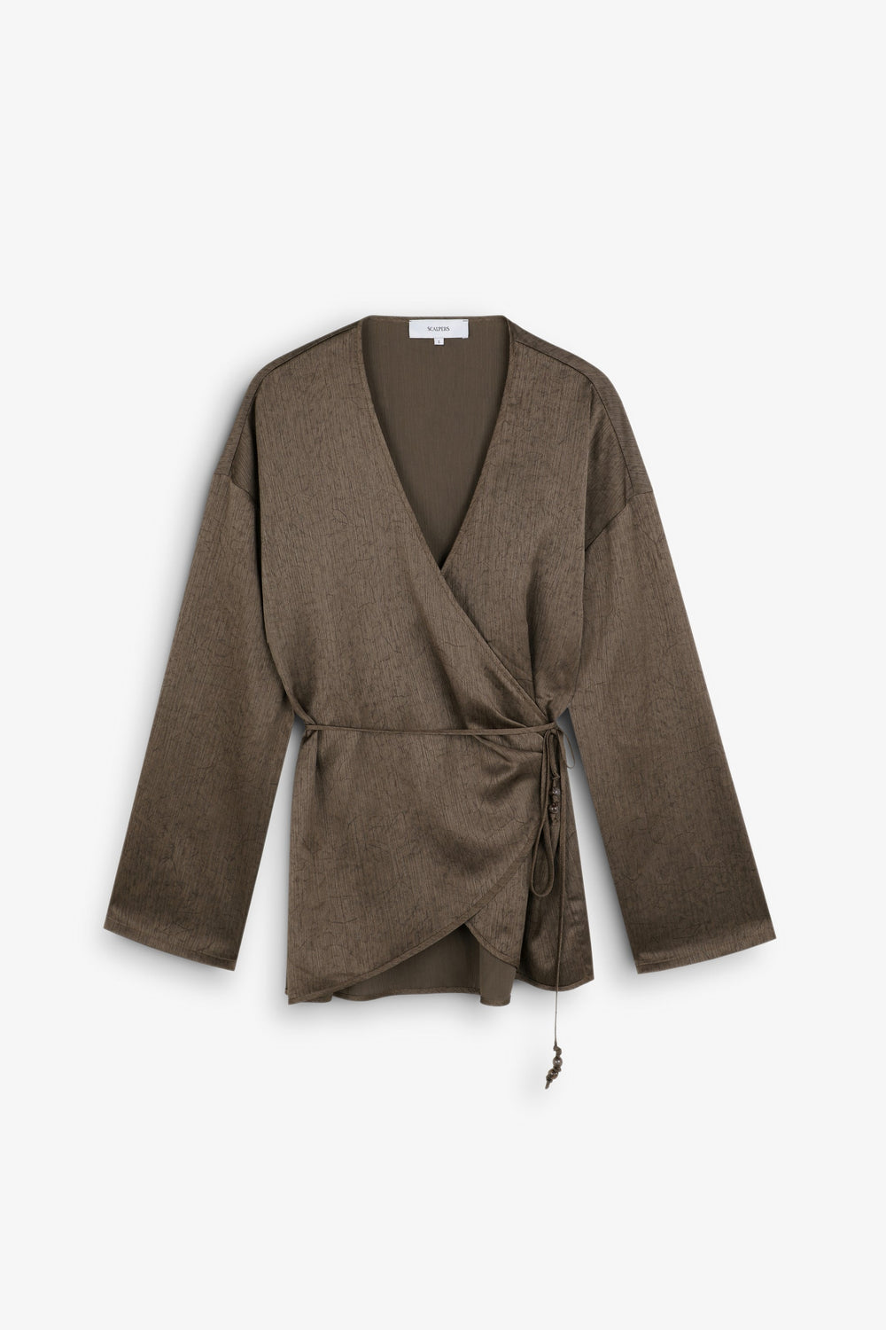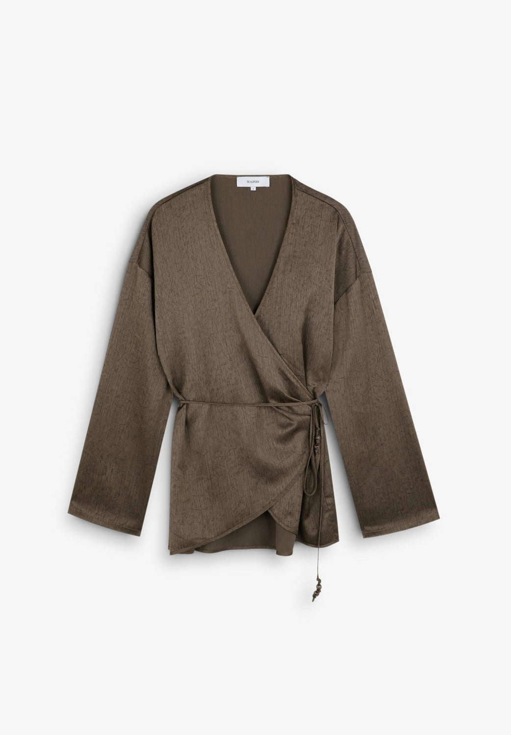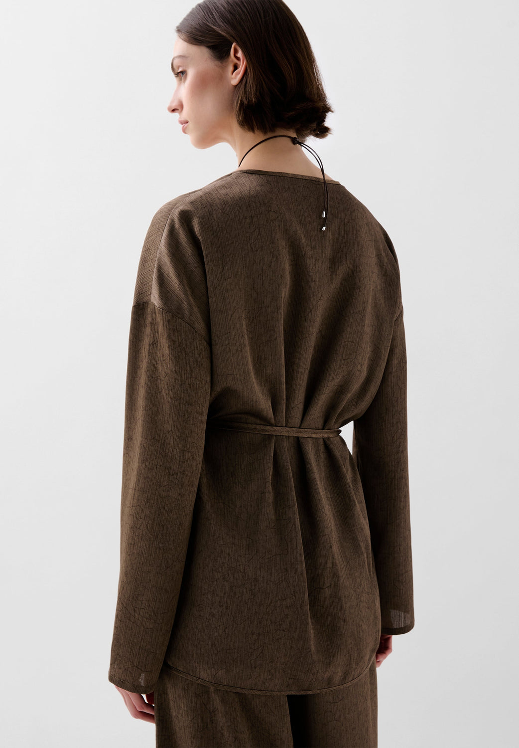 Asymmetric flowing kaftan with long sleeves. Open V-neck. Adjustable drawstring waist.