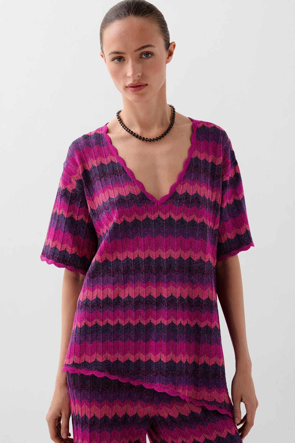 Knit sweater with die-cut details. Made of a nylon blend with metallic yarn details. Regular fit. Polo shirt collar. V-neck. Short sleeve.