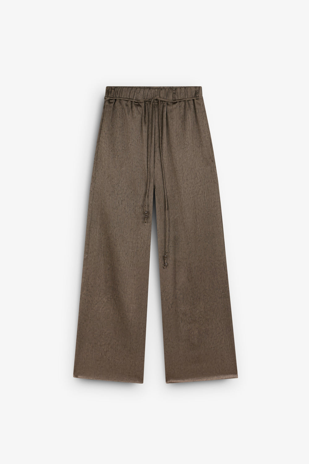 High-waist flowing trousers. Adjustable waistband. Drawstring detail.