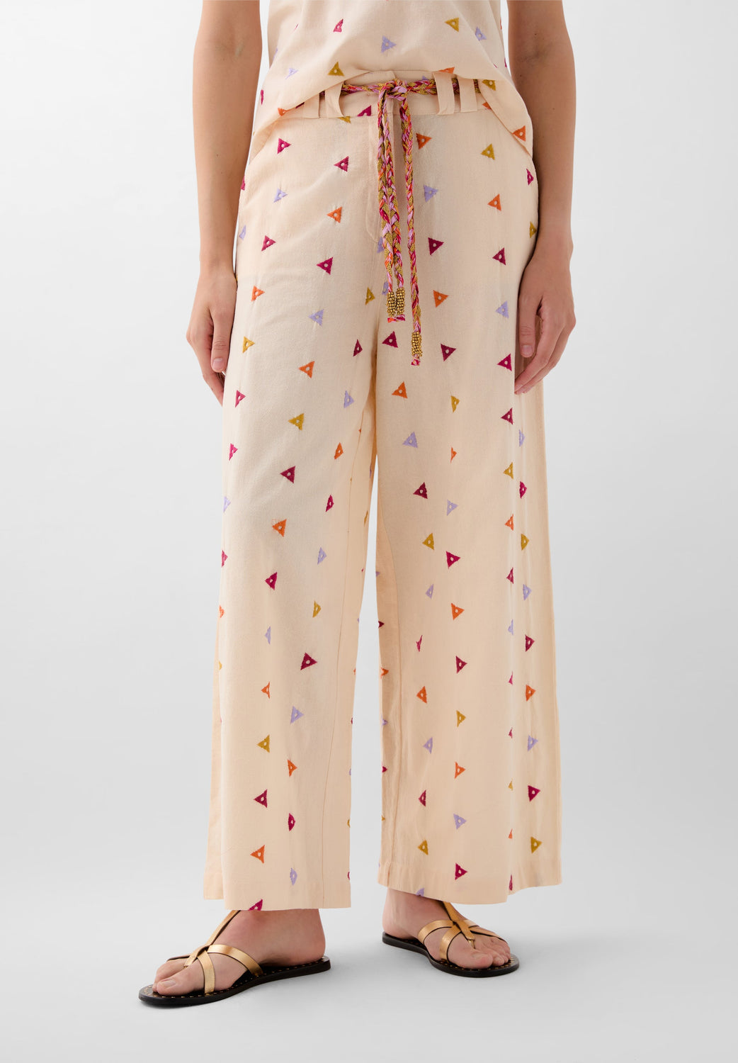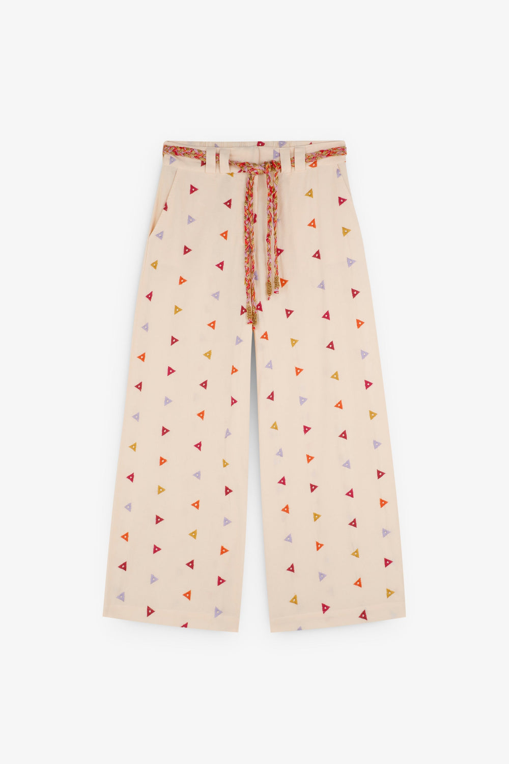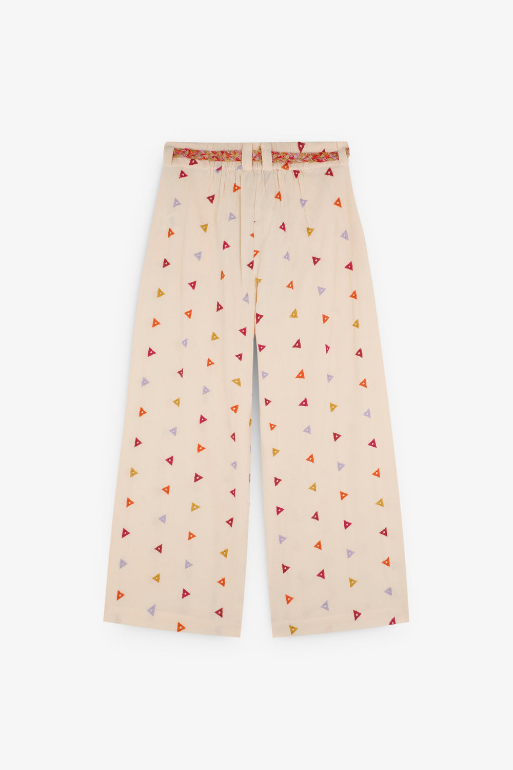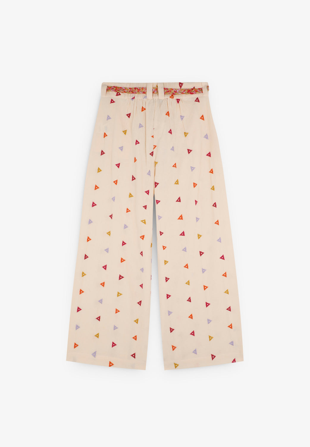 Cotton trousers with embroidered triangles. Regular fit, culotte style, with slightly elasticated back waistband. Zip and hook fastening at the front. Belt loops with multicoloured rope belt detail. Front slant pockets.