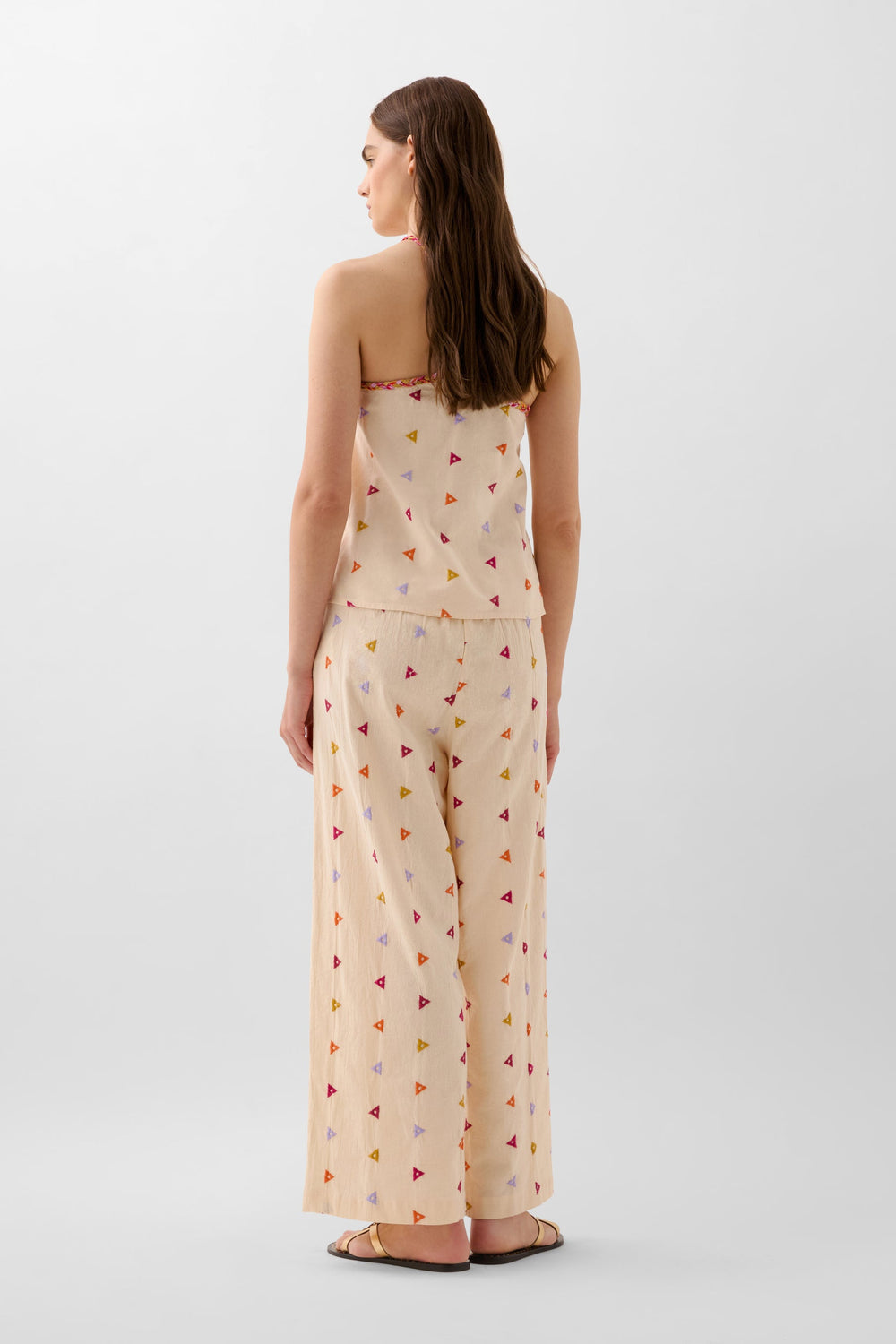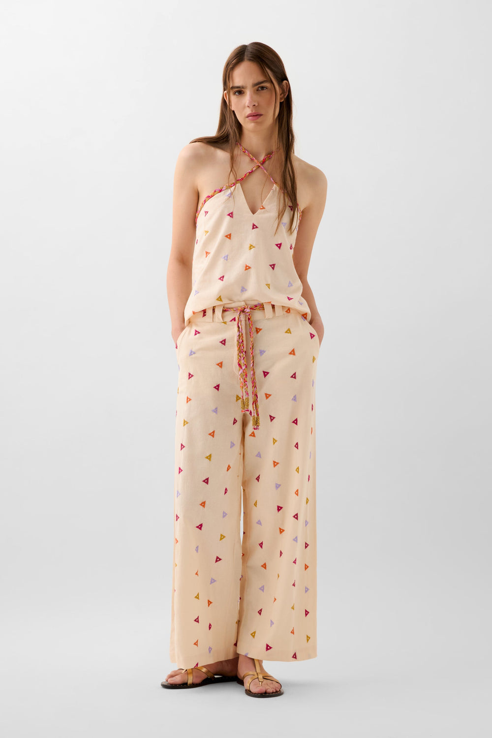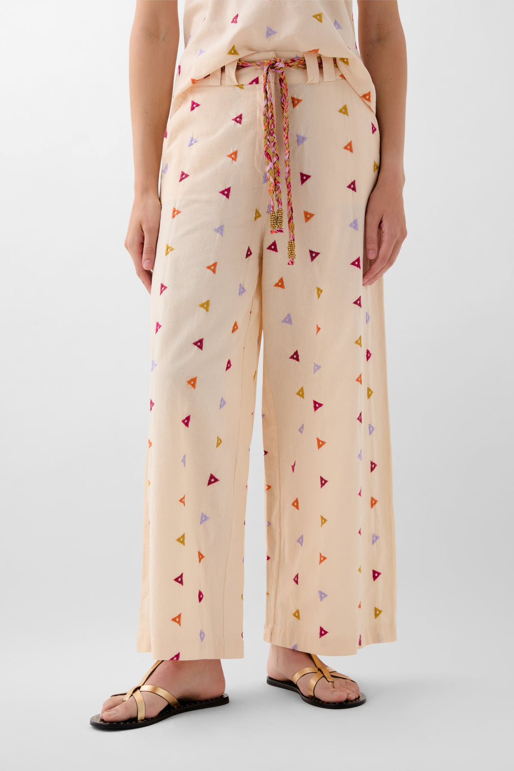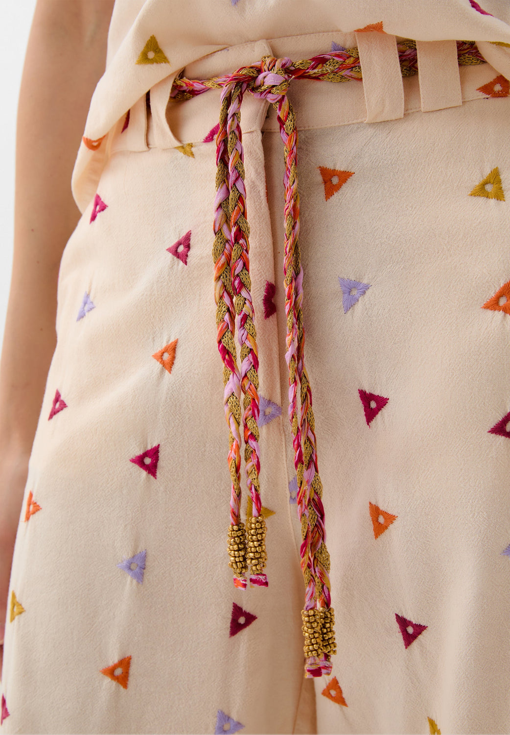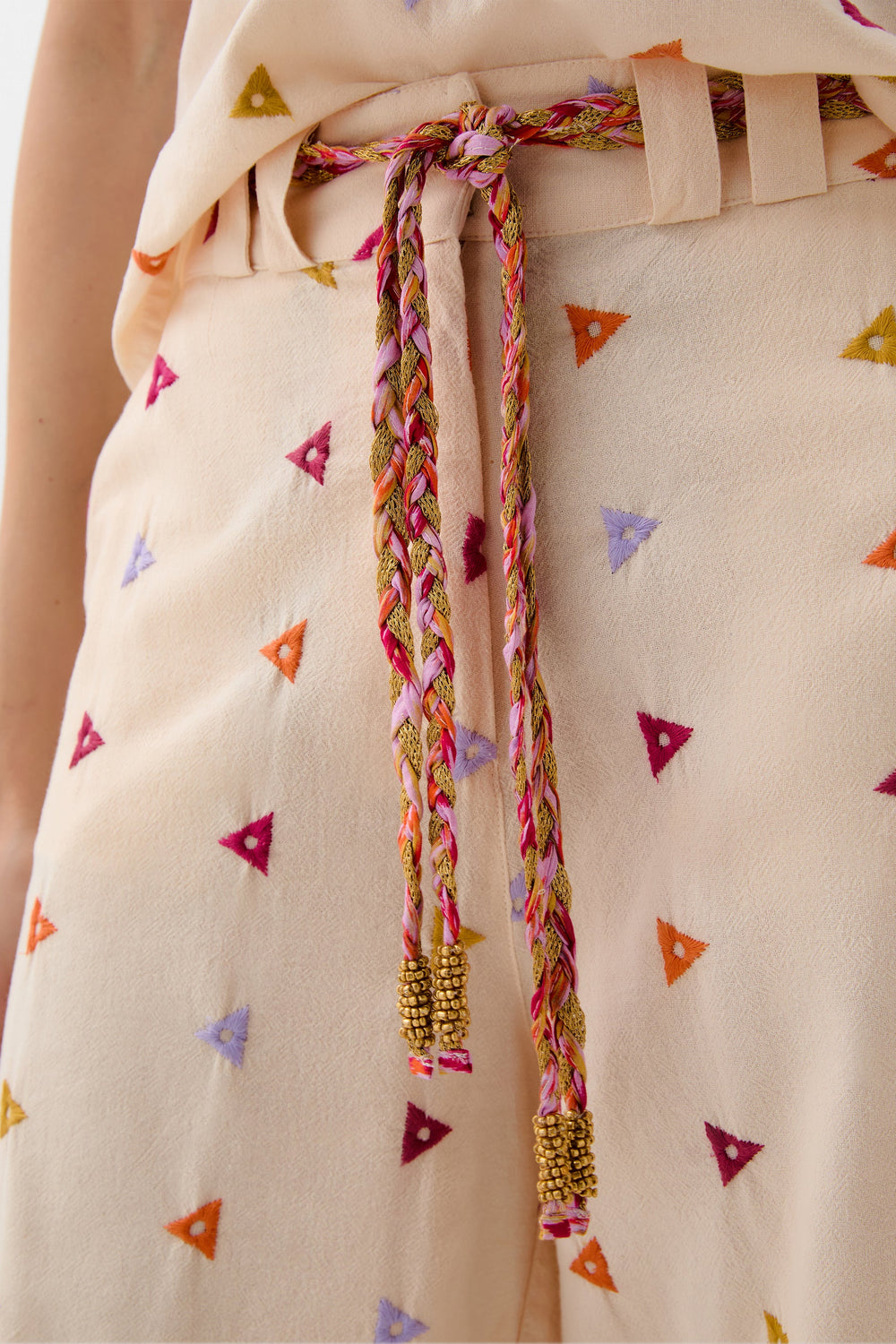 Cotton trousers with embroidered triangles. Regular fit, culotte style, with slightly elasticated back waistband. Zip and hook fastening at the front. Belt loops with multicoloured rope belt detail. Front slant pockets.