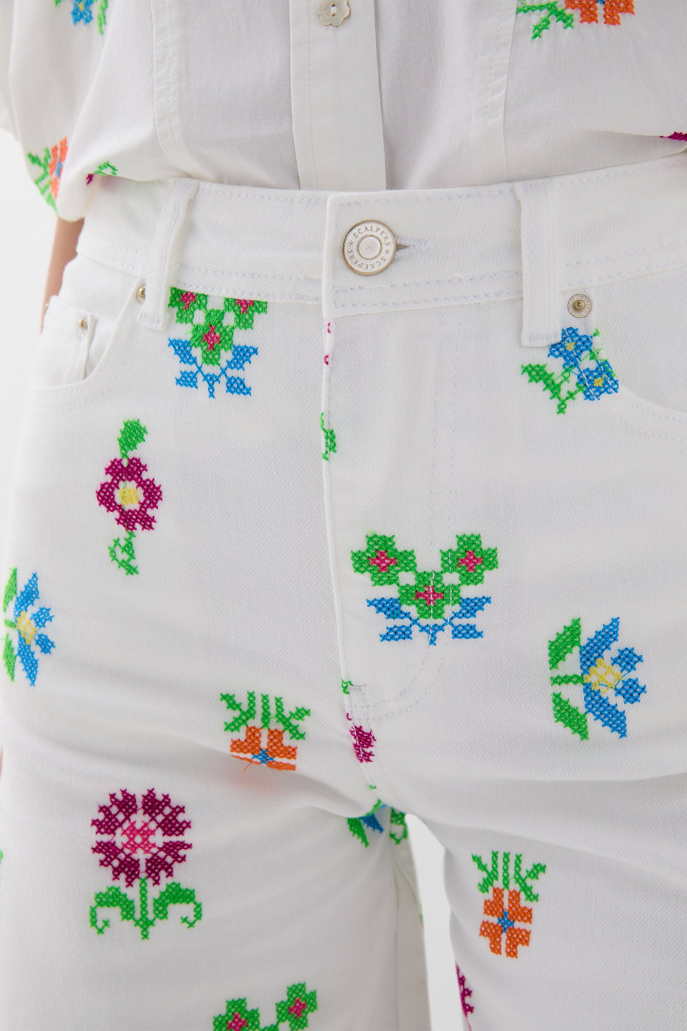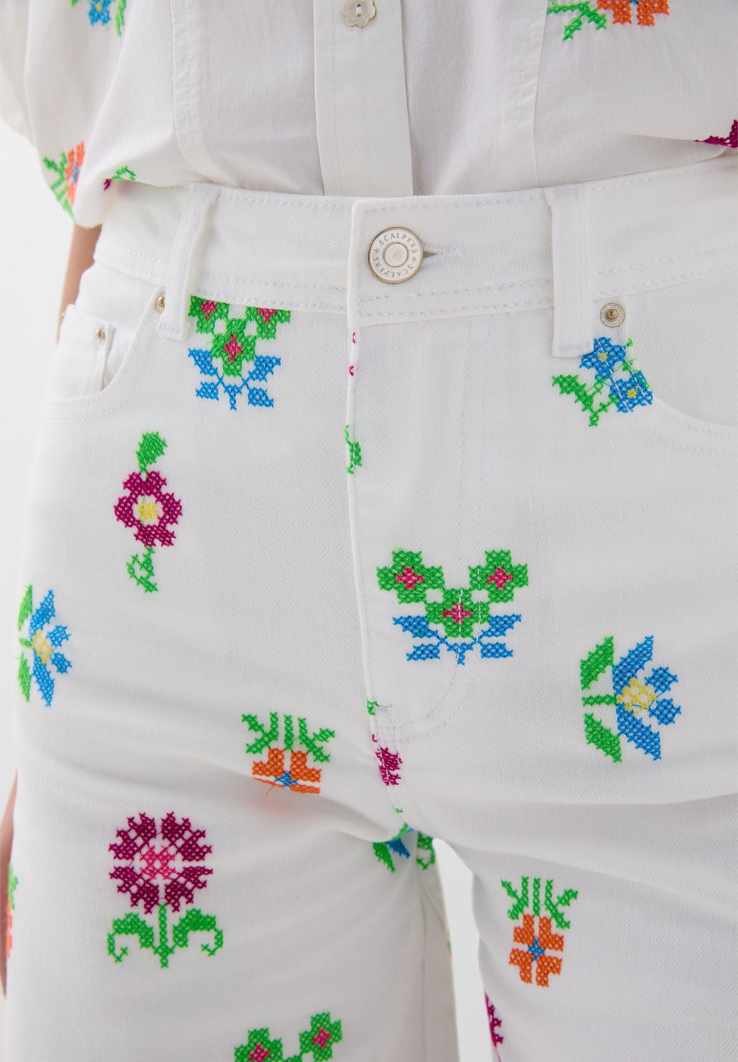 Culotte jeans with floral embroidery. Regular fit with high waist. Zip and button fastening. Front slant pockets and back patch pockets Belt loops at the waist.
