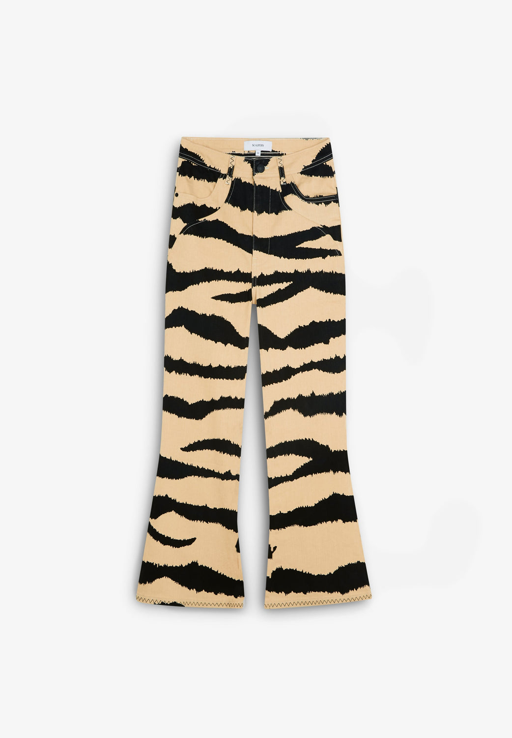 Jeans with zebra print made of slightly stretchy cotton blend. Ankle flare with a medium waist, button and zip fly fastening and belt loops at the waist. Front and back pockets and hem with visible stitching.