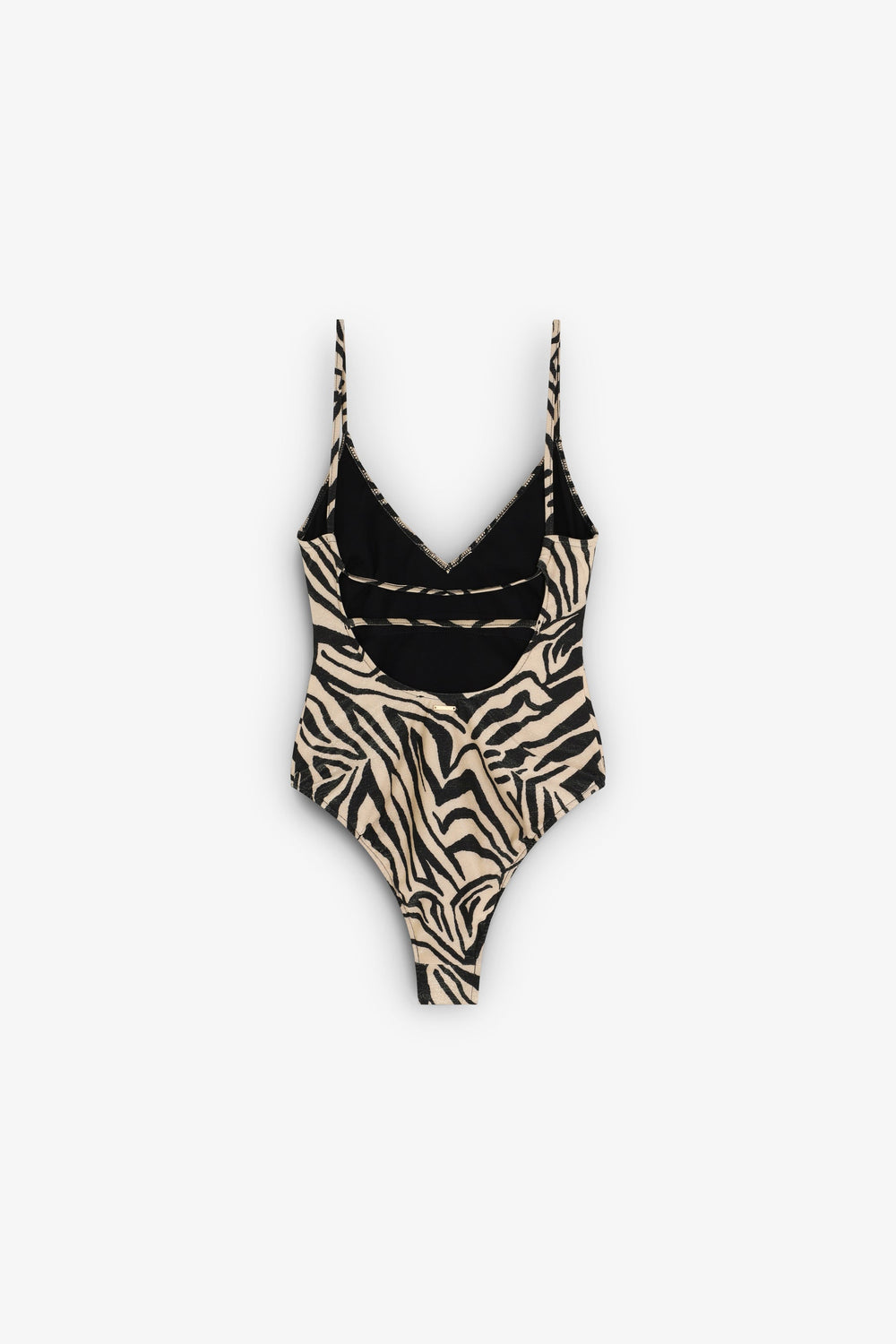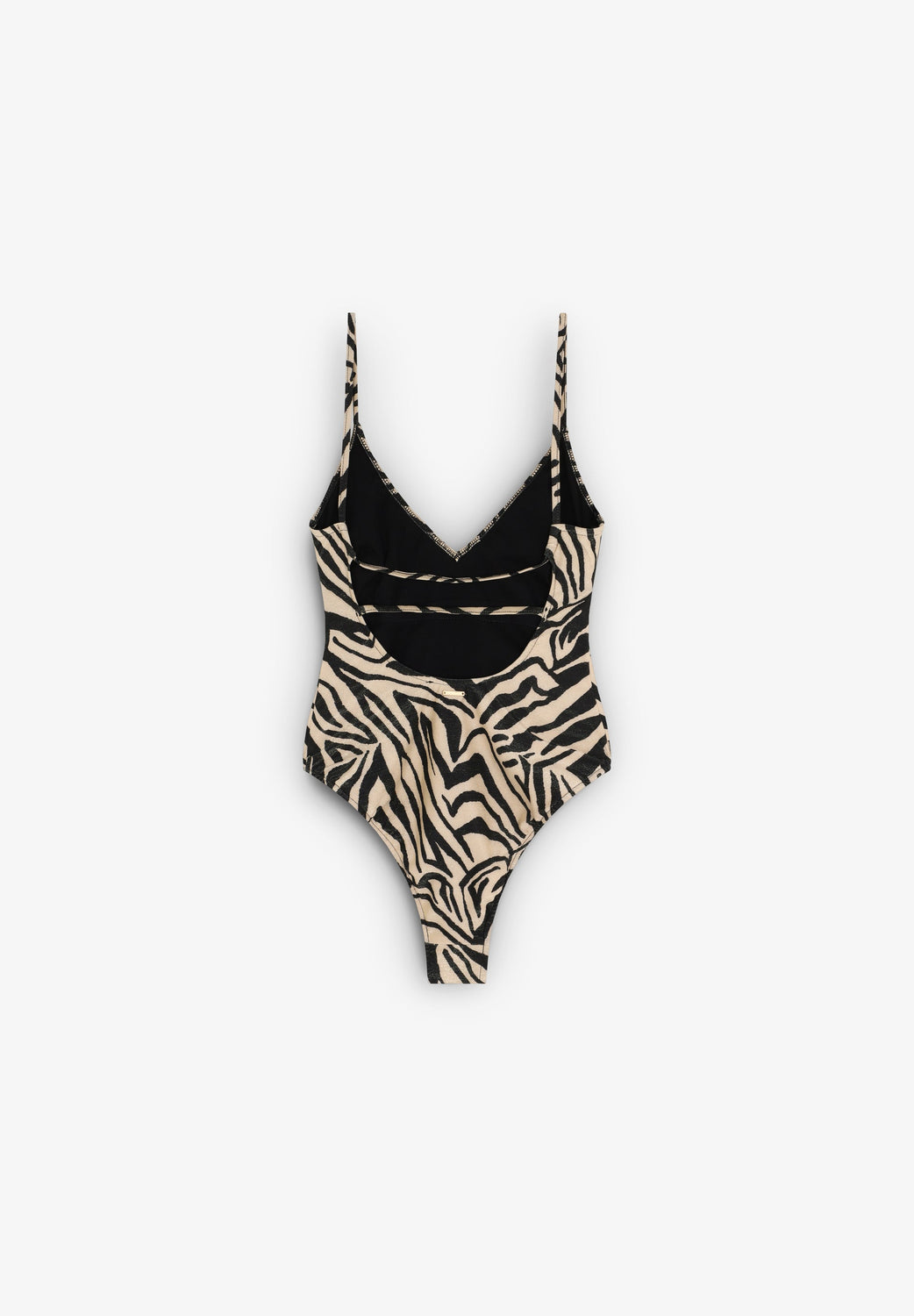 Swimsuit made of technical fabric with animal print. V-neck with straps and cut-out back.