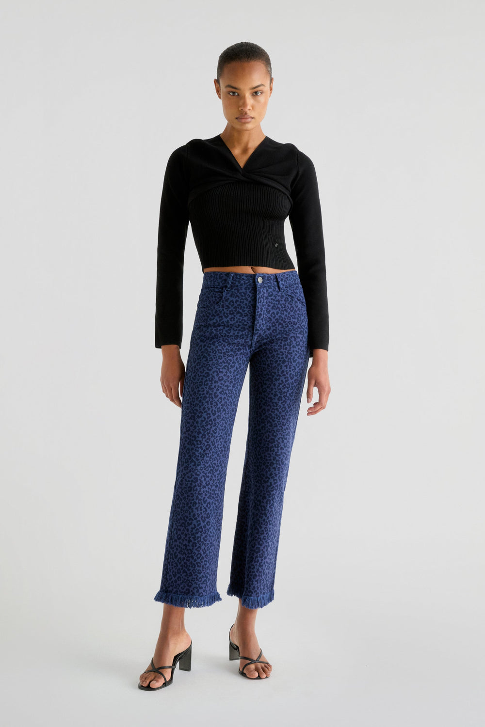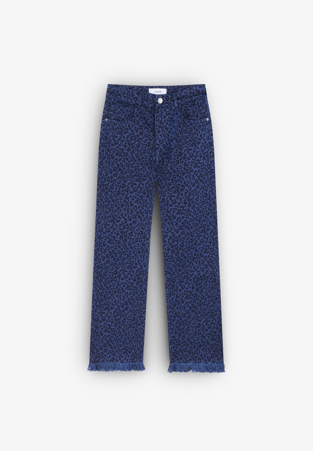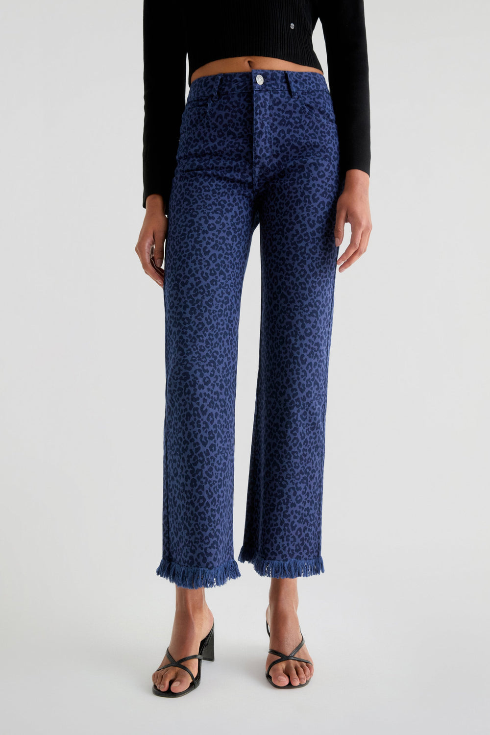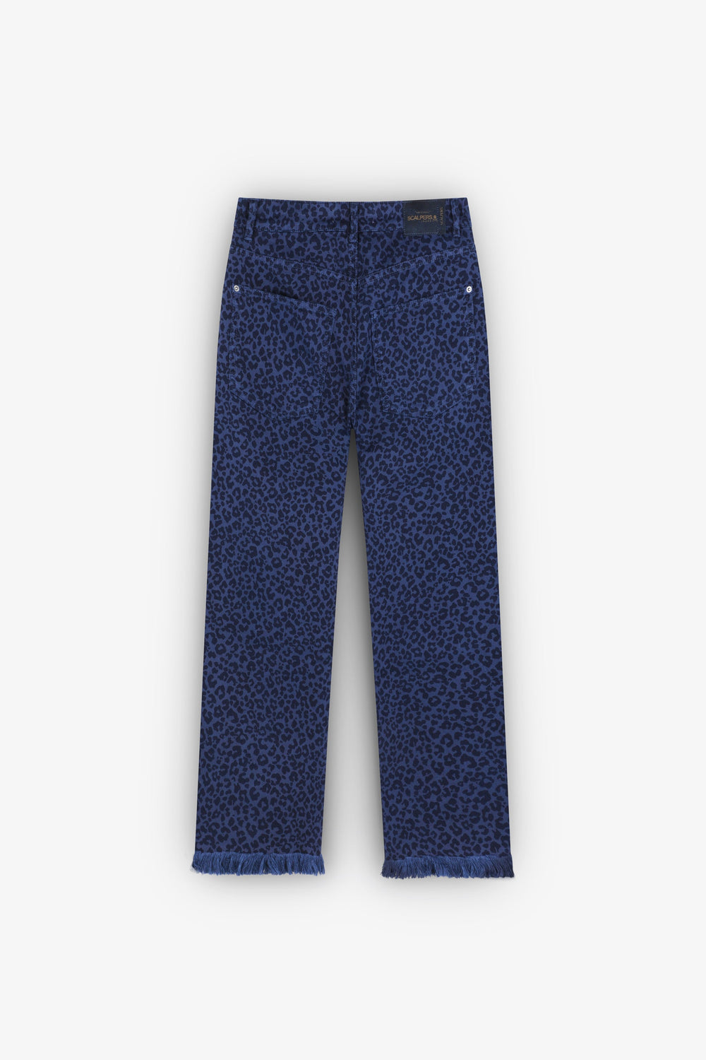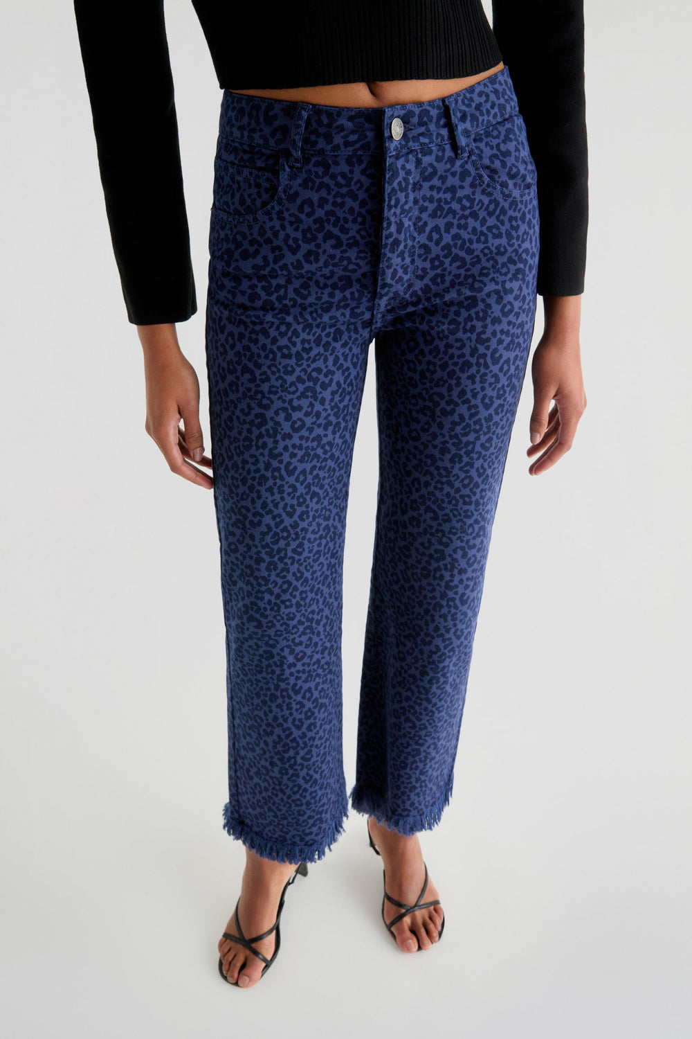 Trousers with an animal print, made of slightly stretchy cotton. Straight regular fit with a high waist, button and zip fly fastening and front and back pockets. Belt loops at waist and frayed hems.