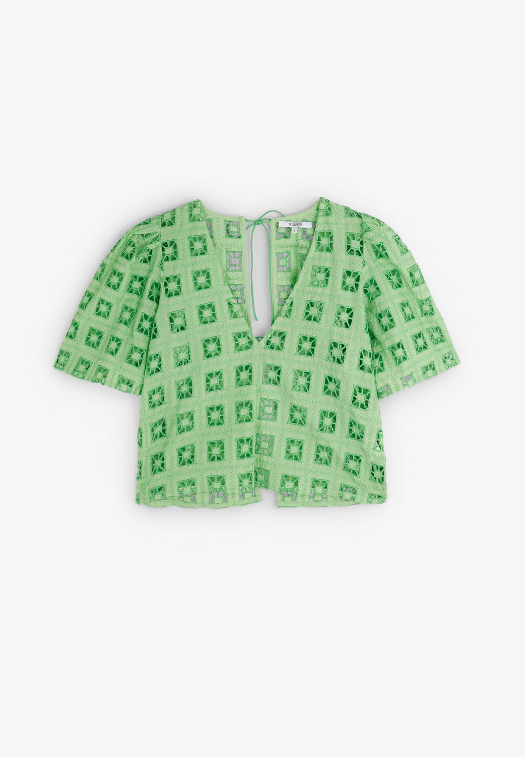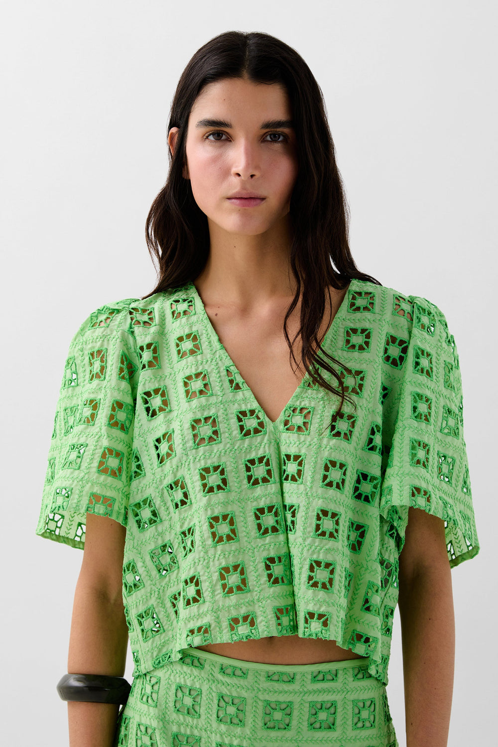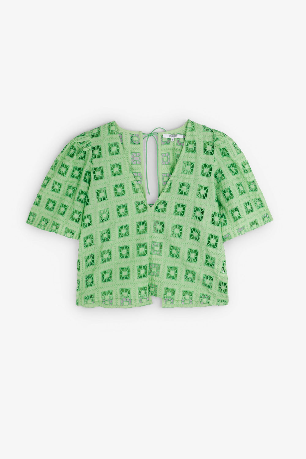 100% cotton top with embroidered details. Regular fit, slightly cropped, V-neckline and short sleeves with ruched shoulders. Tie fastening detail on the back.