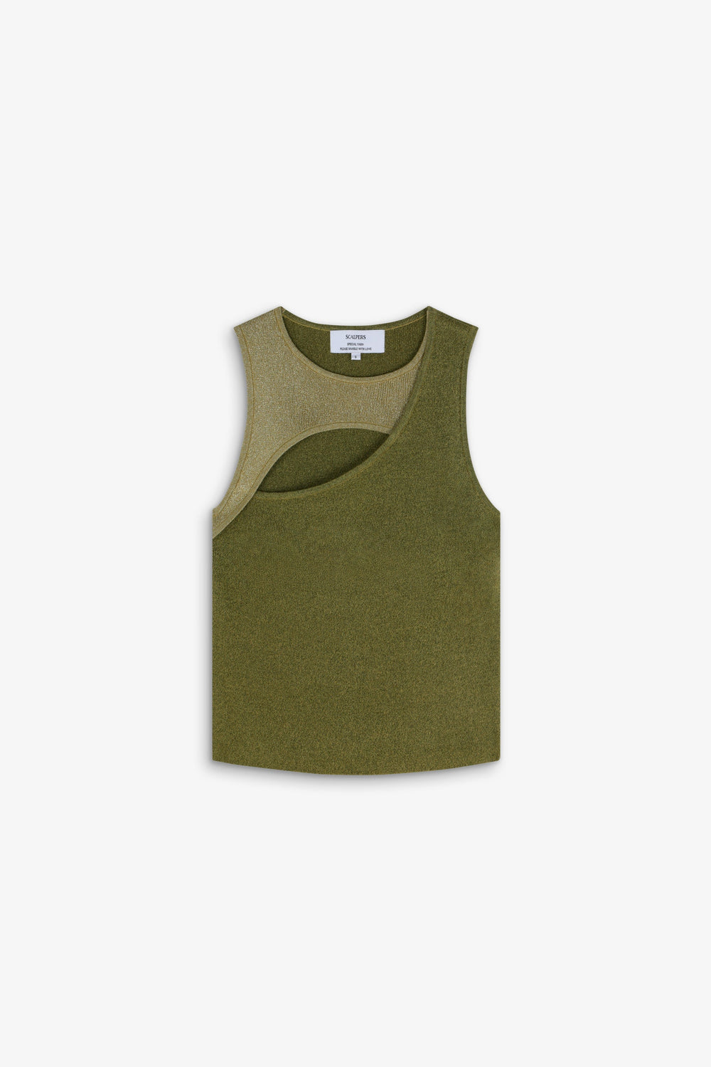 Asymmetric top. Overlapping fabric. Sleeveless. Cutout in chest area. Slightly stretchy.