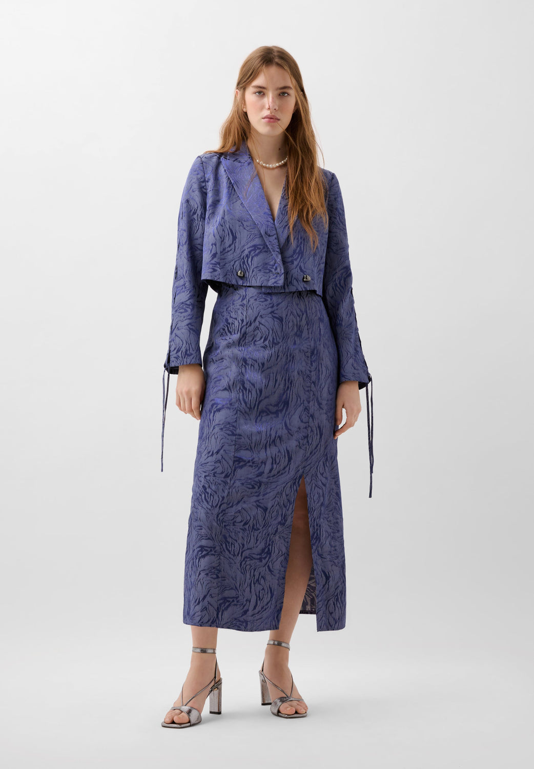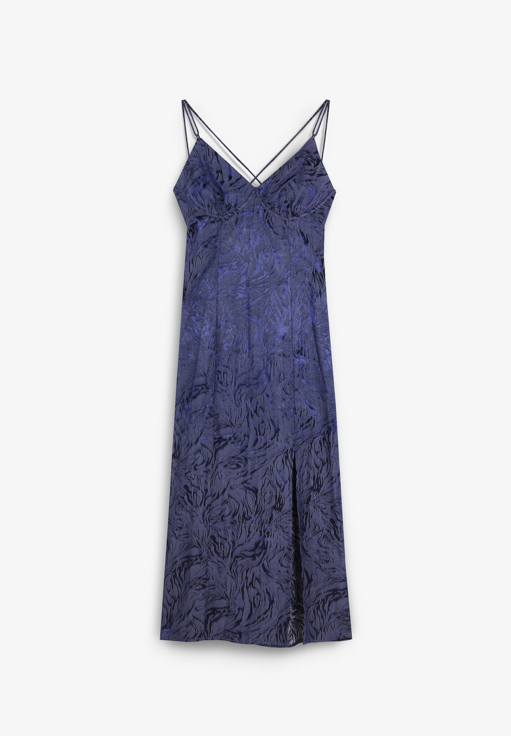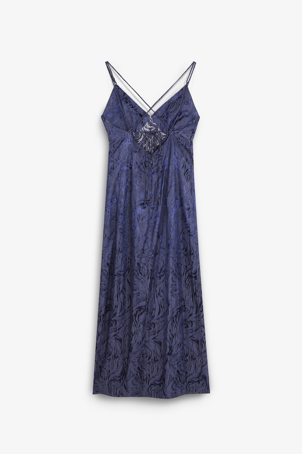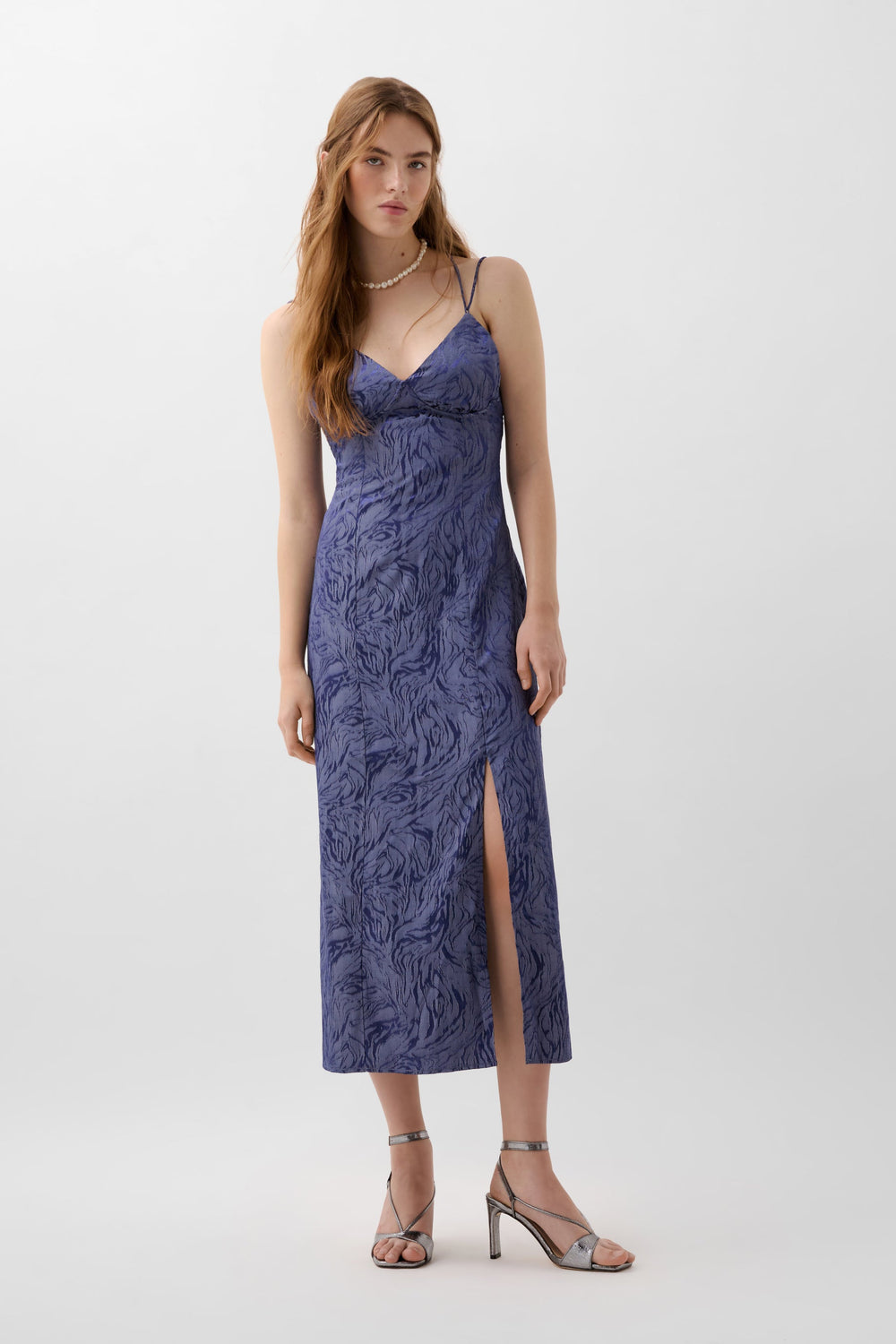 Dress made of jacquard fabric. Slim fit, V-neckline and zip fastening. Thin straps that end in a bow. Front side slit.