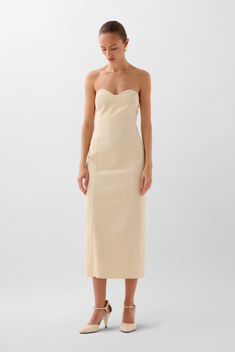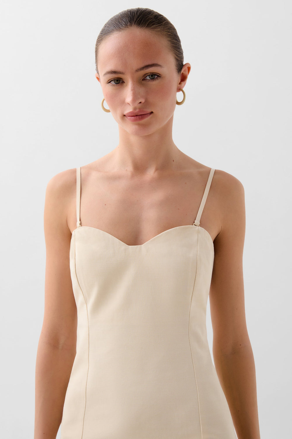 Dress made of a cotton blend. Fitted with sweetheart neckline and detachable straps. Front darts, zip fastening and back slit.