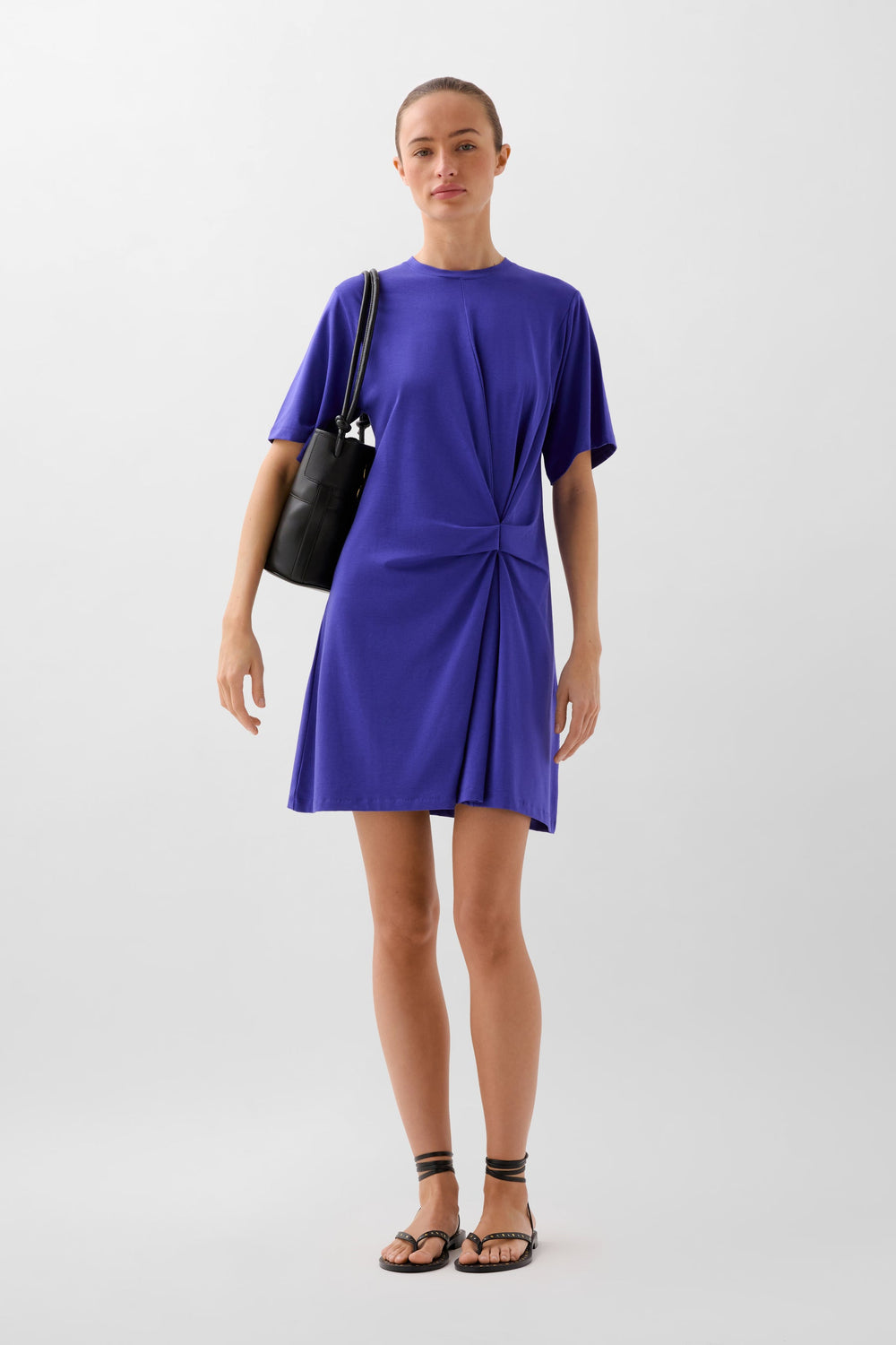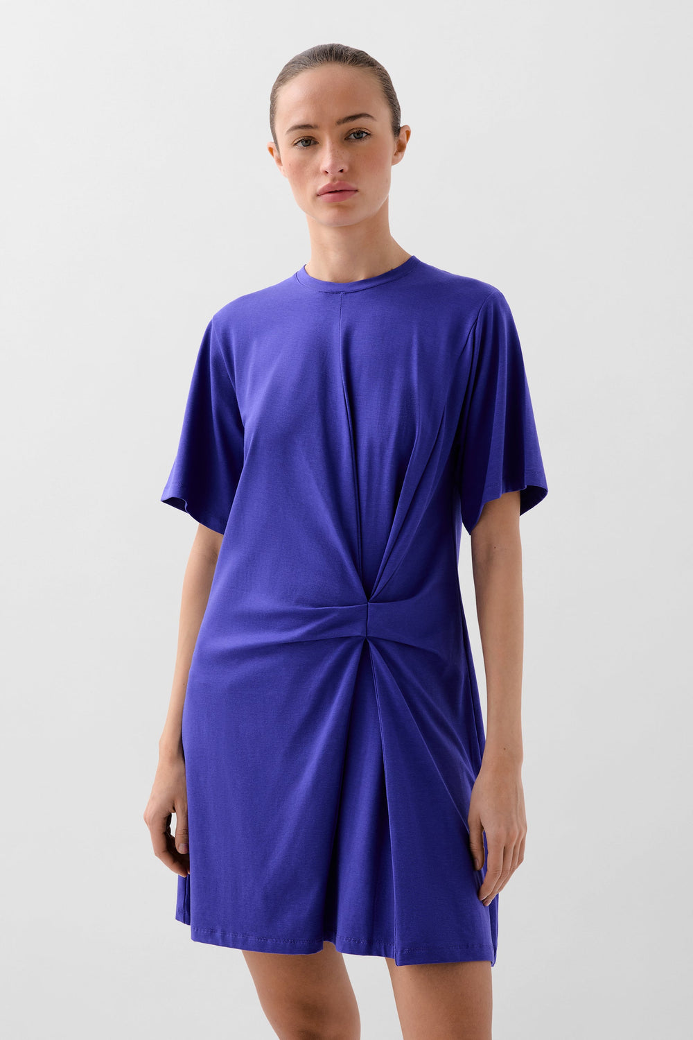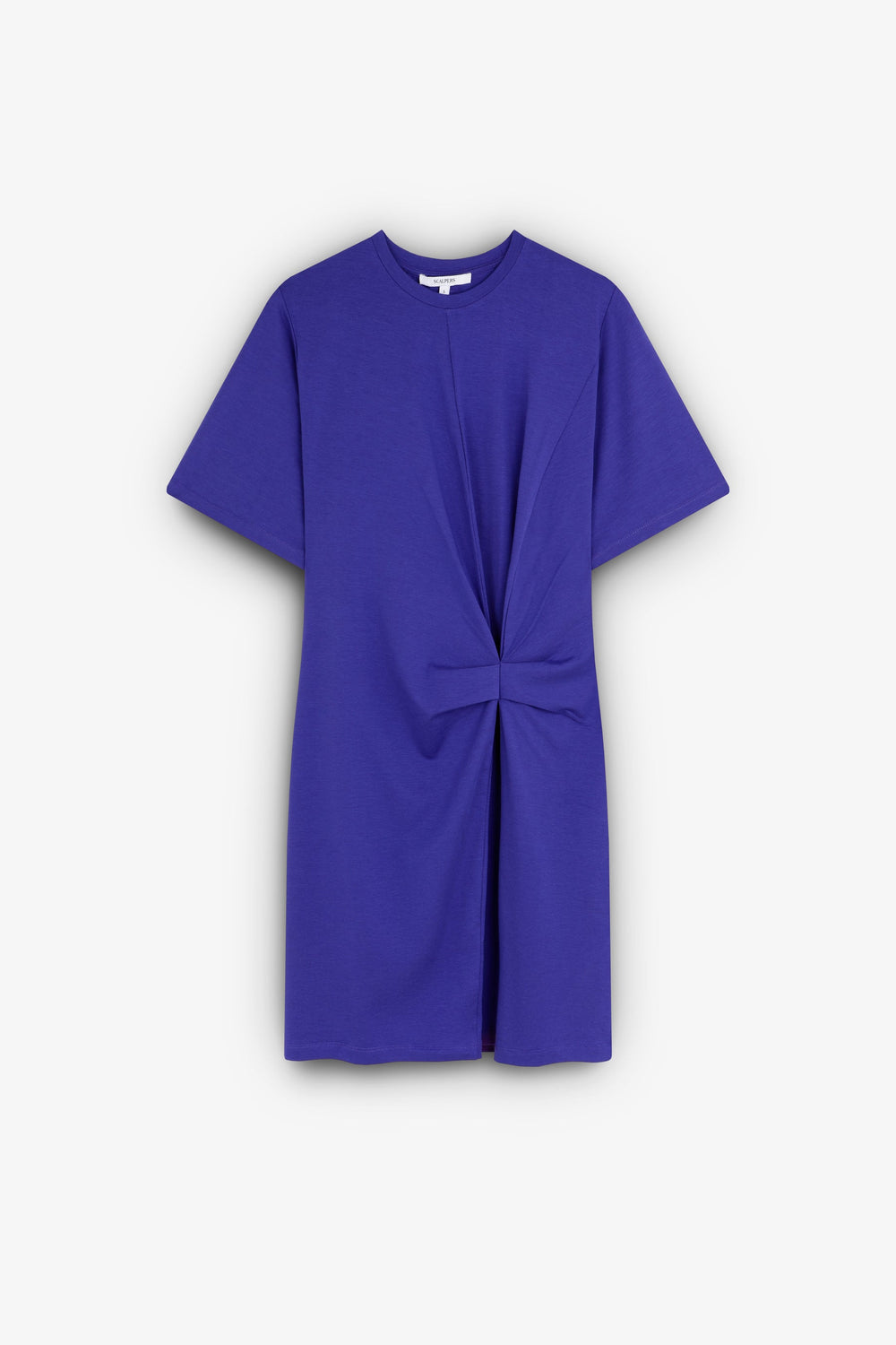 Midi dress made of slightly stretchy fluid fabric. Regular fit, round neck, short sleeves and knot detail at the waist.