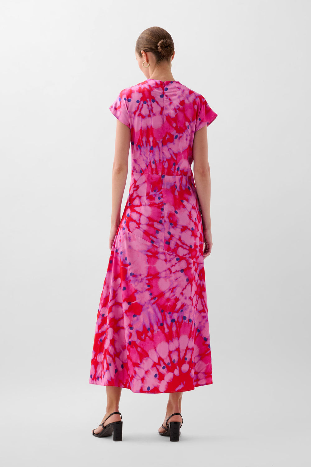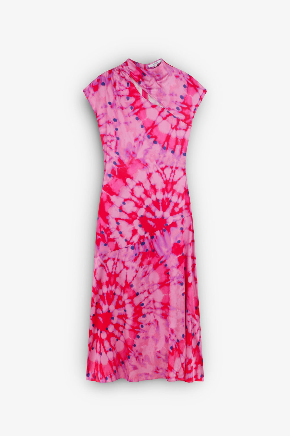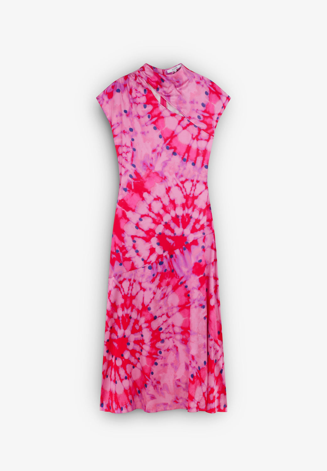 Dress made of flowing fabric with tie-dye print. Midi length, stand-up collar with asymmetric cut-out detail at chest and back zip fastening. Short sleeves and side slit.