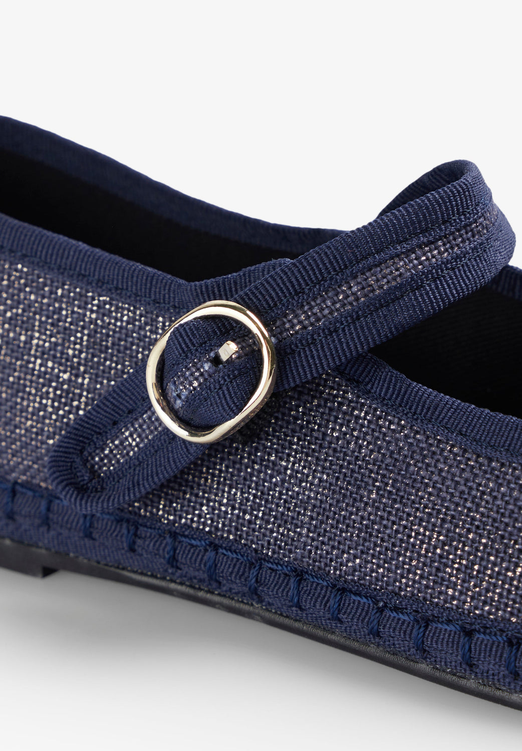 Slippers made in a rustic fabric with metal buckle fastening and contrast sole and trim.