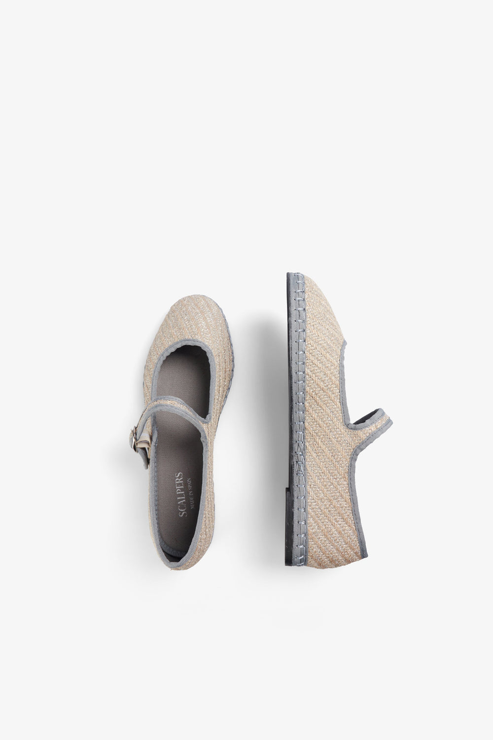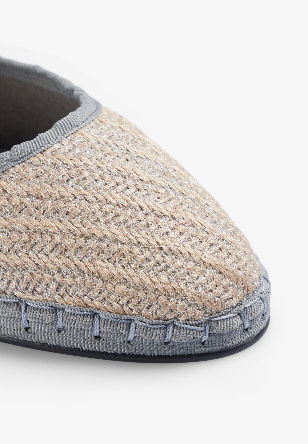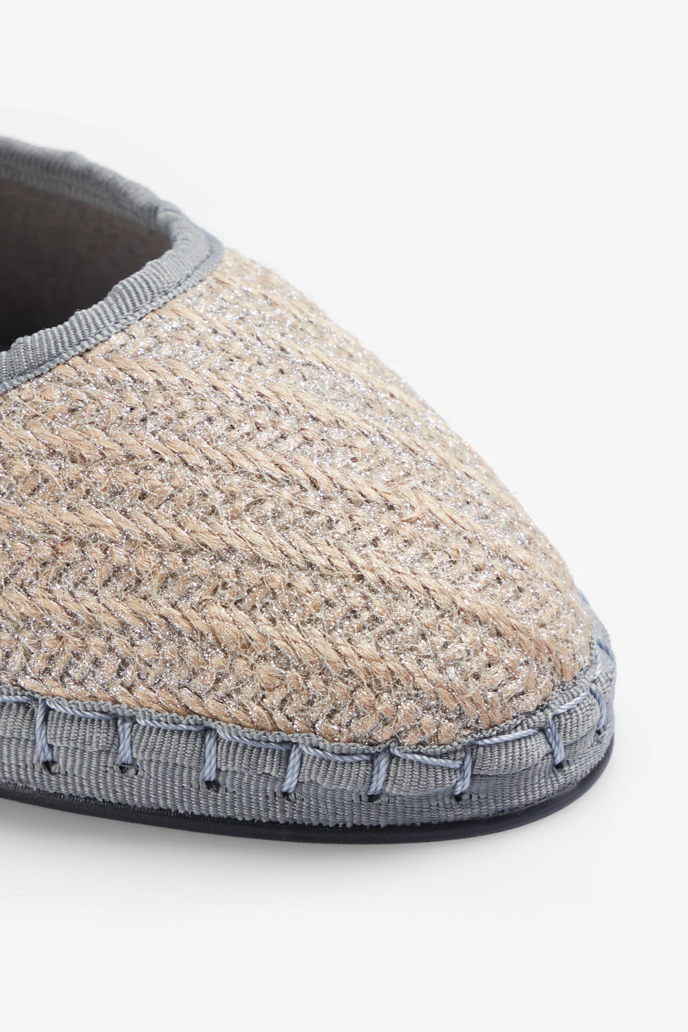 Slippers made in a rustic fabric with metal buckle fastening and contrast sole and trim.