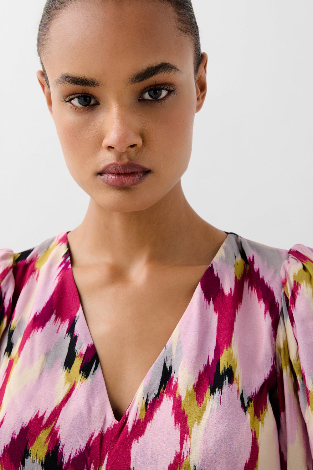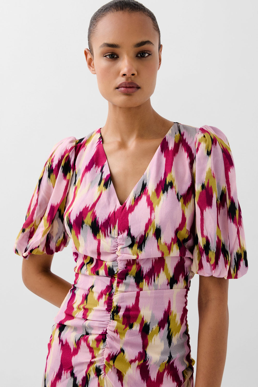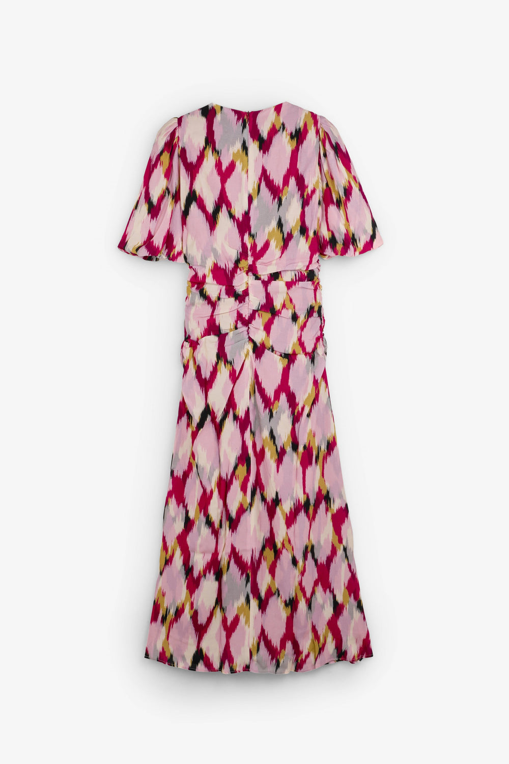 Dress made of flowing fabric. Slim fit, V-neck with gathering at the waist and short puff sleeves. Inner lining and concealed zip back fastening.