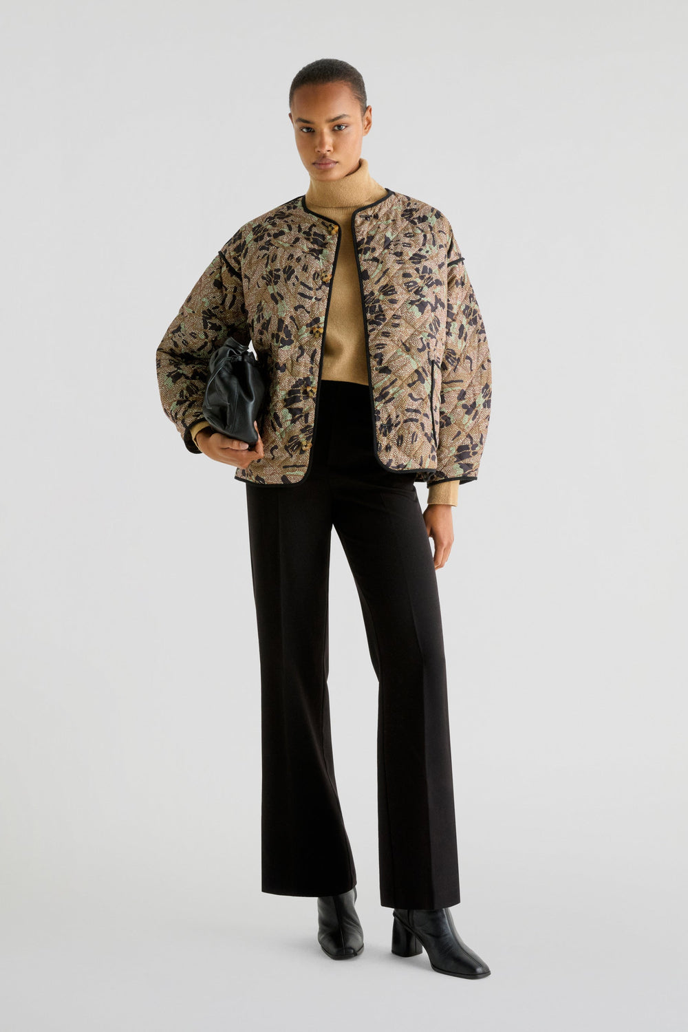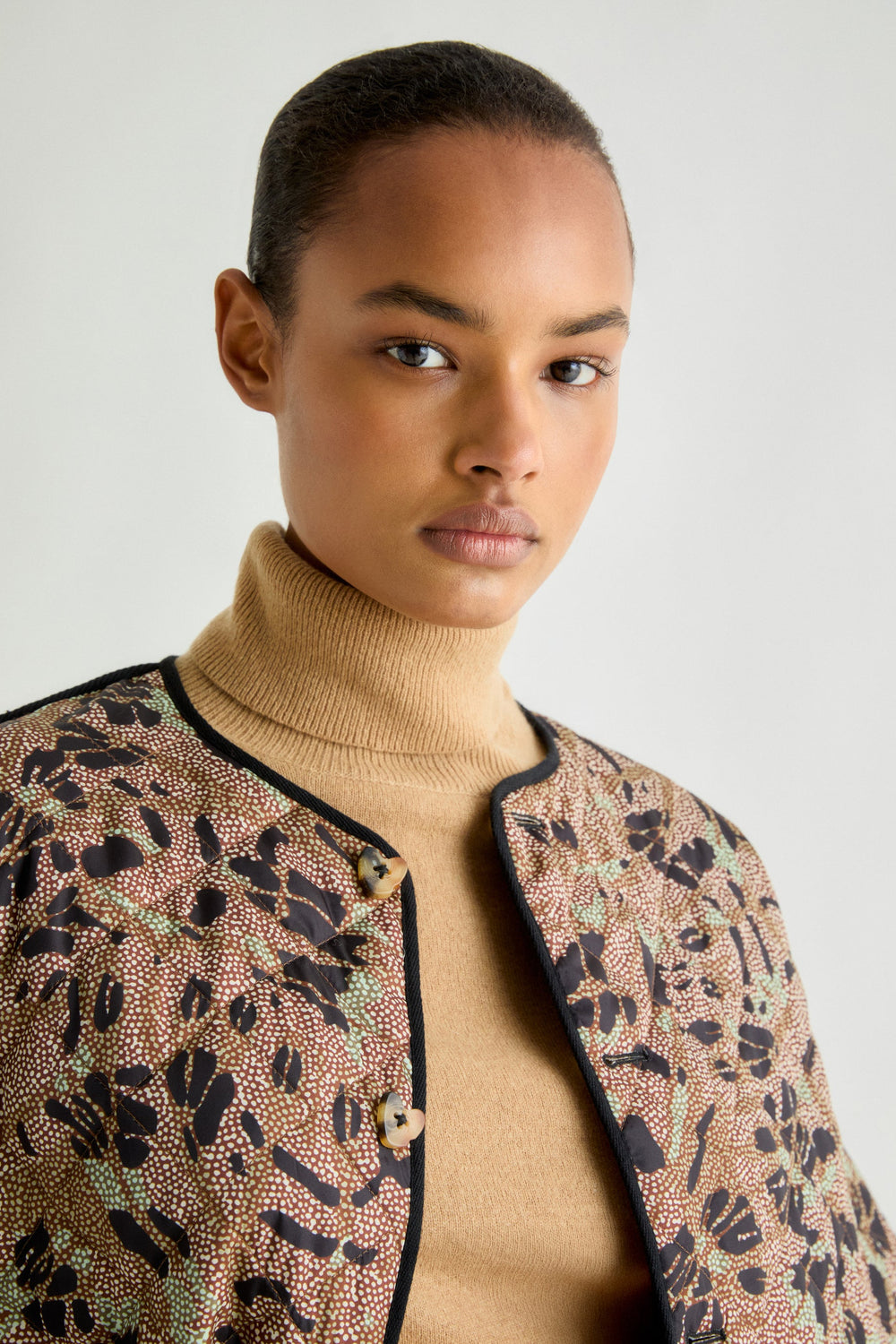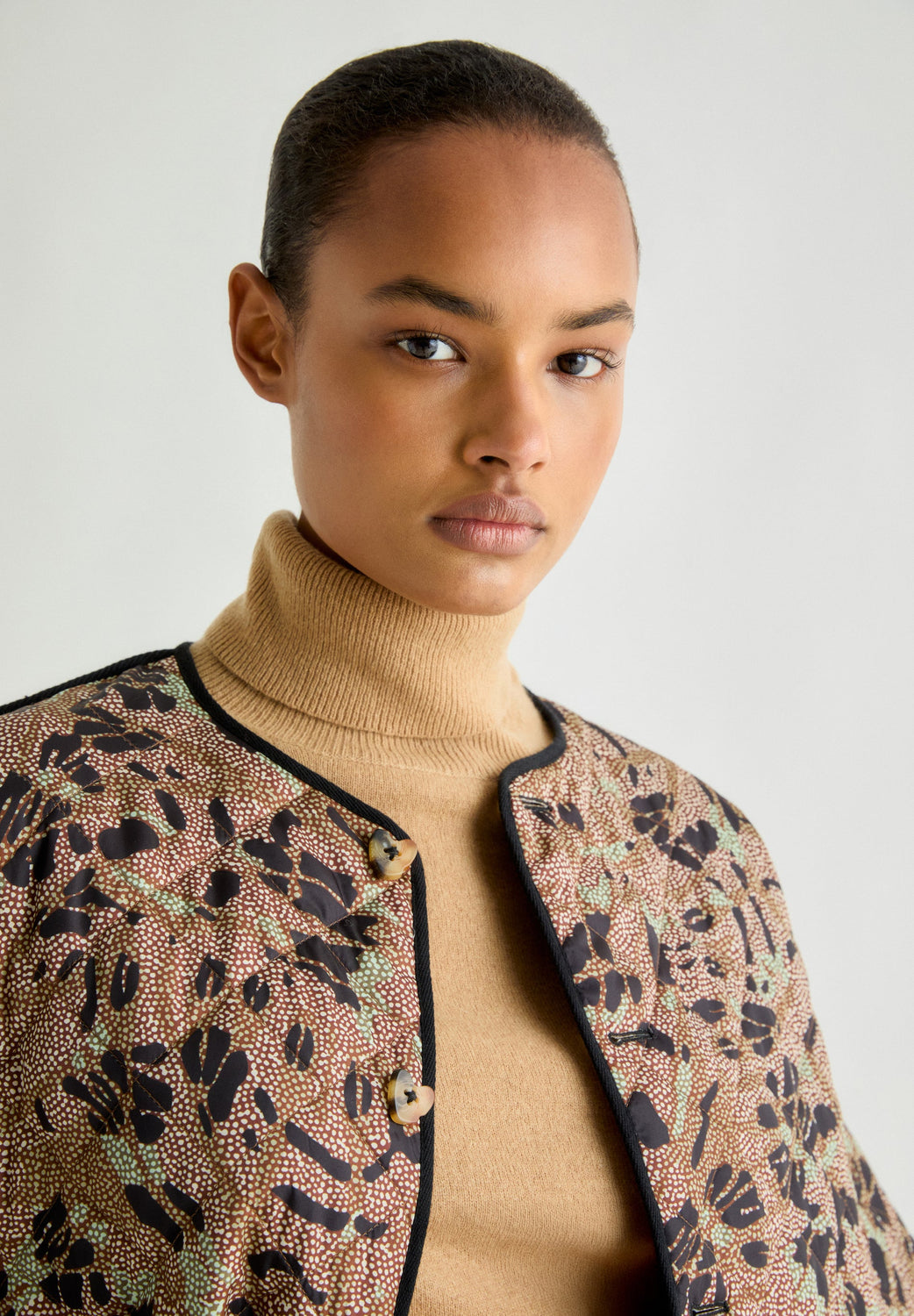 Puffer jacket with a print. Regular fit, round neck and button fastening. Slightly puffed long sleeves. Patch pockets and piping detail on the seams.
