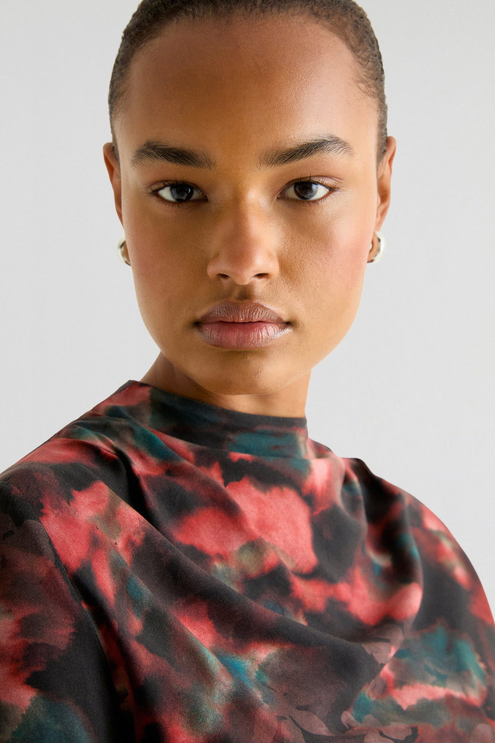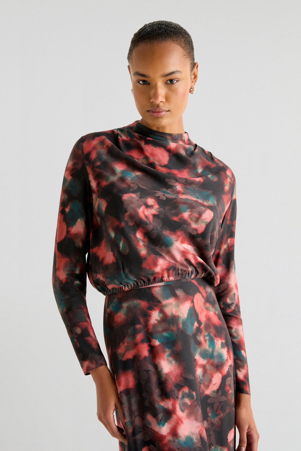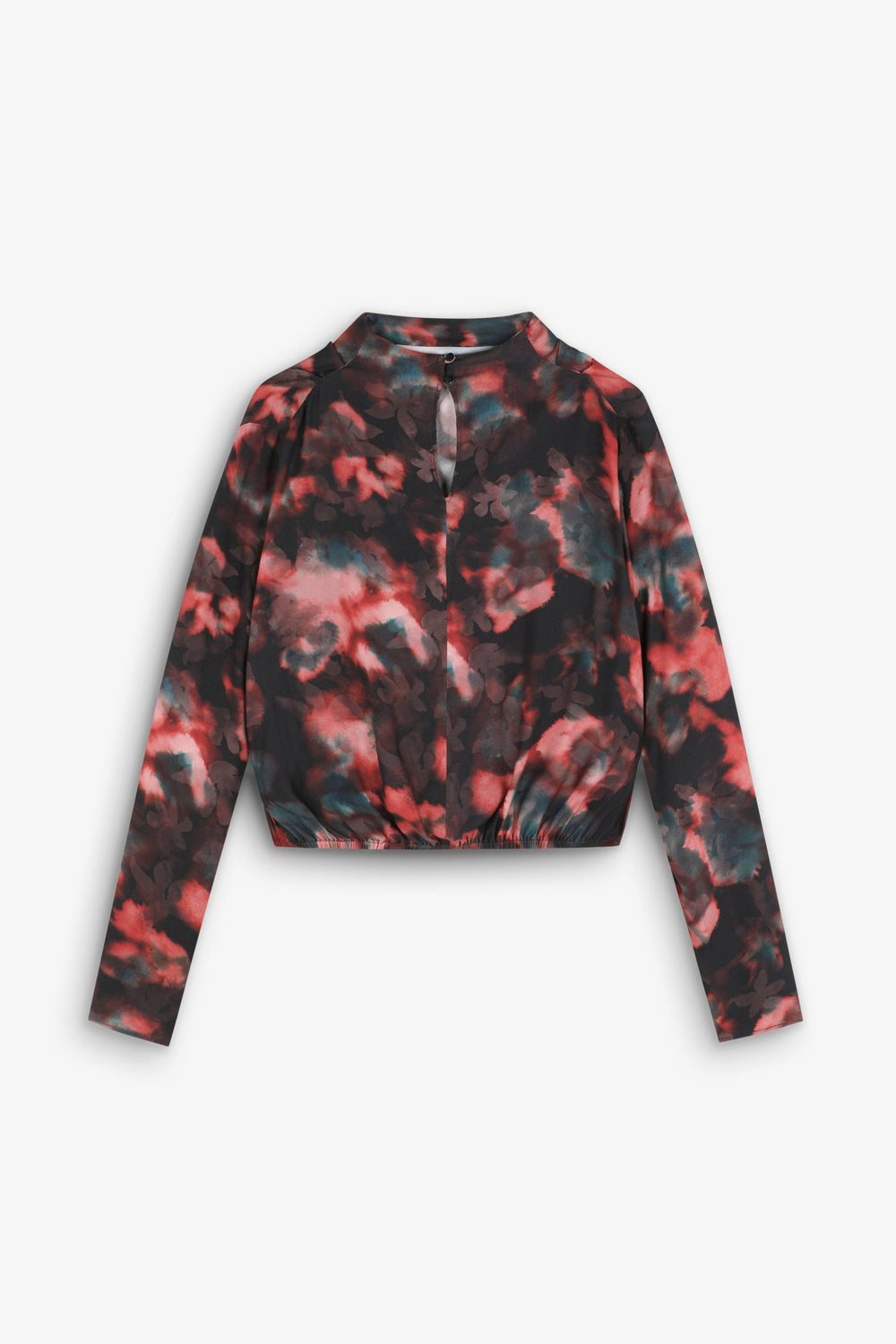 Printed blouse made of flowing fabric. Cropped regular fit, slightly high neck with draped detail and back button fastening. Long sleeves and hem with elasticated trims.