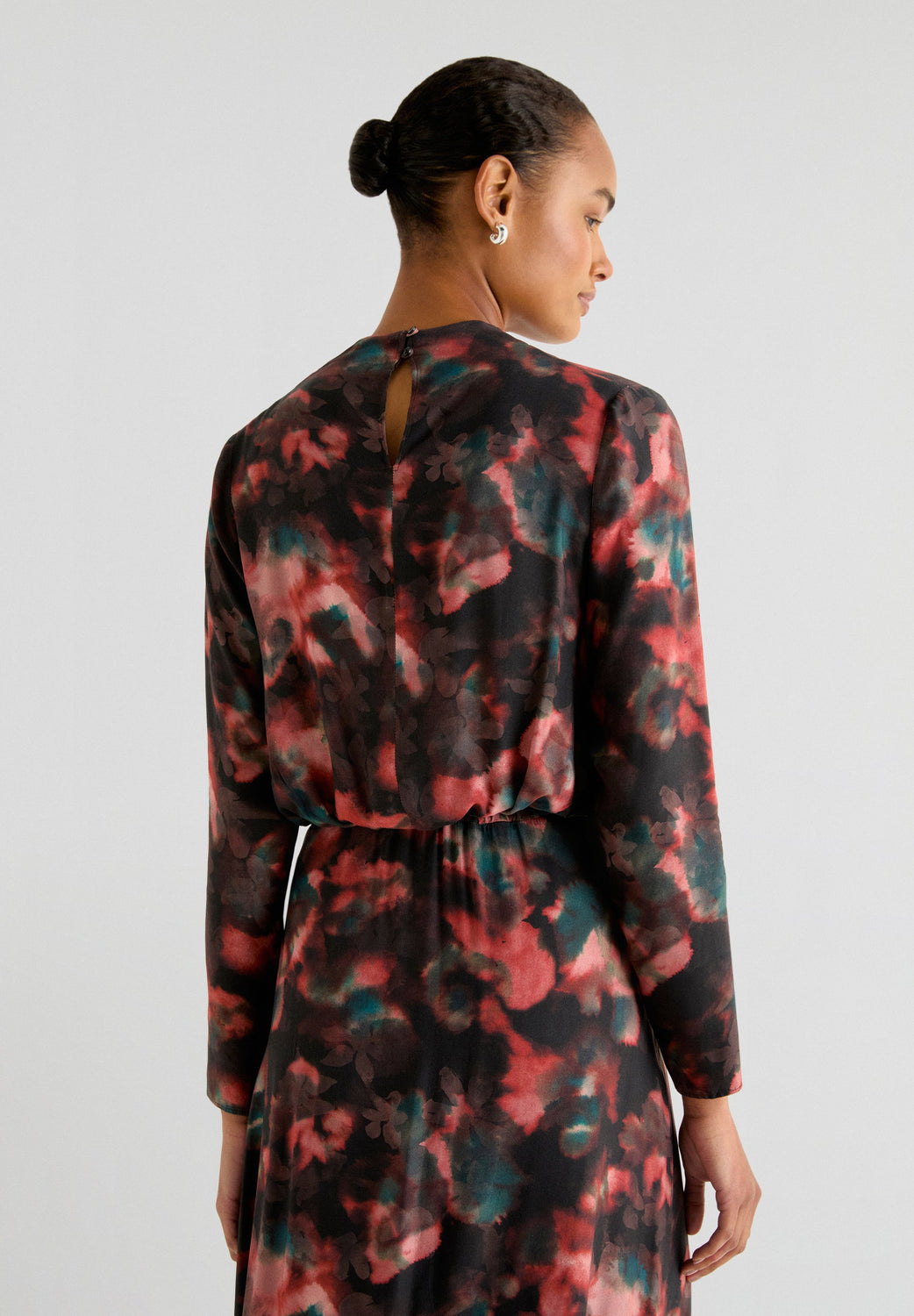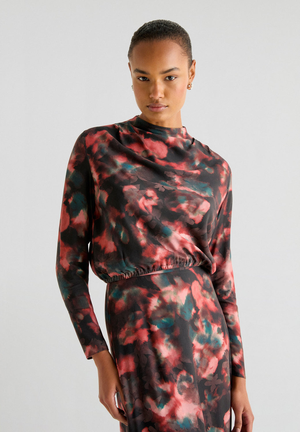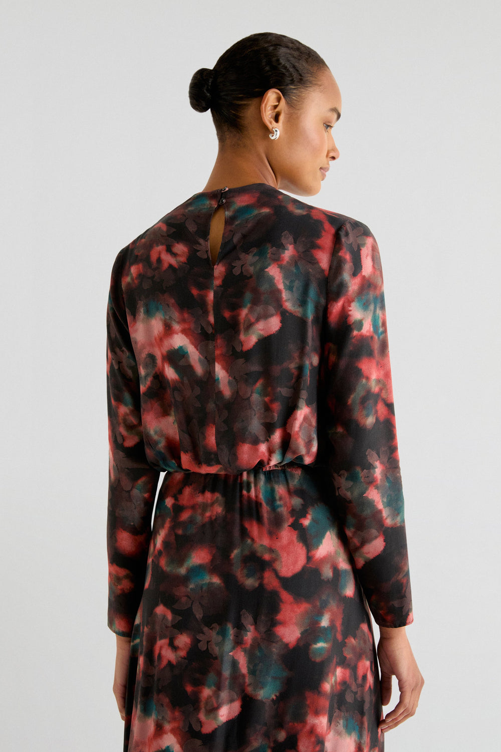 Printed blouse made of flowing fabric. Cropped regular fit, slightly high neck with draped detail and back button fastening. Long sleeves and hem with elasticated trims.