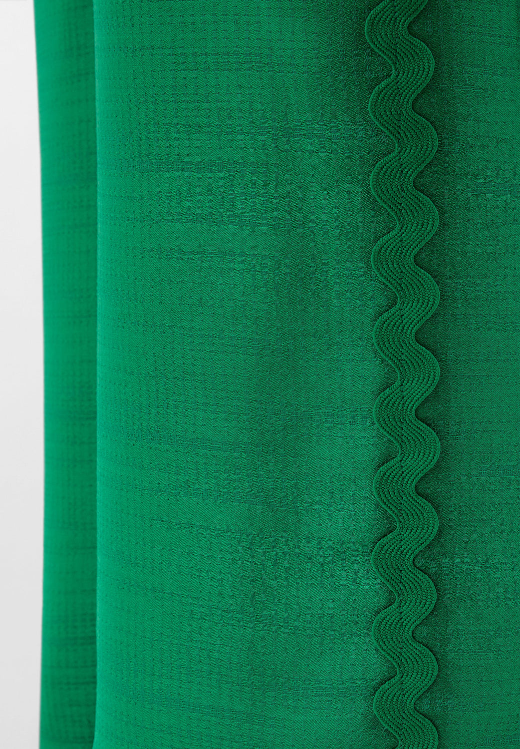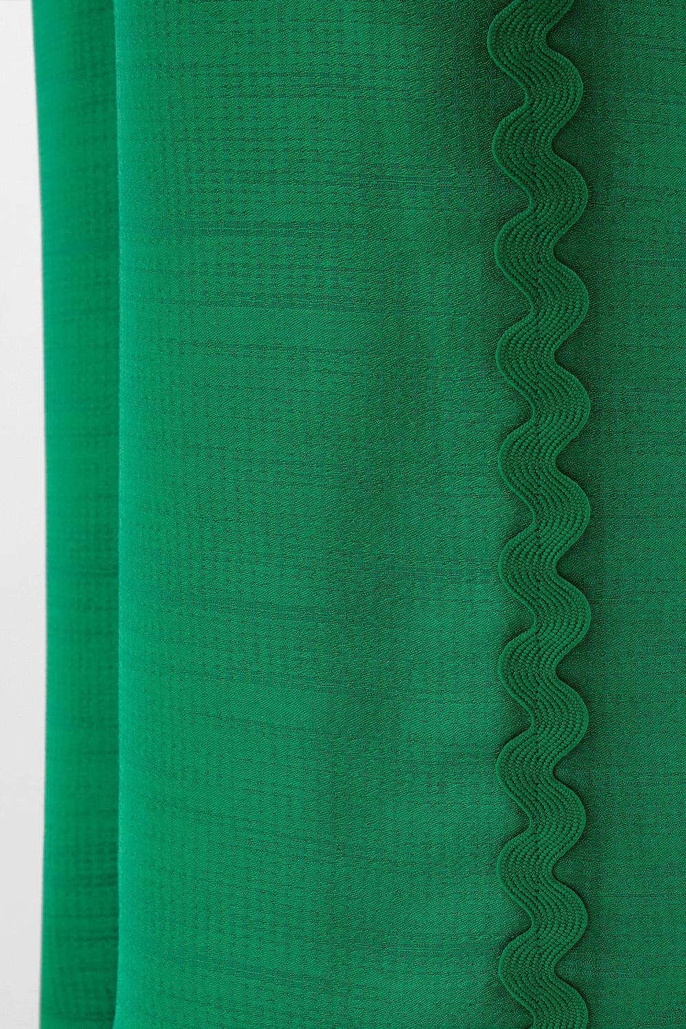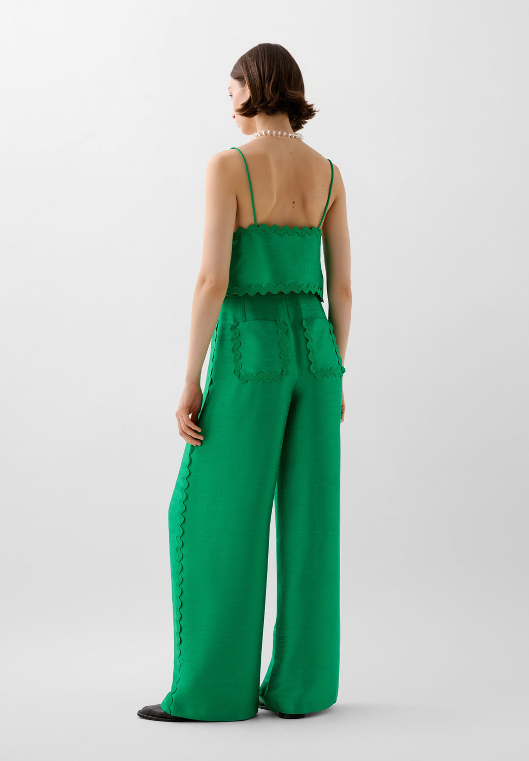Trousers made of slightly satiny fabric. Regular fit, full length with high rise. Zip and snap button fastening. Back patch pockets and scalloped detail on the side and pockets.