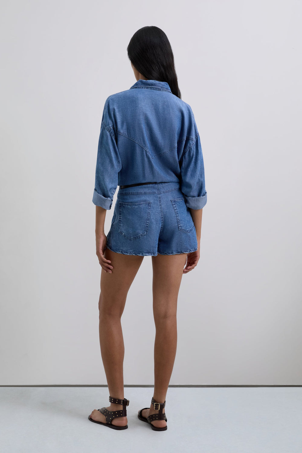 Playsuit in a loose-fitting denim-effect fabric. Shirt collar. Long sleeves. Button fastening. Front and back pockets.