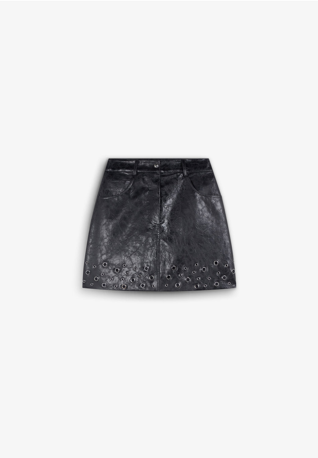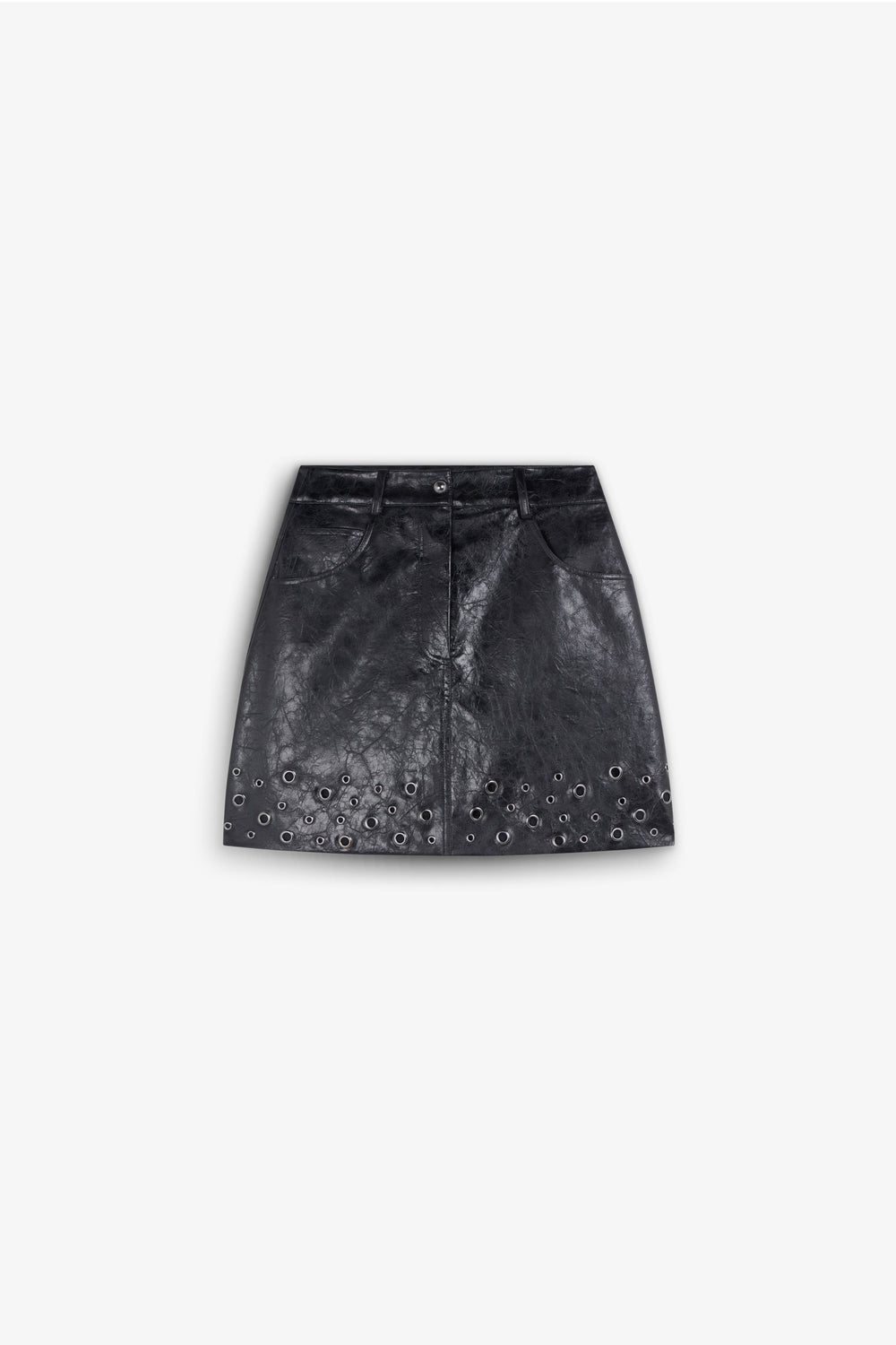 Mini skirt made of waxed fabric. Slim fit, button and zip fastening and side and back pockets. Belt loops at the waist and eyelets at the hem.