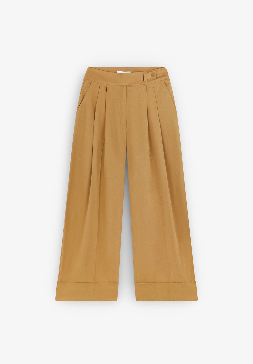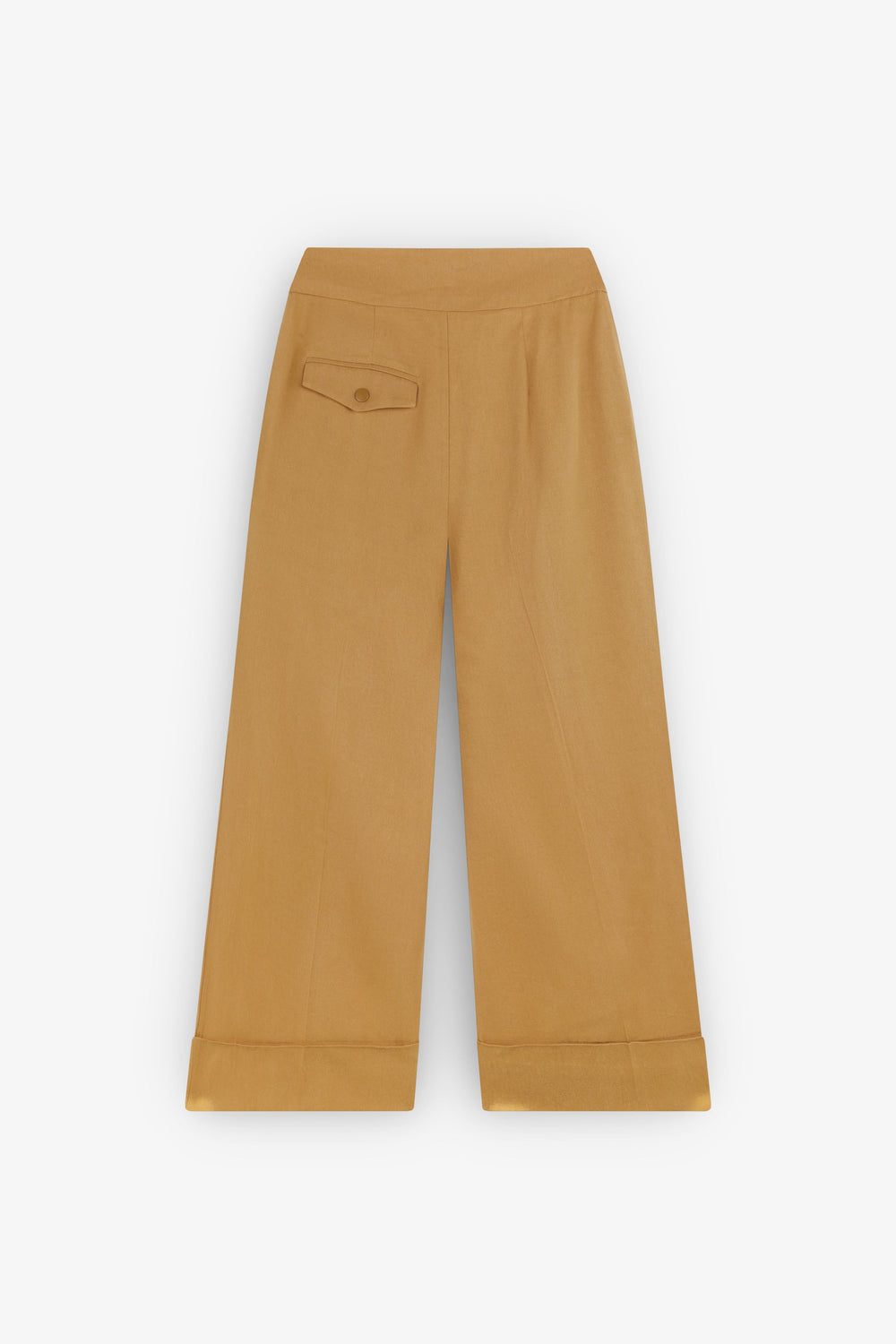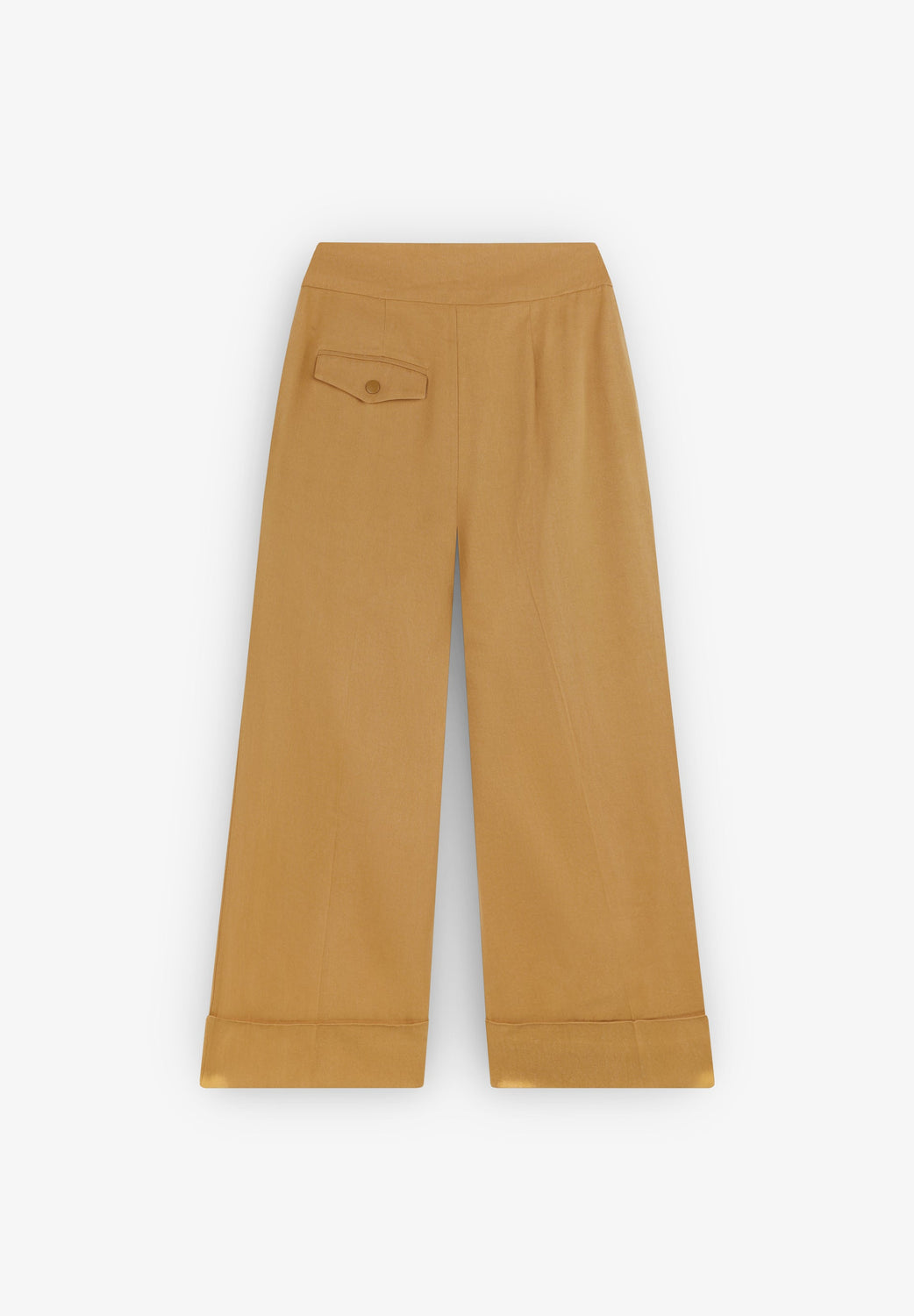 Trousers made of cotton. Designed with a wide, loose-fit from hip to ankle. High waist. Button fastening at waist. Two side pockets. One pocket on the back with button fastening. Double dart detail on the front. Turn-ups.