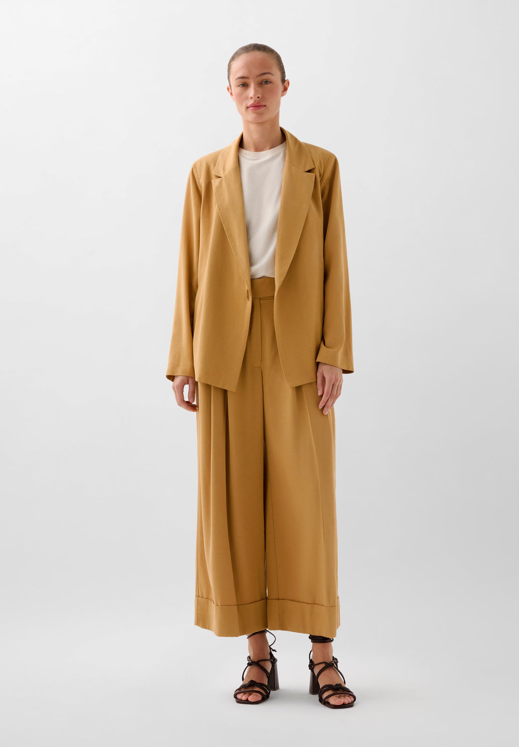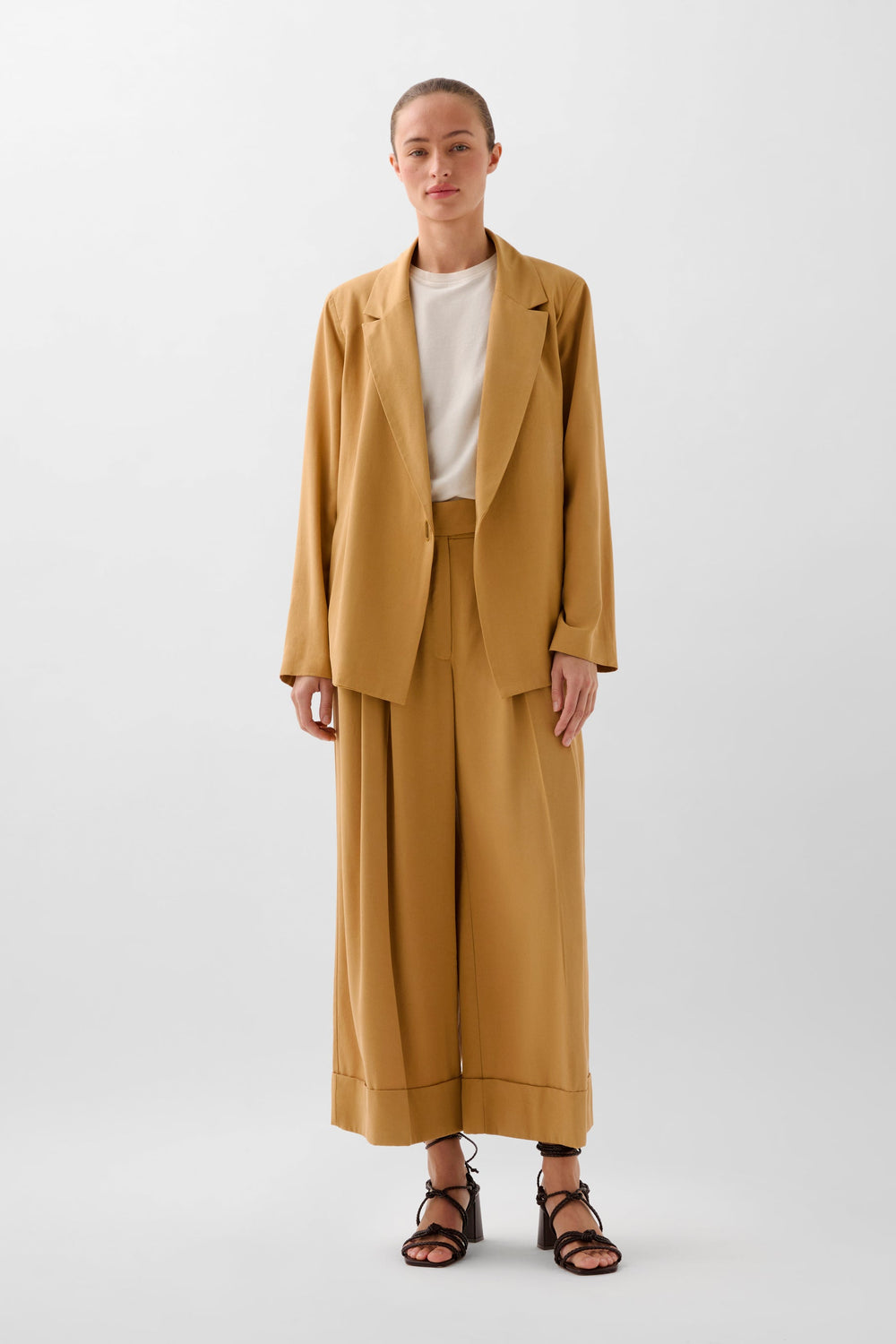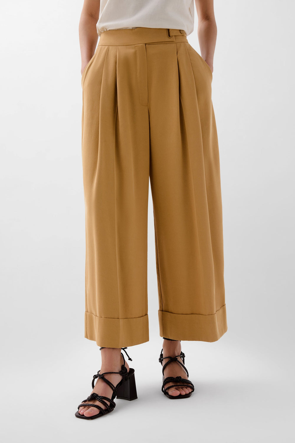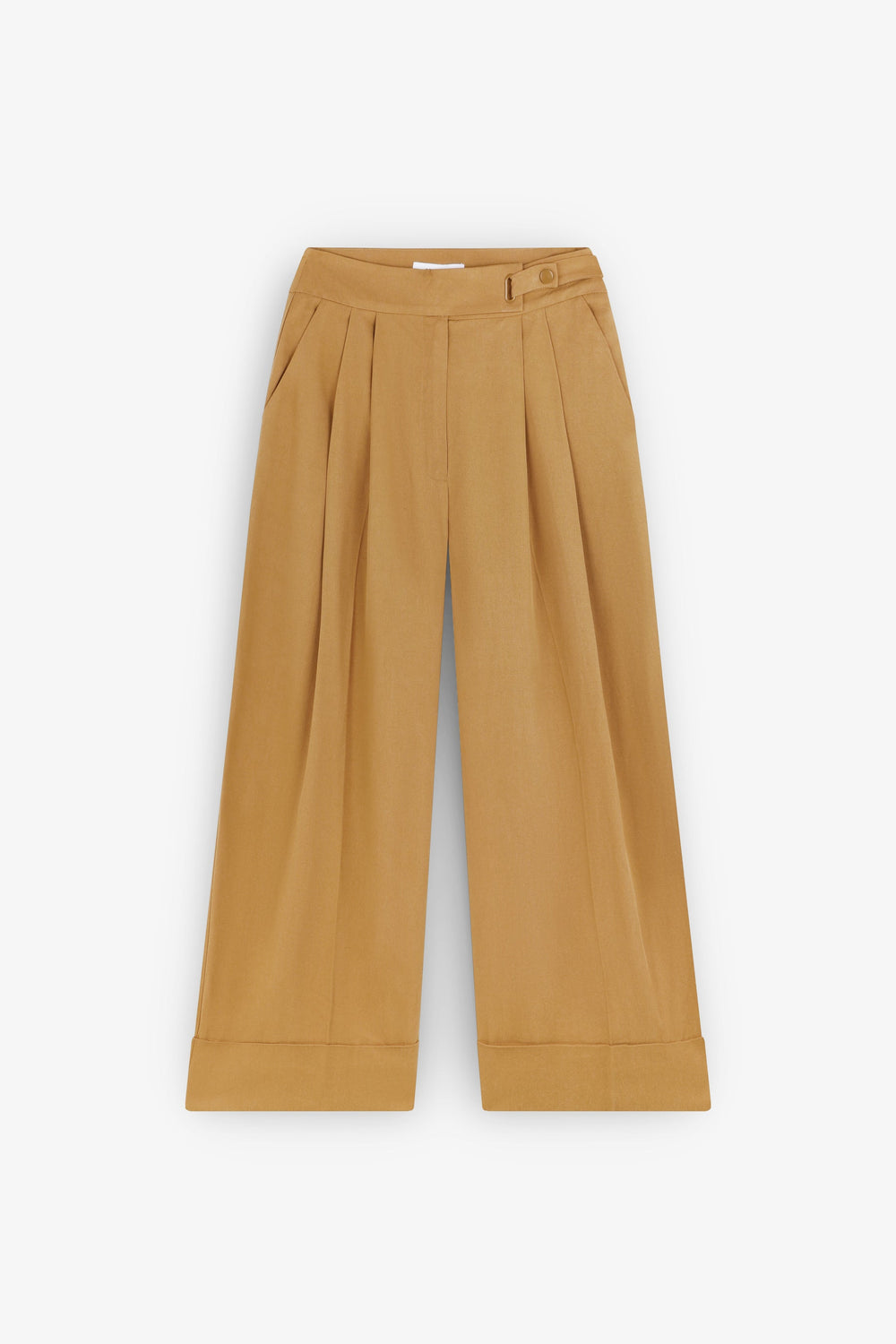 Trousers made of cotton. Designed with a wide, loose-fit from hip to ankle. High waist. Button fastening at waist. Two side pockets. One pocket on the back with button fastening. Double dart detail on the front. Turn-ups.