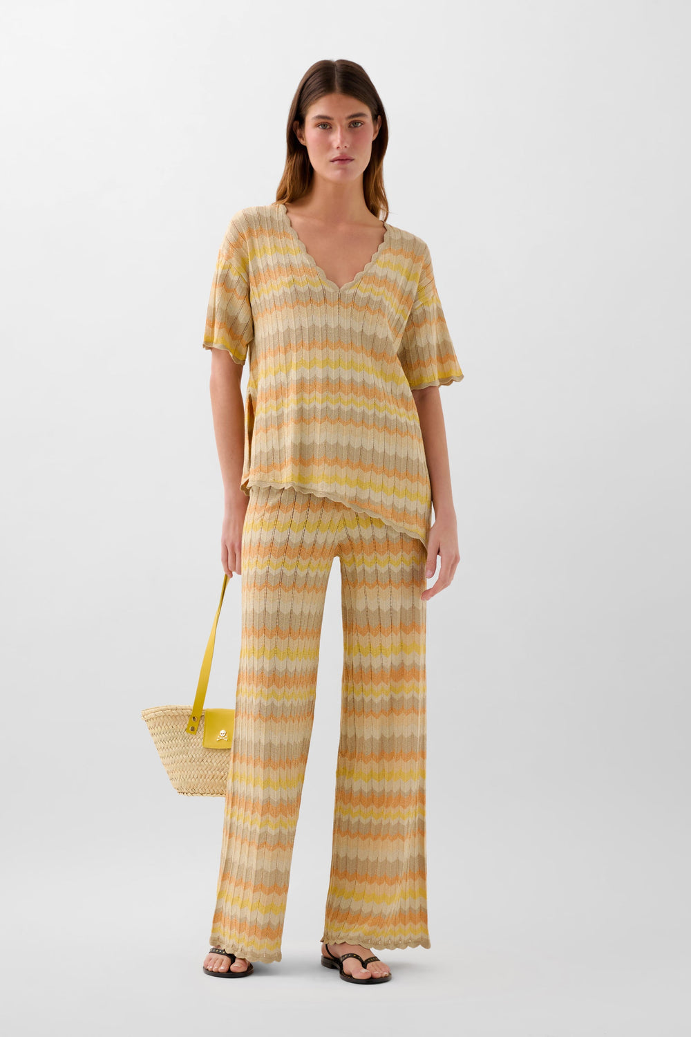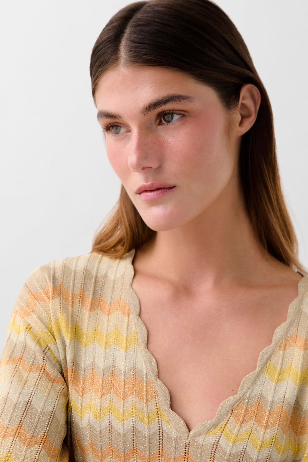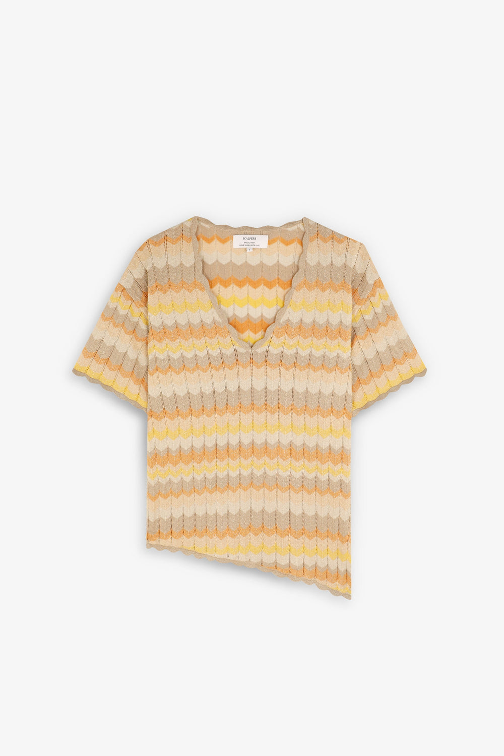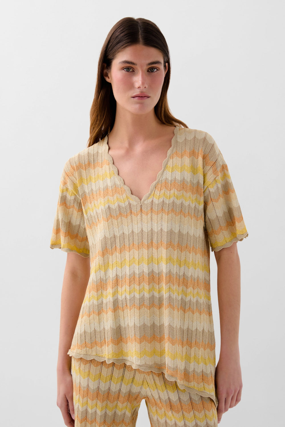 Knit sweater with die-cut details. Made of a nylon blend with metallic yarn details. Regular fit. Polo shirt collar. V-neck. Short sleeve.