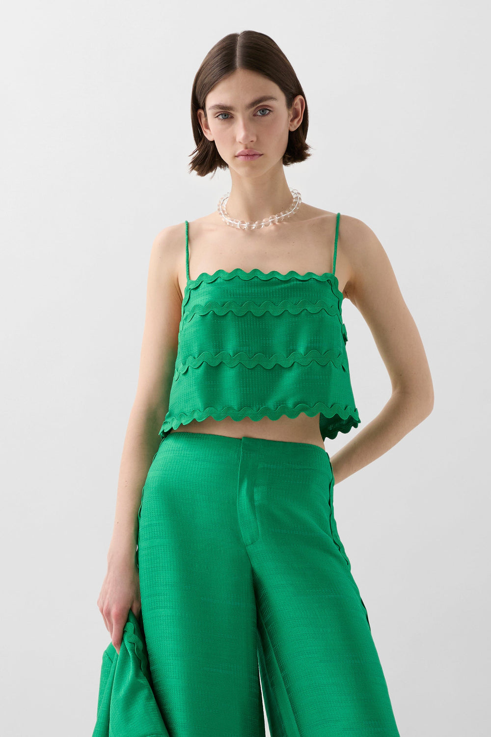 Top made of satin fabric with waved detail. Cropped cut with thin straps.