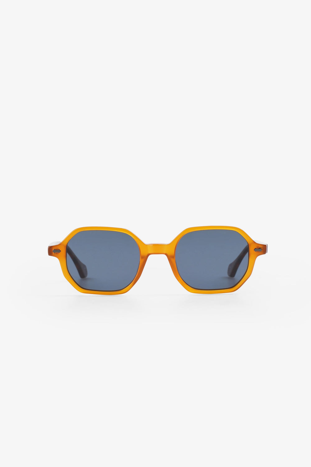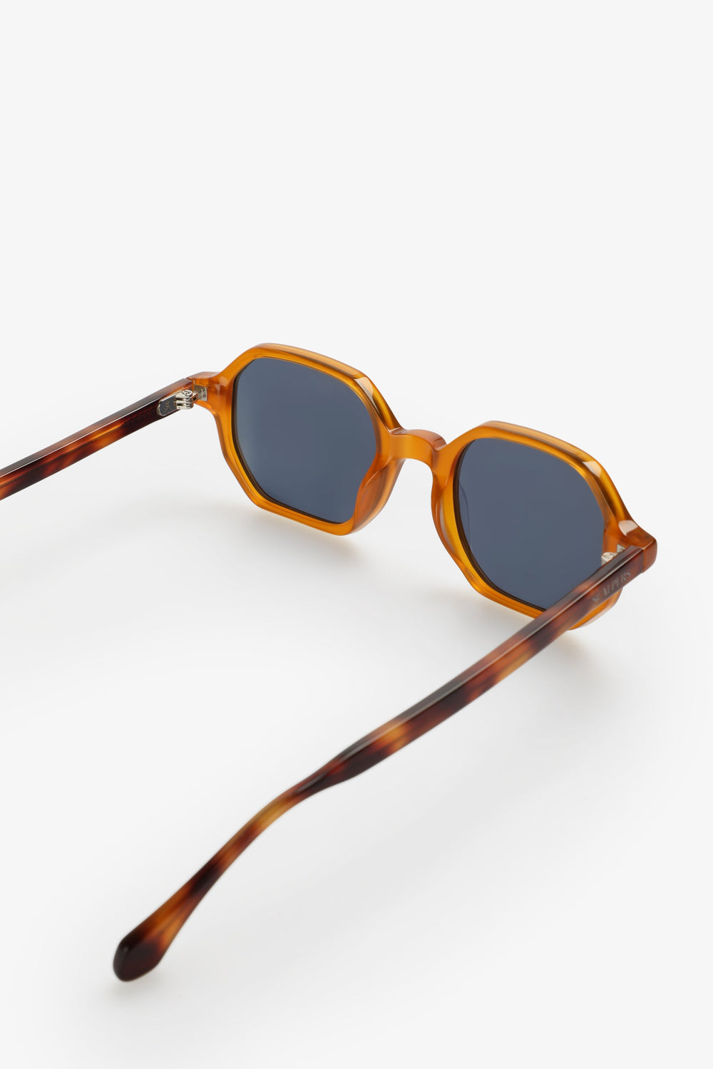 Sunglasses with square frames and horseshoe bridge. Made in mustard acetate on the front and grey pattern on the temple. Polarised lenses. The metal logo on the temple stands out.