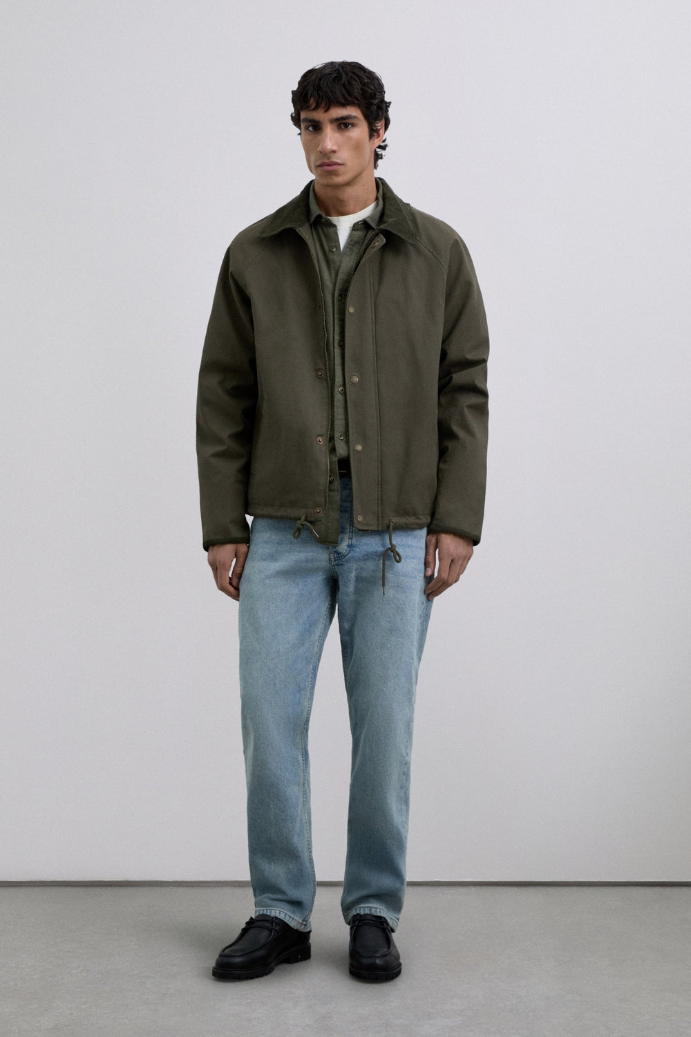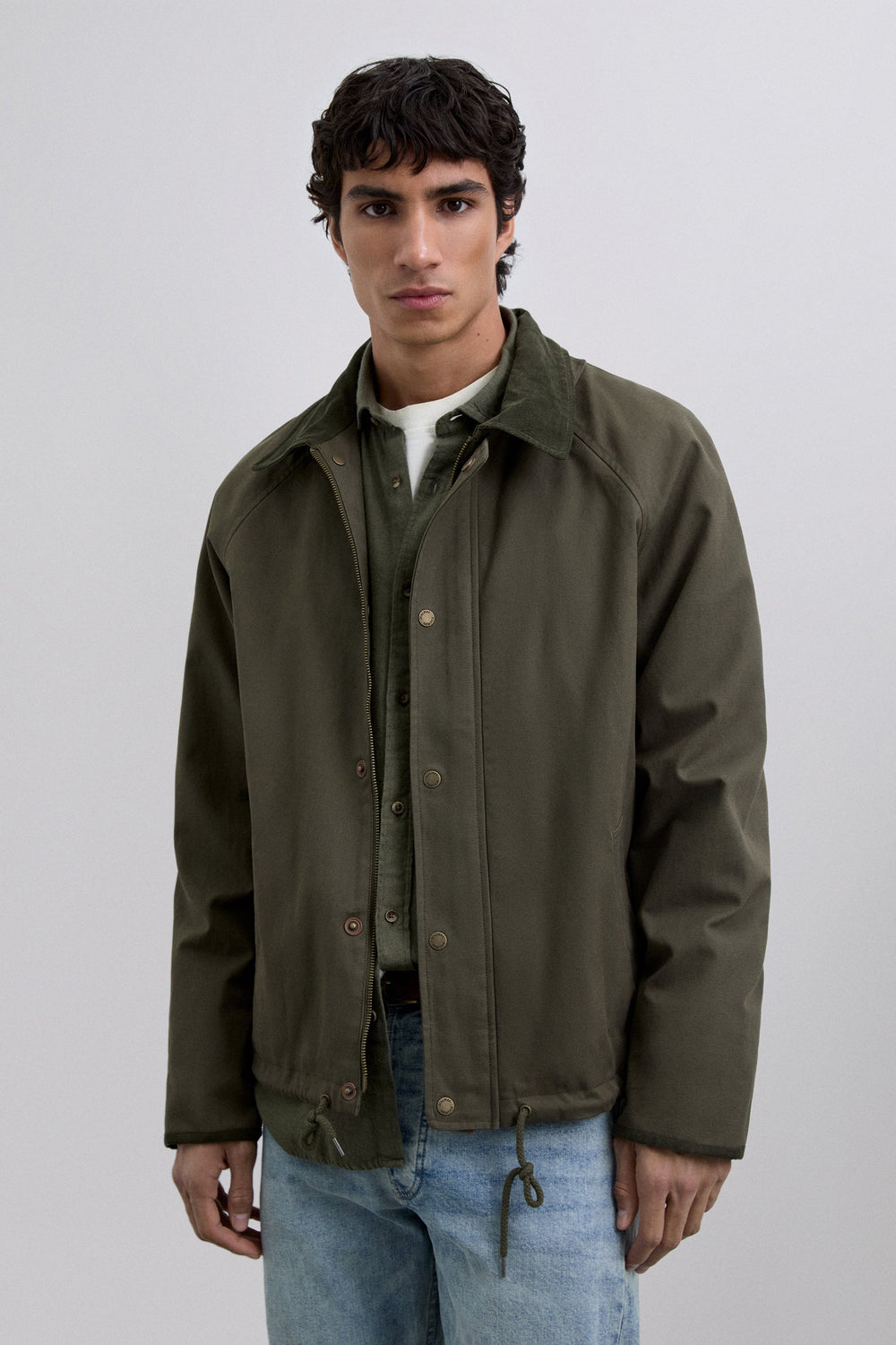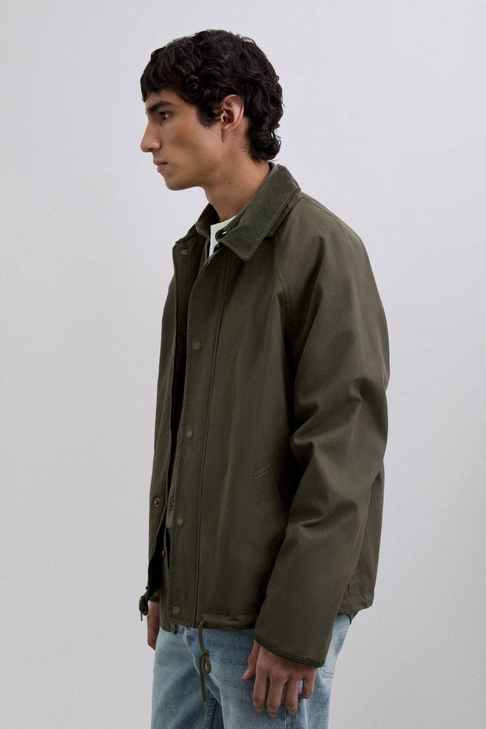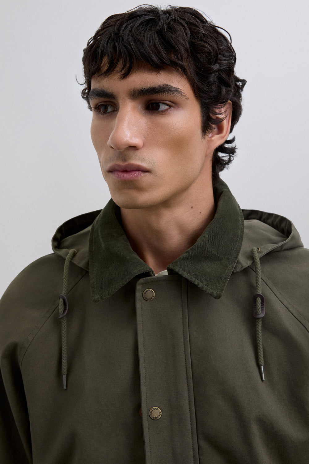 Jacket made of 100% BCI cotton. Adjustable and detachable hood. Zip and button fastening. Ribbed inner cuffs. The piped seam of the sleeve and collar are made of corduroy. Raglan sleeves. Two front pockets. Logo details on zip.
