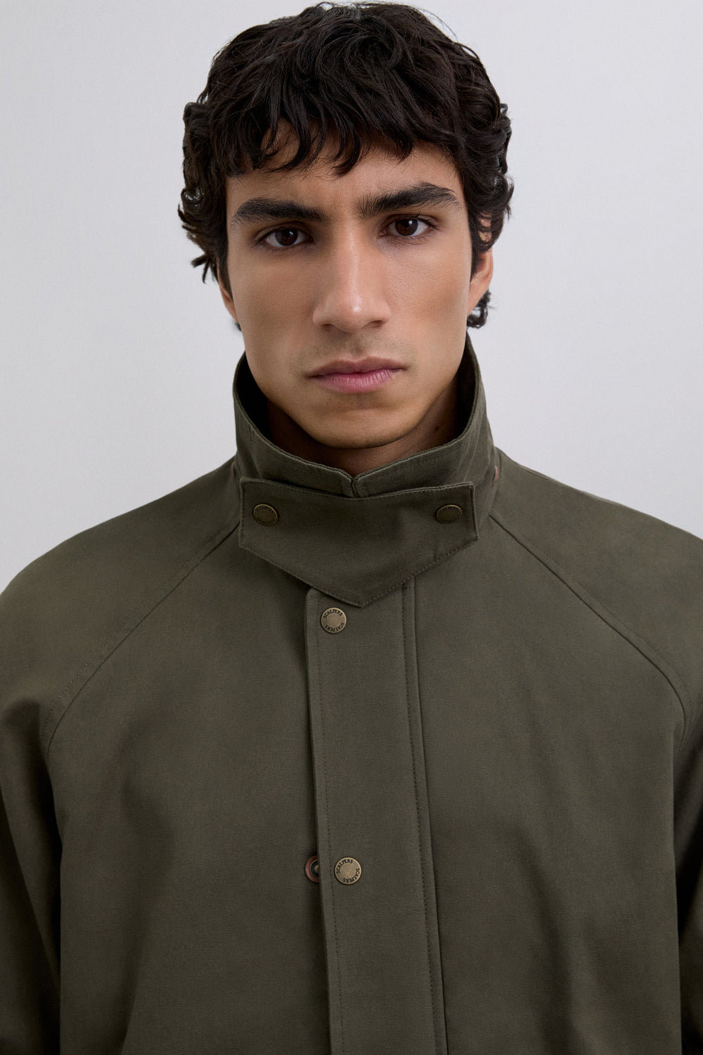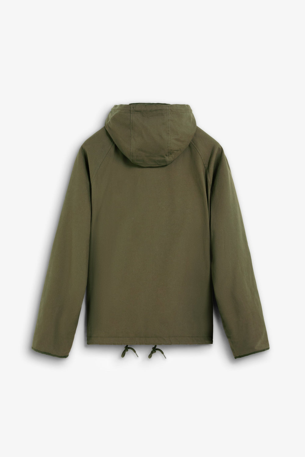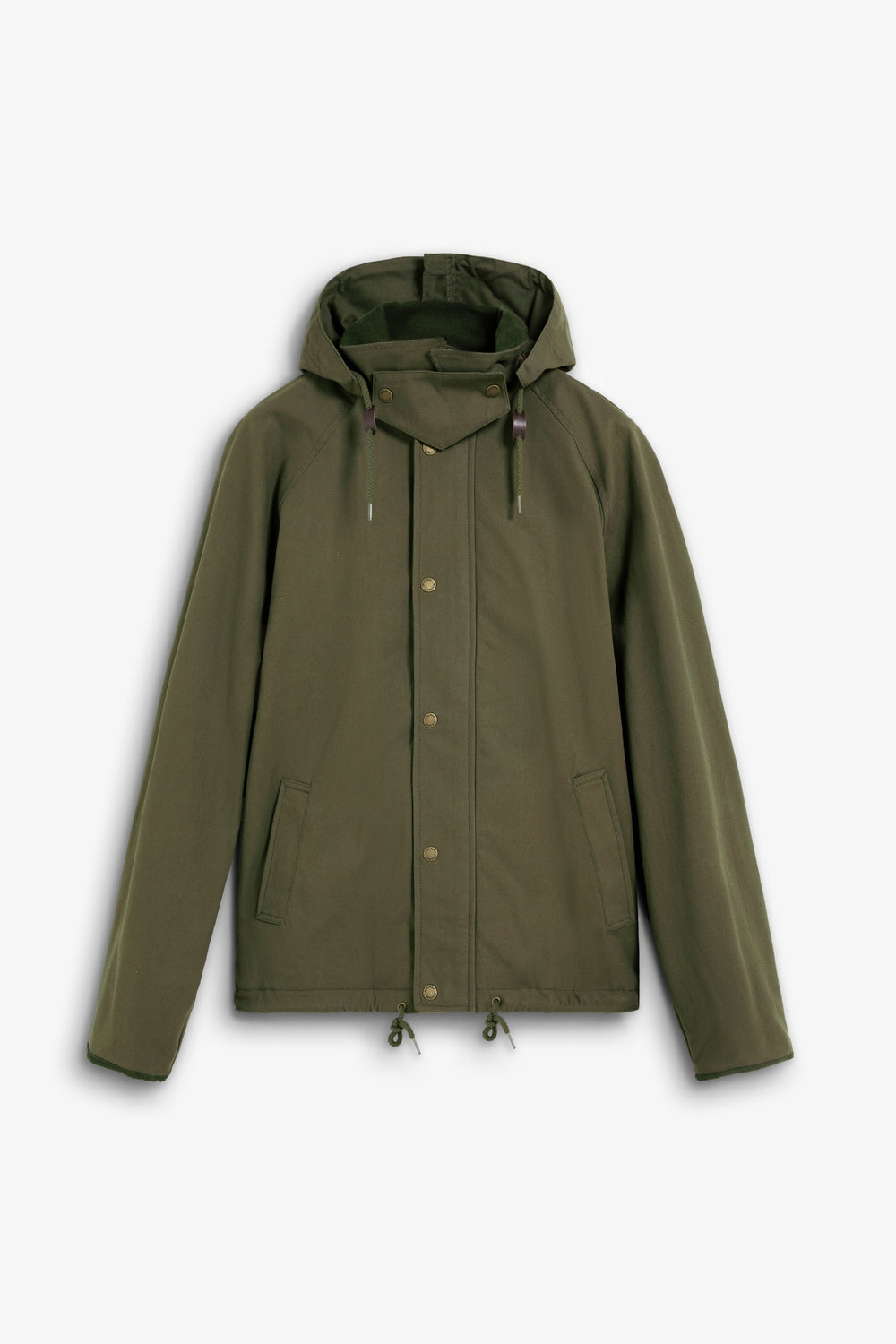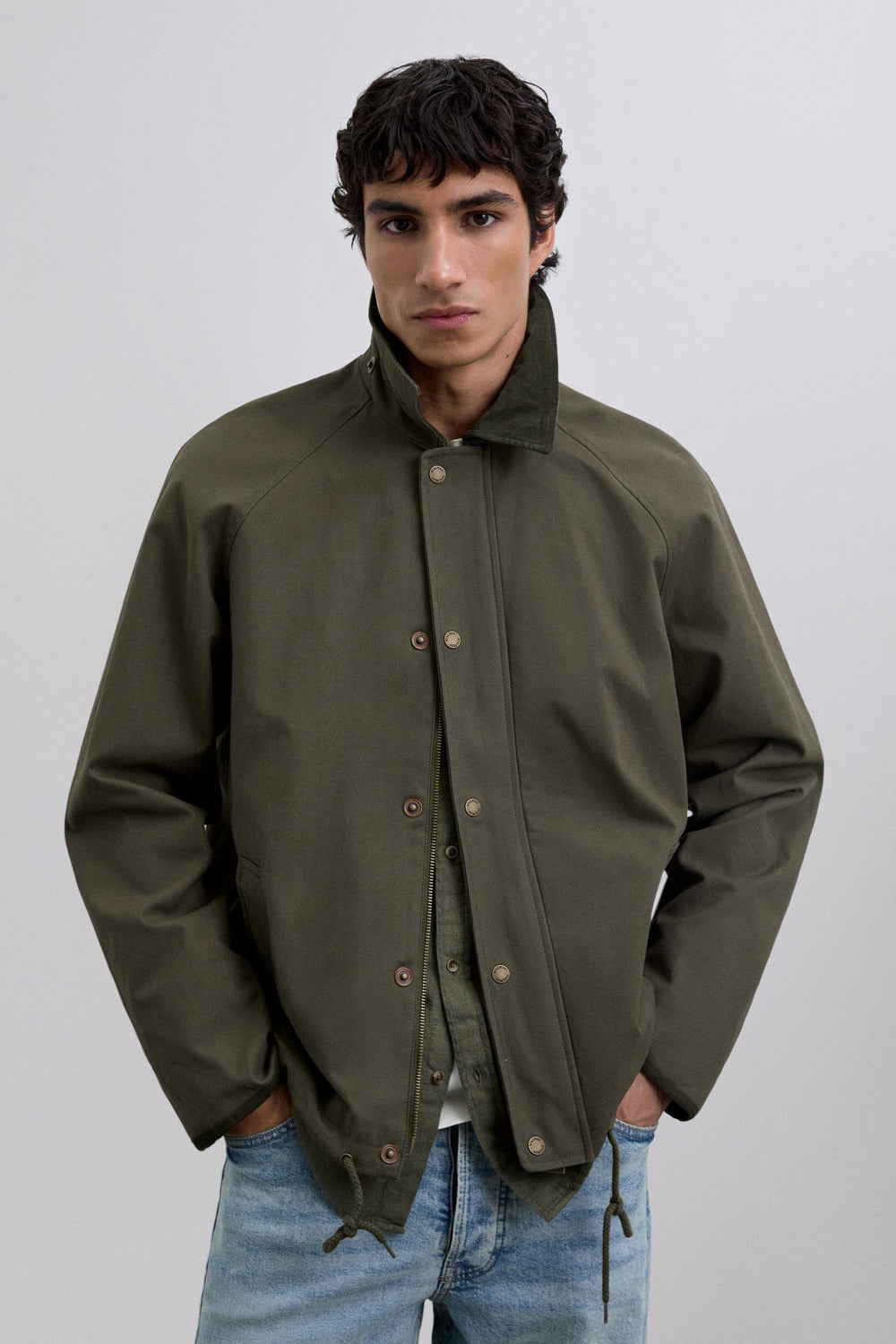 Jacket made of 100% BCI cotton. Adjustable and detachable hood. Zip and button fastening. Ribbed inner cuffs. The piped seam of the sleeve and collar are made of corduroy. Raglan sleeves. Two front pockets. Logo details on zip.