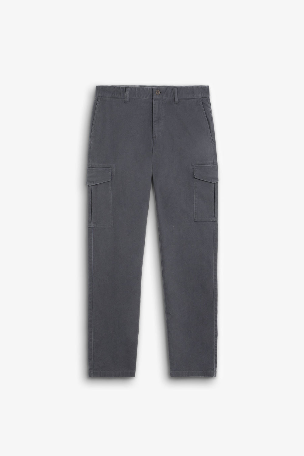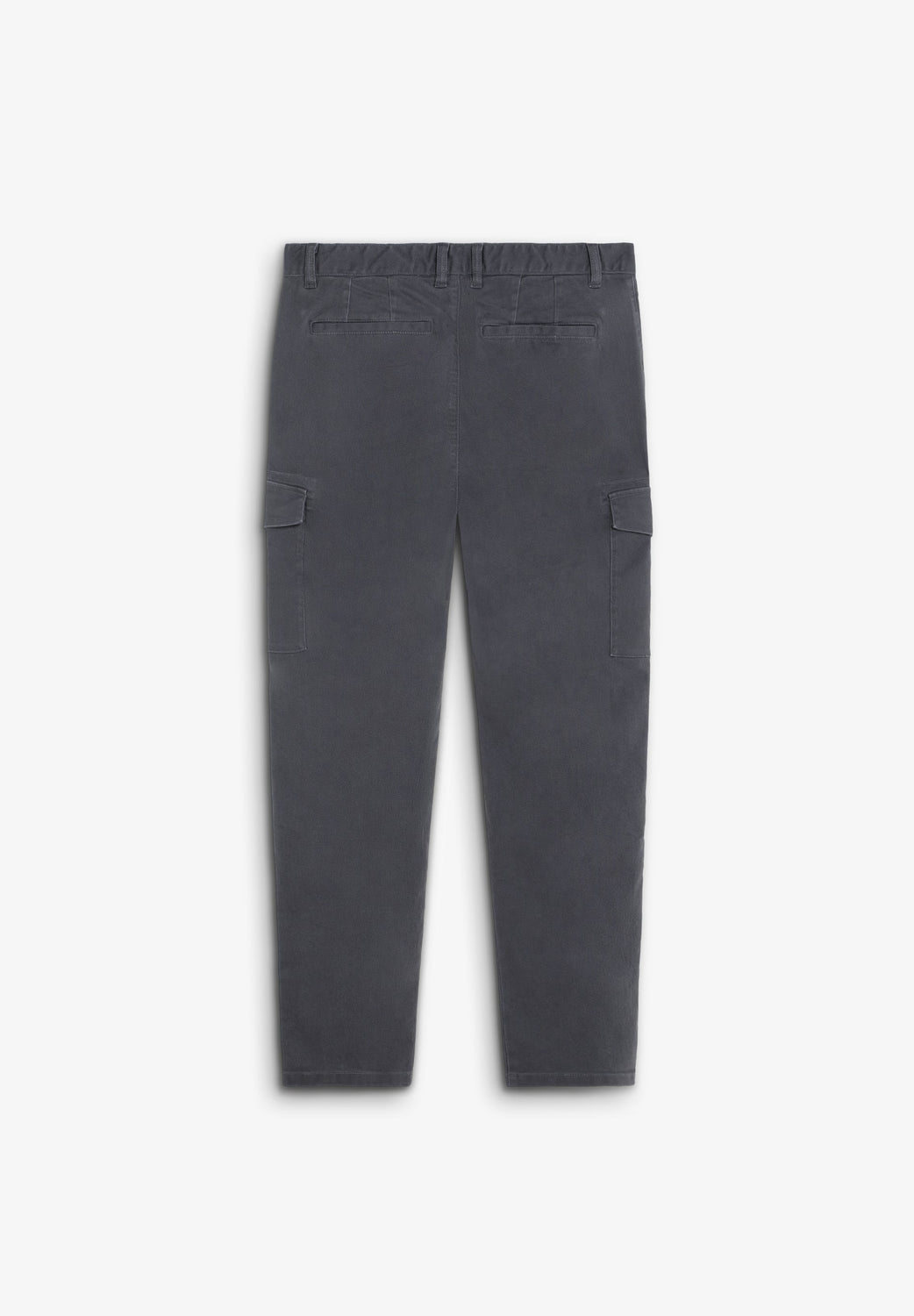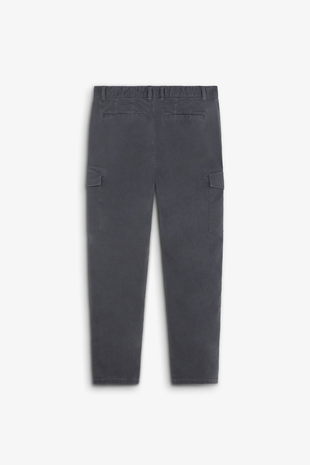 Cargo trousers made of stretch cotton fabric. Cropped fit. Front pockets and back pockets with piped seam detail. Patch pockets with flaps on leg cuffs. Front zip and button fastening.