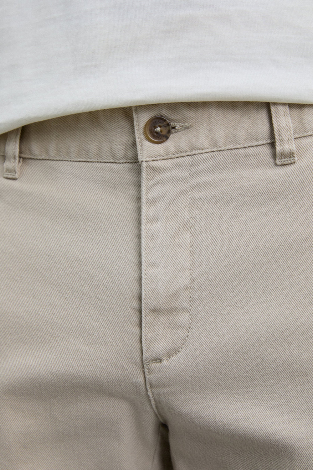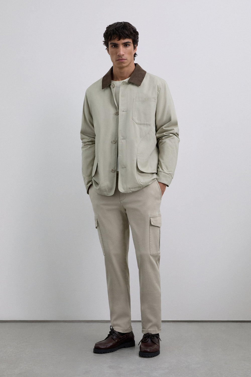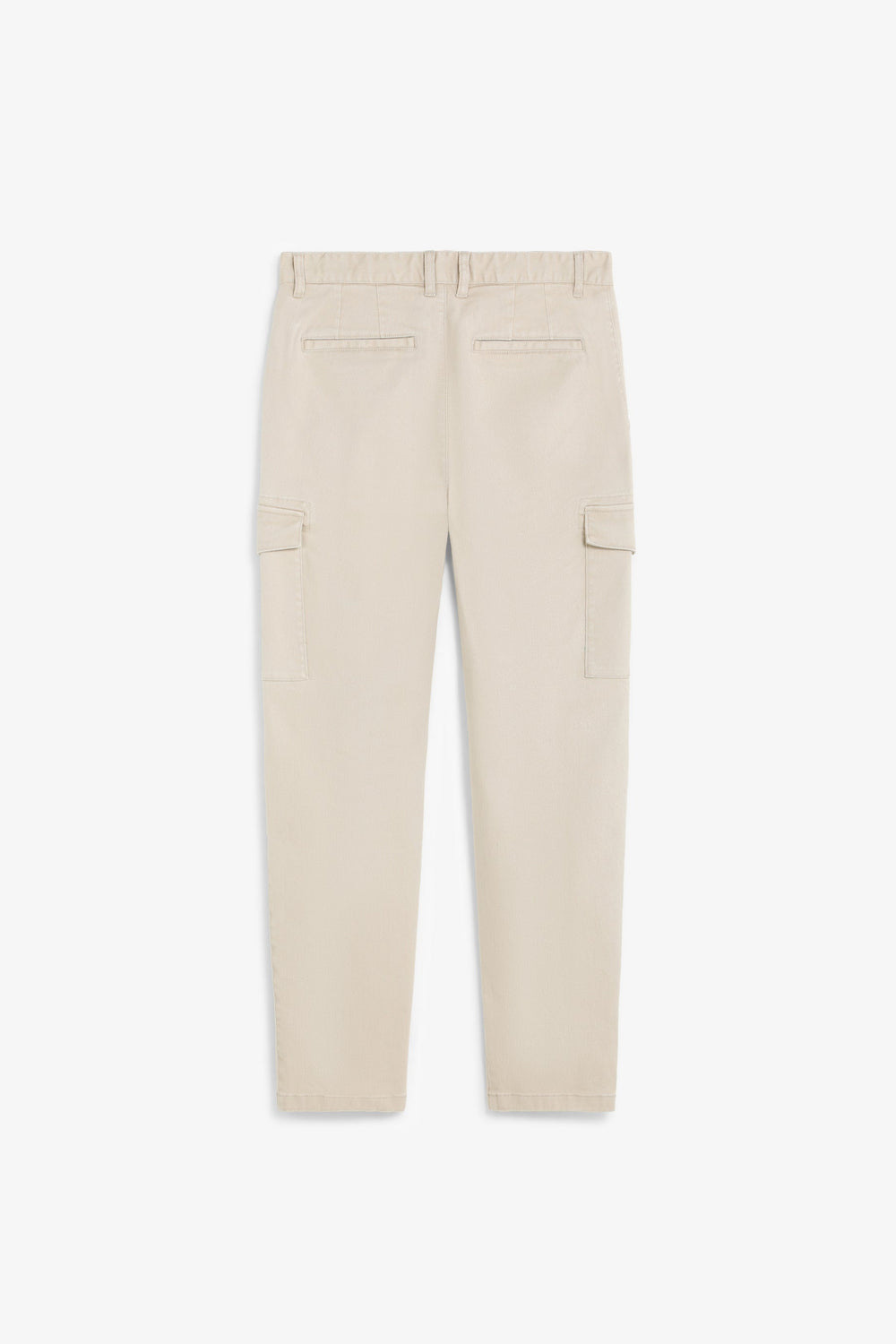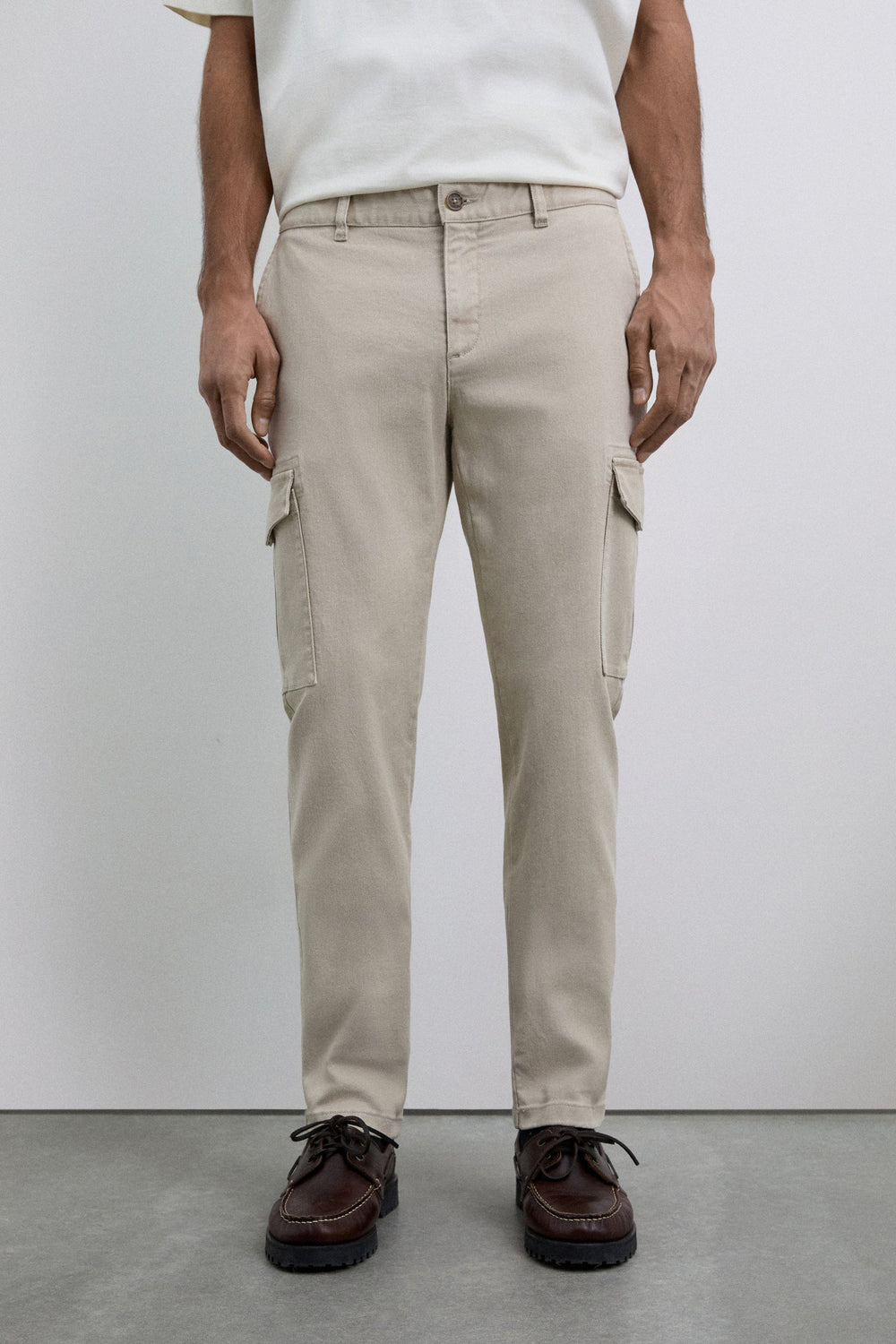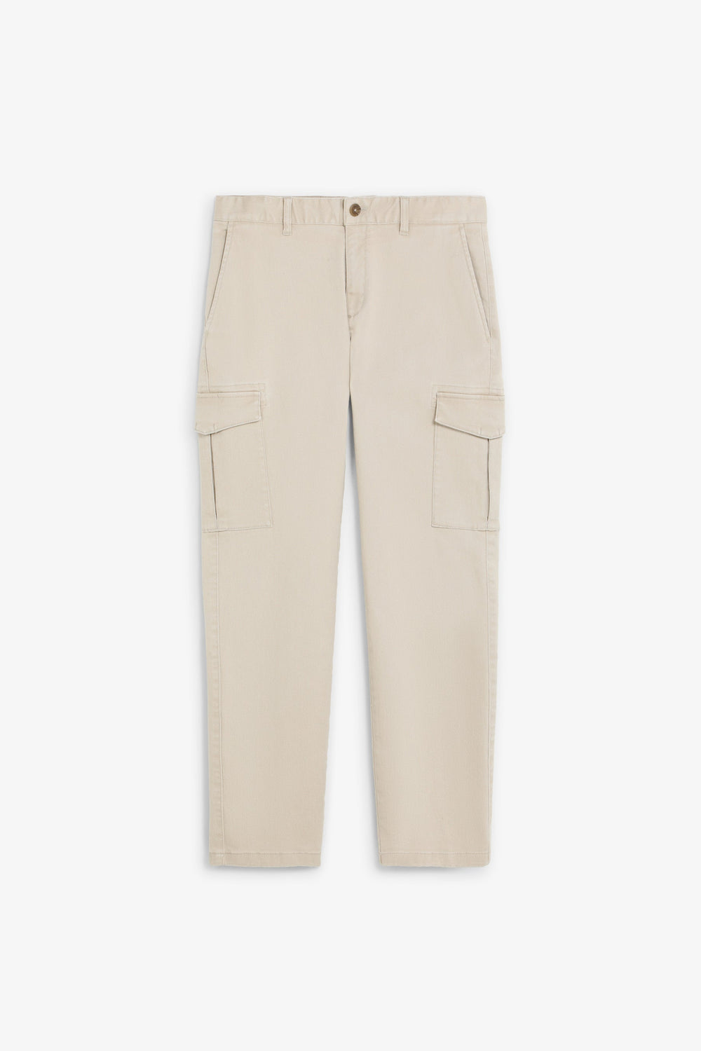 Cargo trousers made of stretch cotton fabric. Cropped fit. Front pockets and back pockets with piped seam detail. Patch pockets with flaps on leg cuffs. Front zip and button fastening.