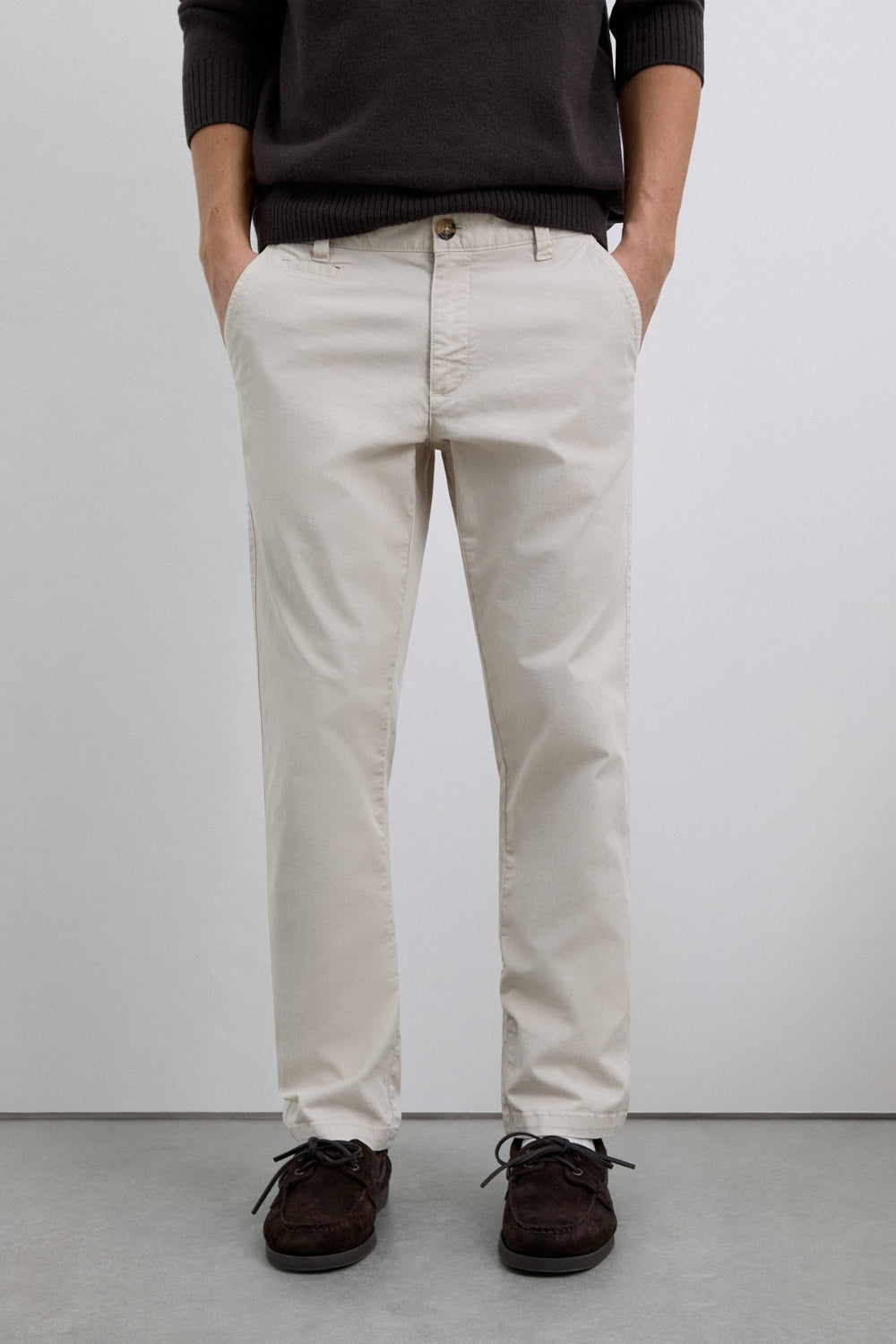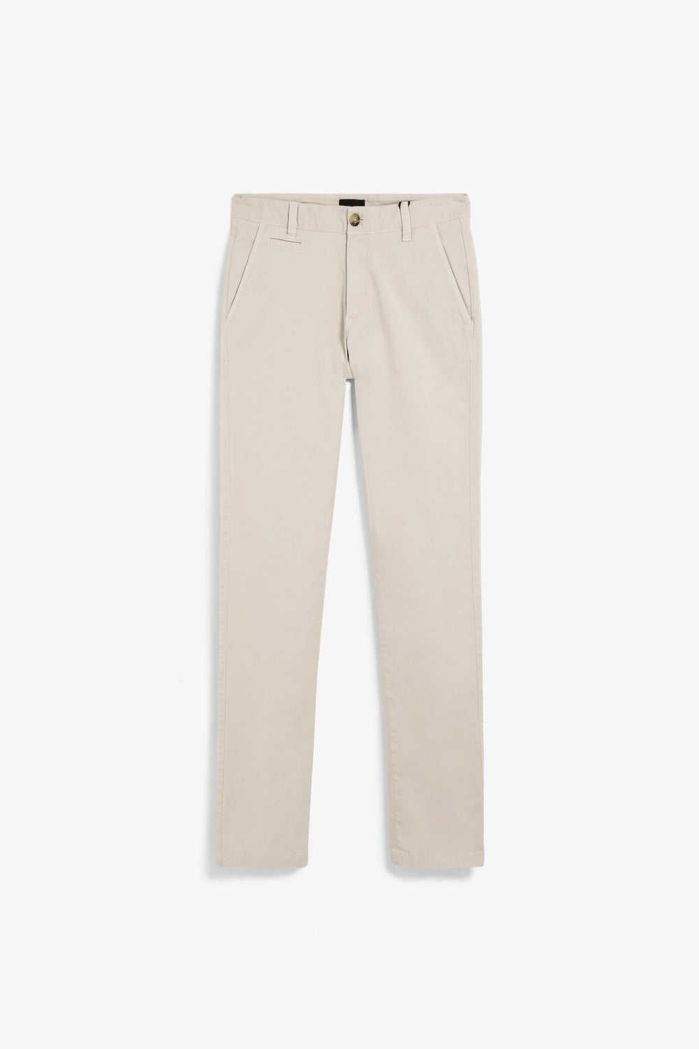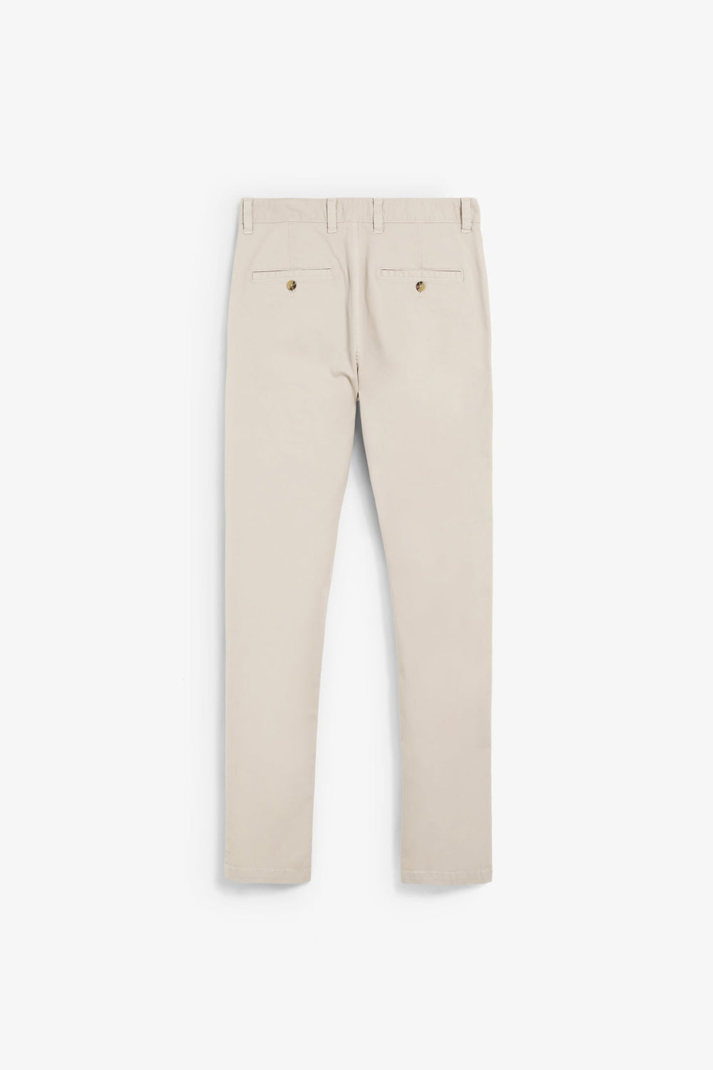 Casual chino trousers made of slightly stretch cotton blend fabric. Button and zip fastening. Side and back pockets. Belt loops at the waist. Inner logo label detail on the belt.