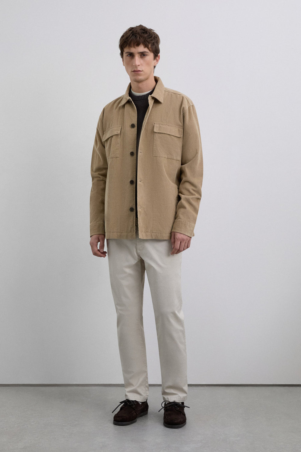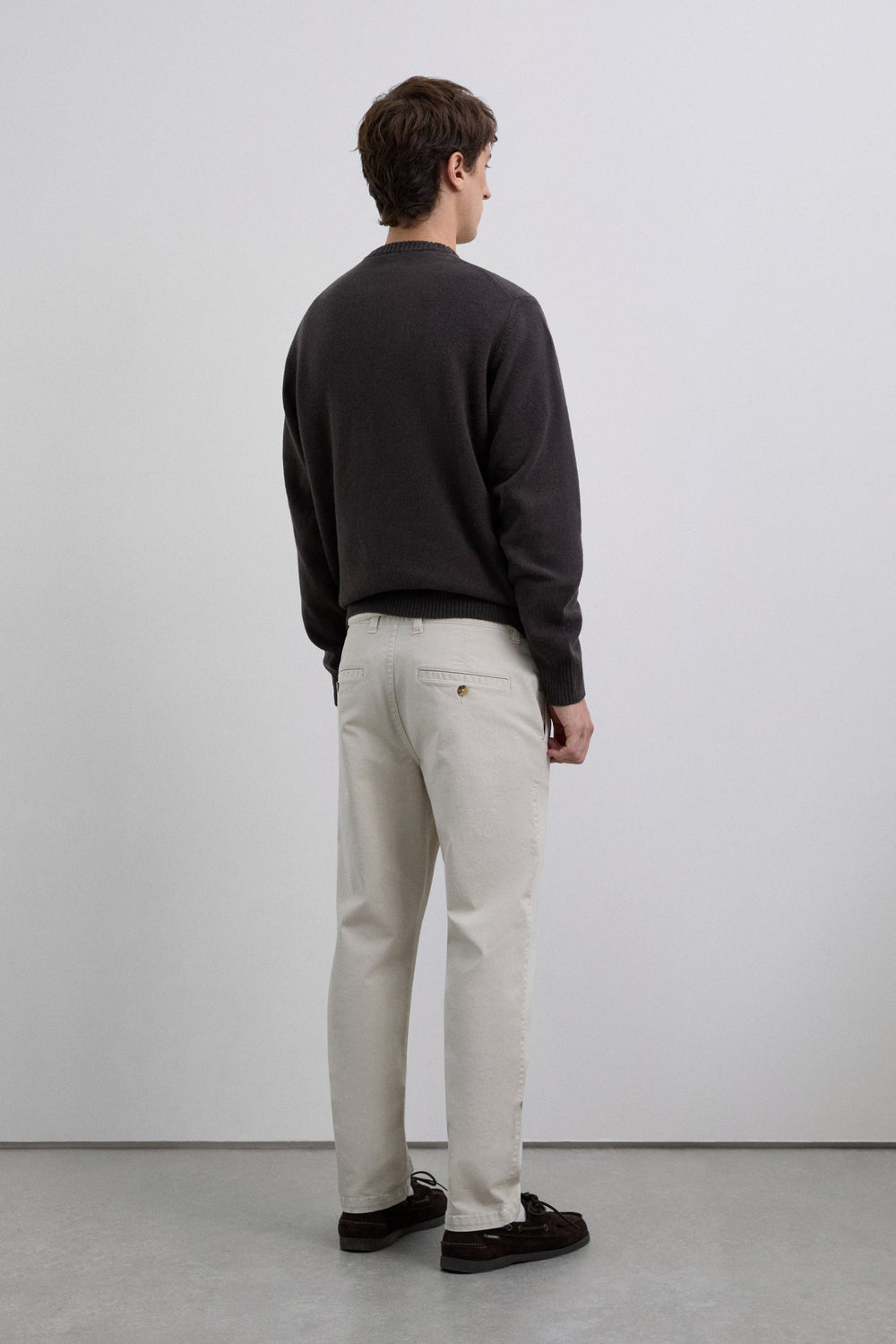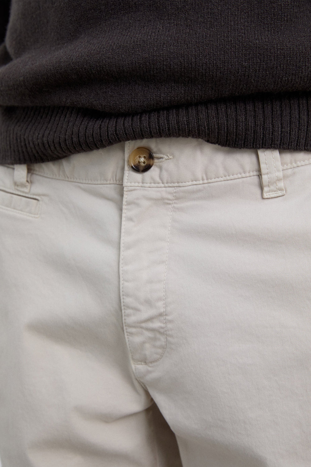 Casual chino trousers made of slightly stretch cotton blend fabric. Button and zip fastening. Side and back pockets. Belt loops at the waist. Inner logo label detail on the belt.