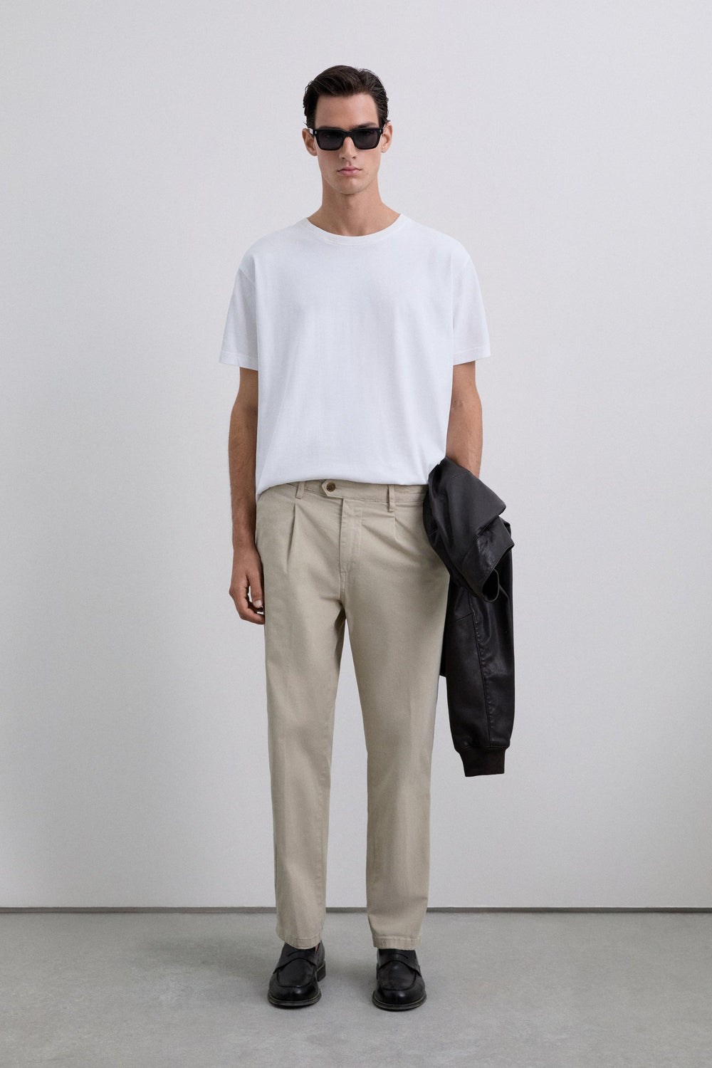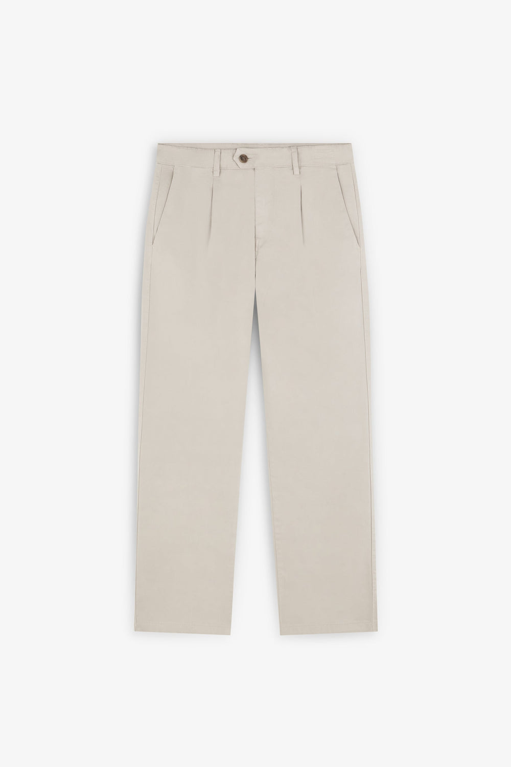 Chino trousers made of a slightly stretch cotton fabric. Loose fit with darts. Concealed zip fastening with placket and button at the waist. Side and back pockets. Belt loops.