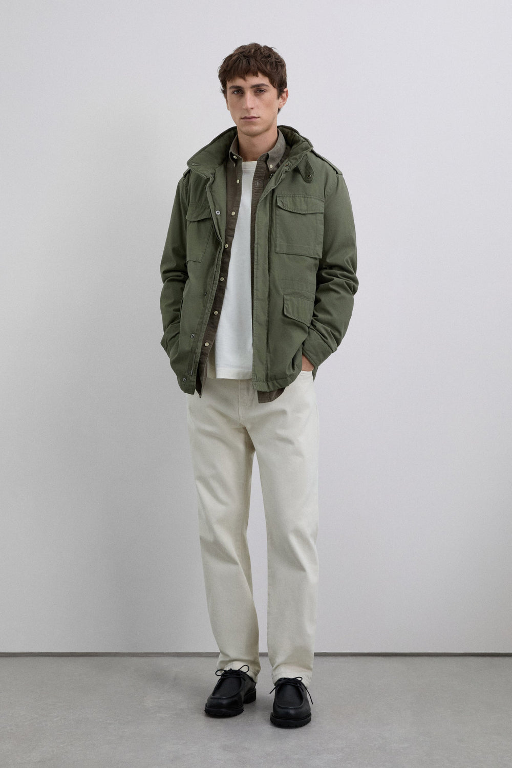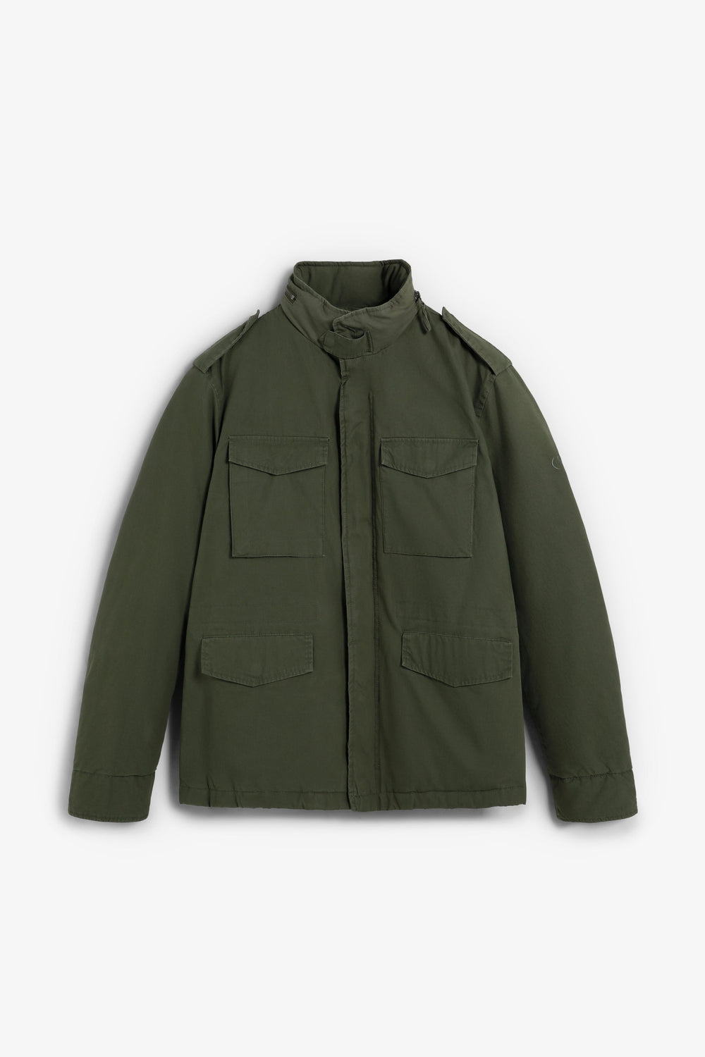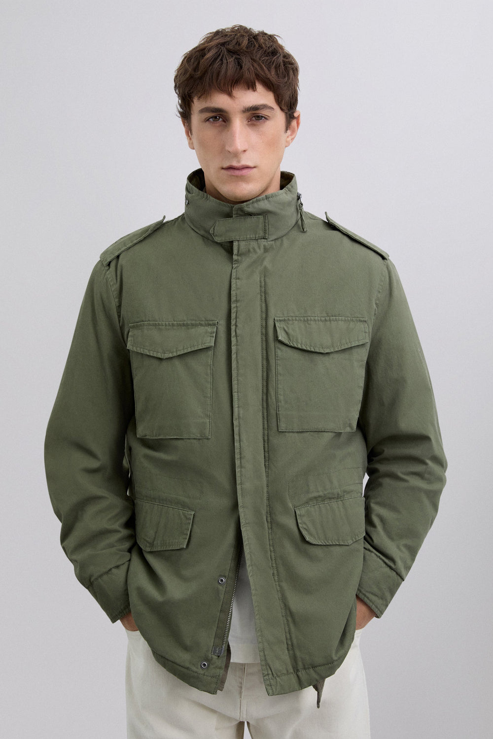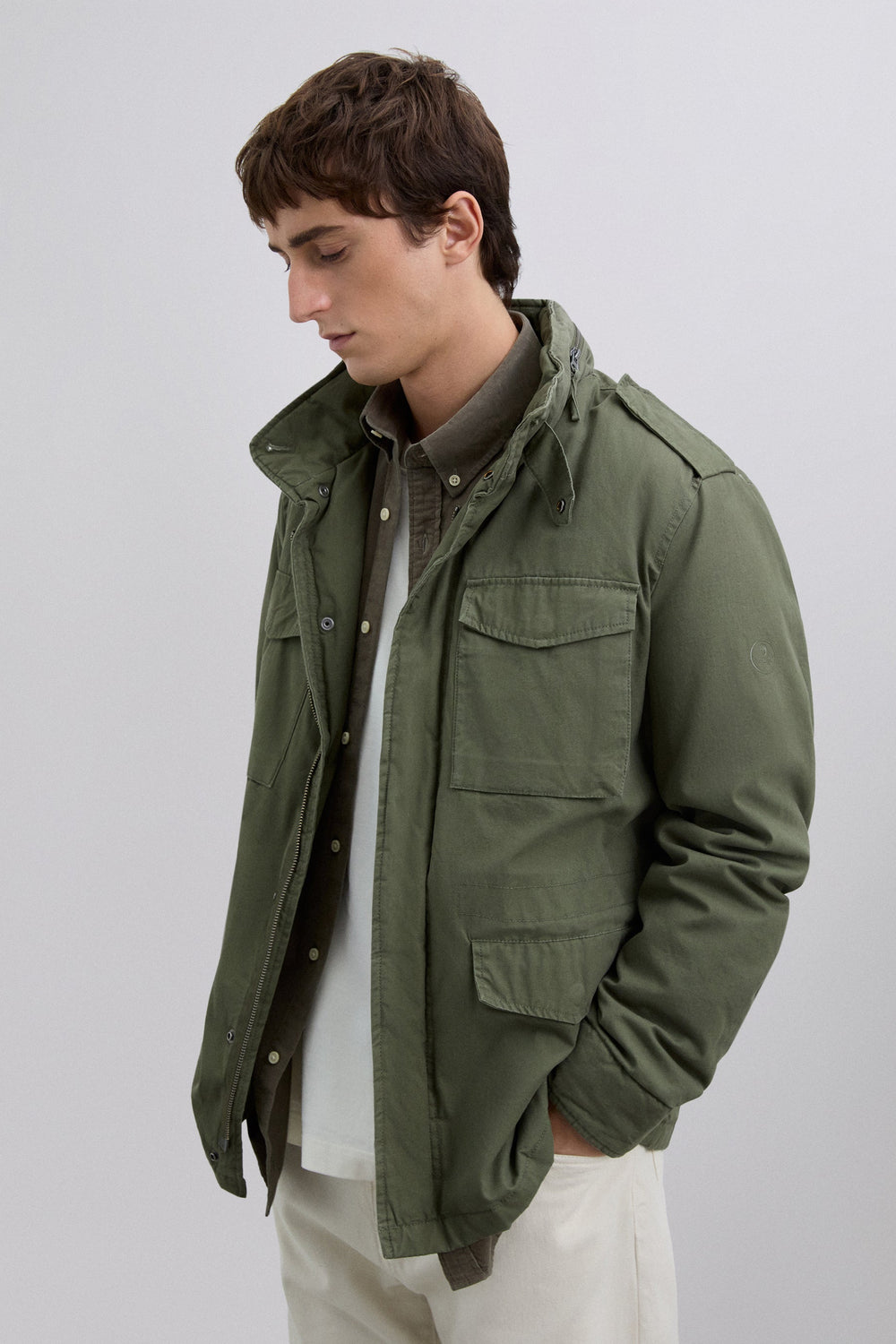Jacket made of organic cotton. Military style. Four front pockets. Fastening at the neck. Adjustable inner drawstring. Front zip fastening and contrast hood concealed in the collar. Lined with diamond print. Adjustable cuffs. High-density logo detail on the sleeve.