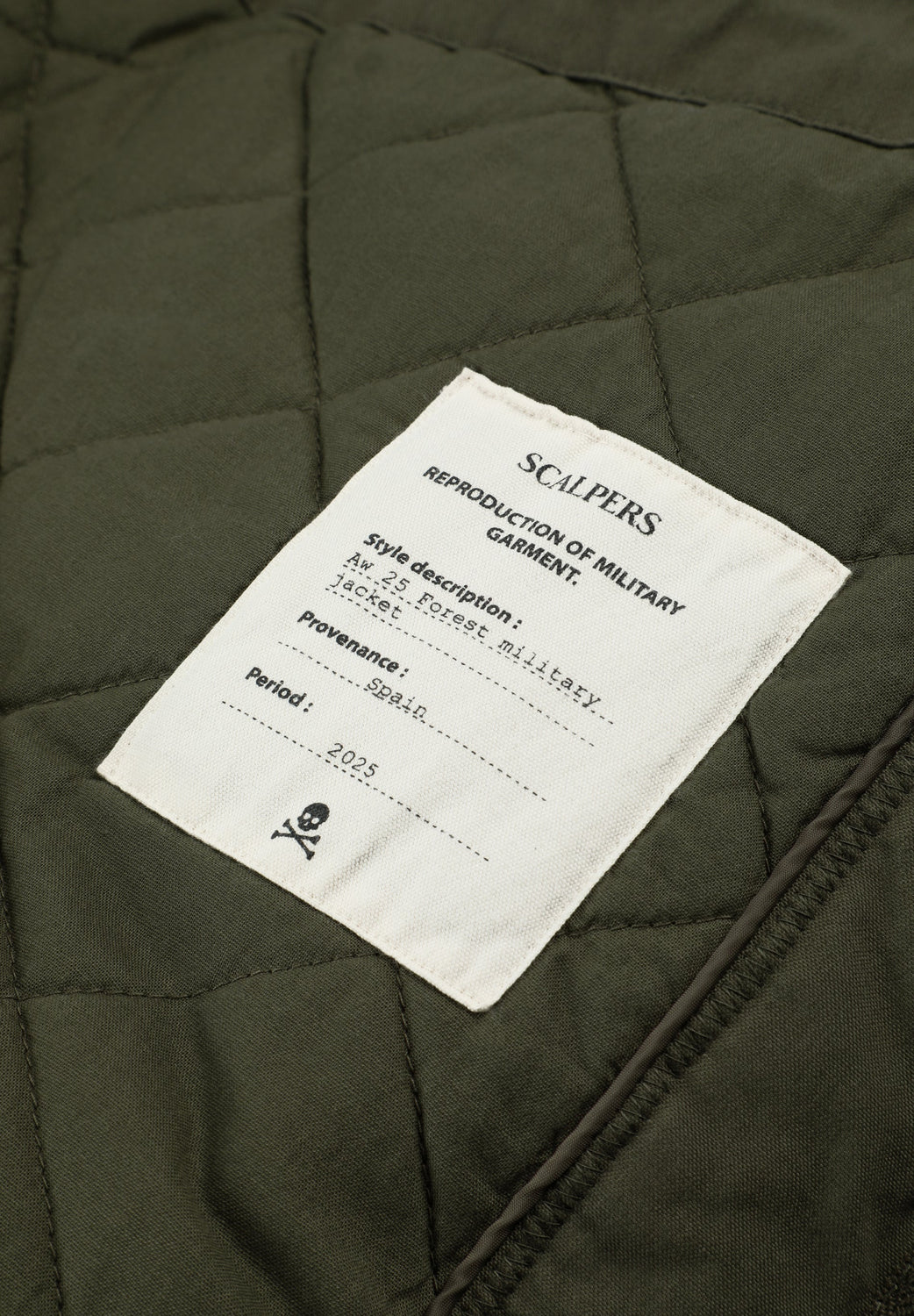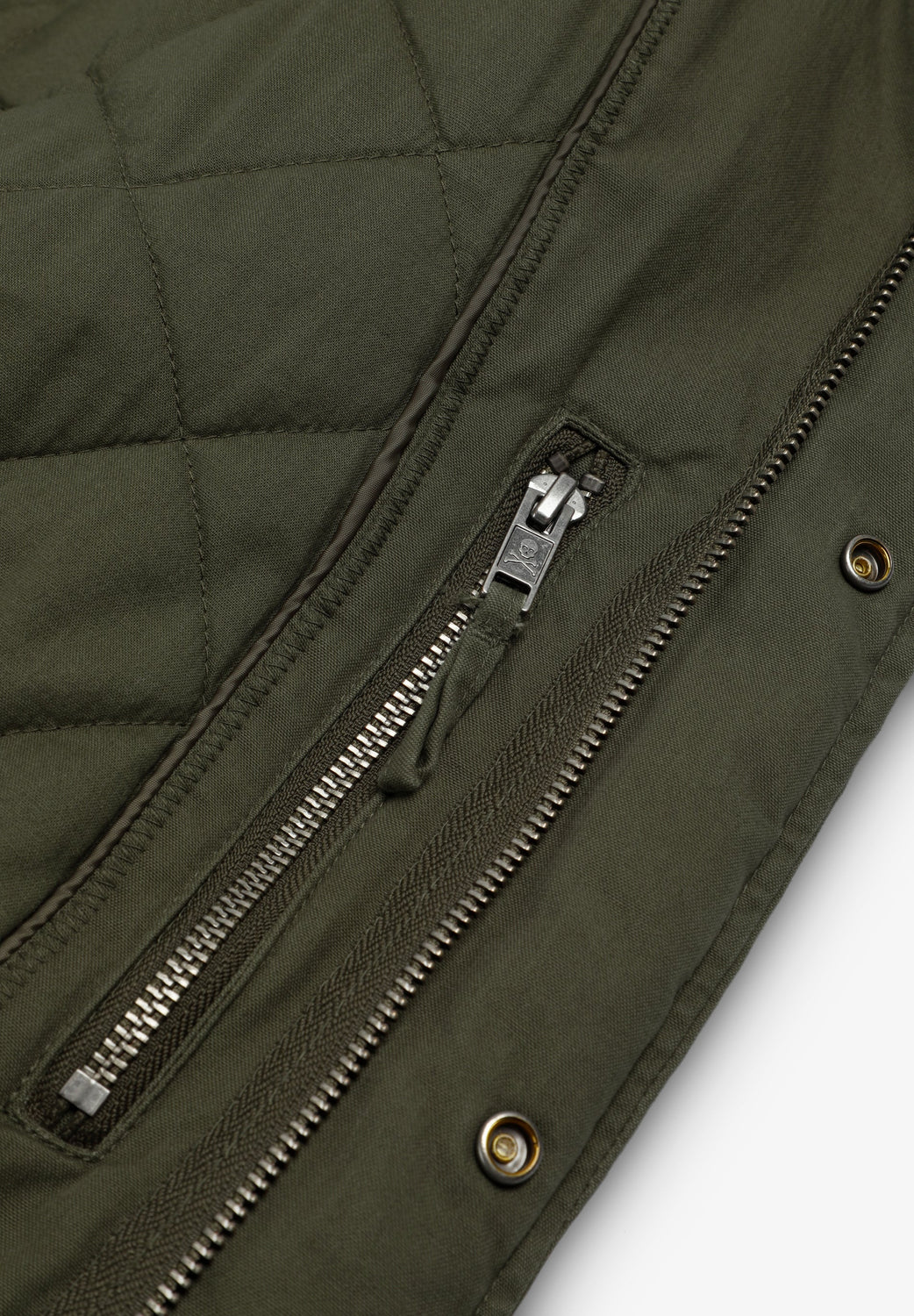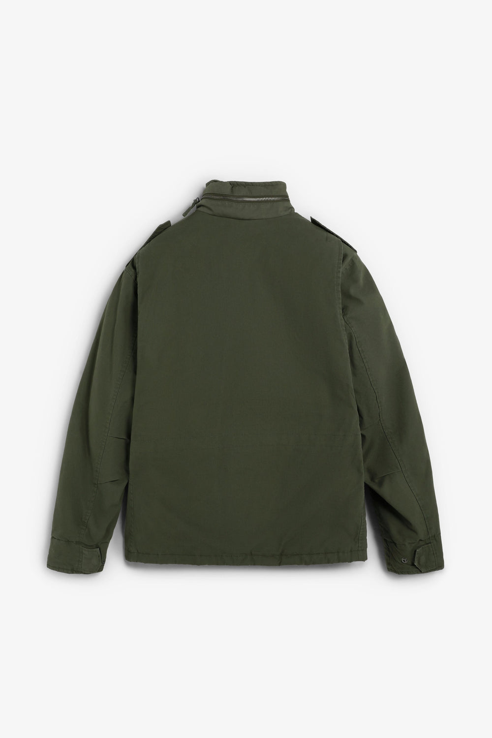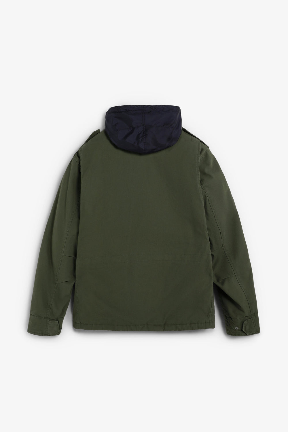 Jacket made of organic cotton. Military style. Four front pockets. Fastening at the neck. Adjustable inner drawstring. Front zip fastening and contrast hood concealed in the collar. Lined with diamond print. Adjustable cuffs. High-density logo detail on the sleeve.