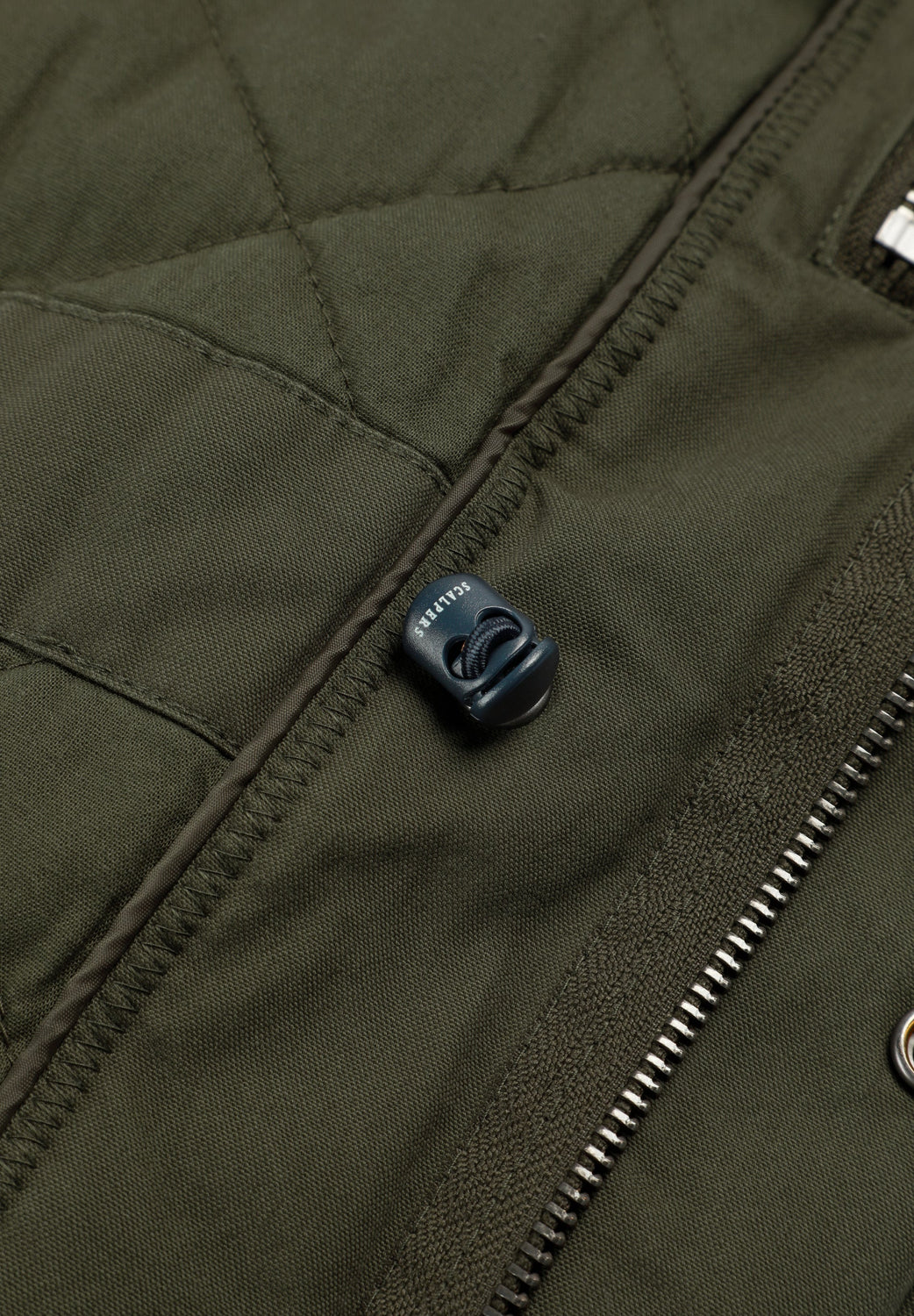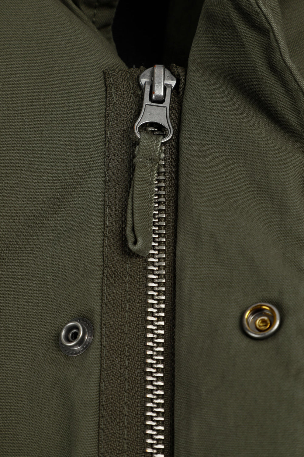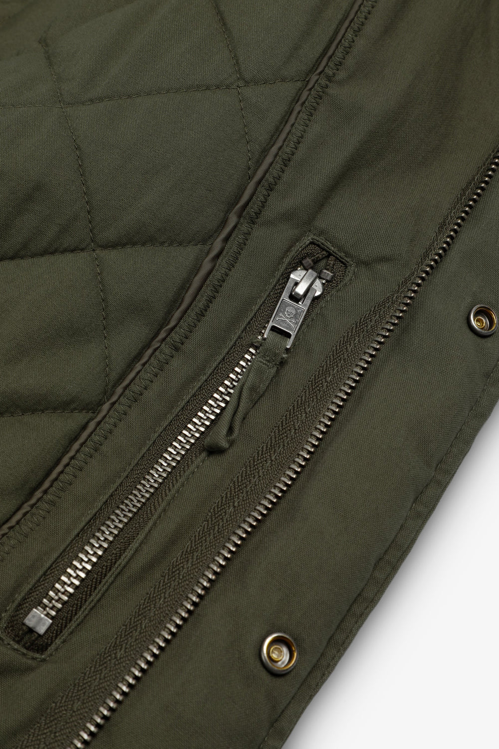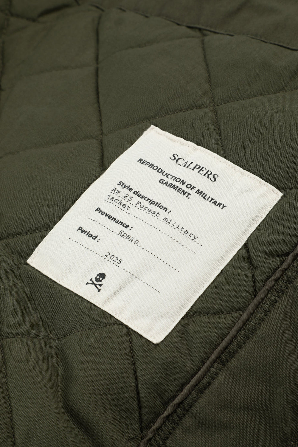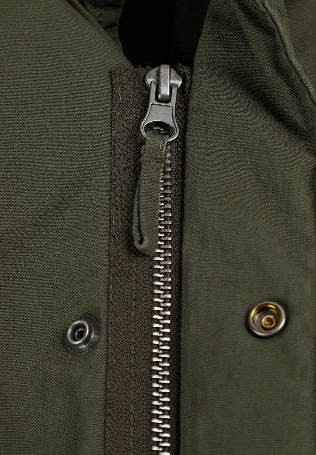 Jacket made of organic cotton. Military style. Four front pockets. Fastening at the neck. Adjustable inner drawstring. Front zip fastening and contrast hood concealed in the collar. Lined with diamond print. Adjustable cuffs. High-density logo detail on the sleeve.