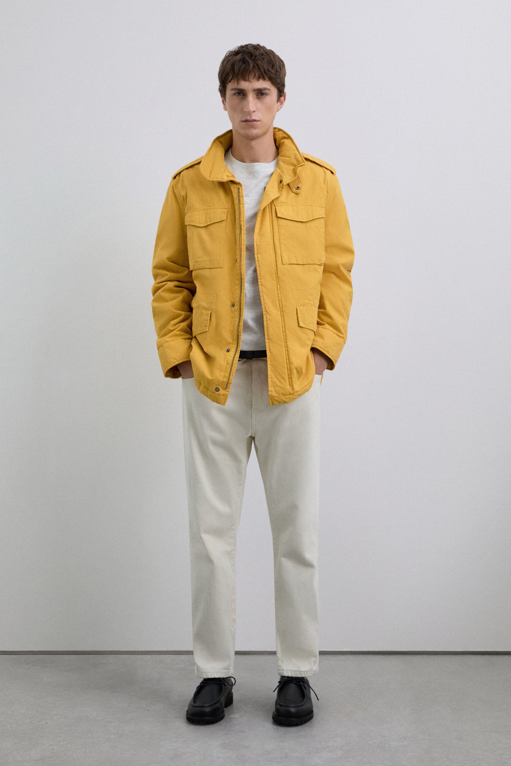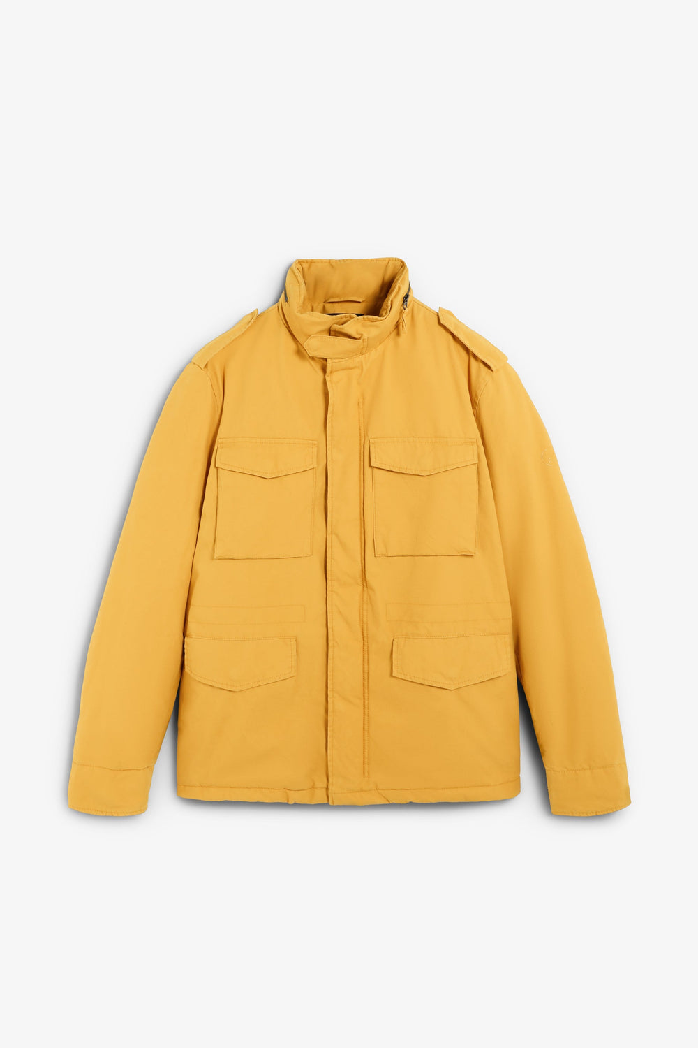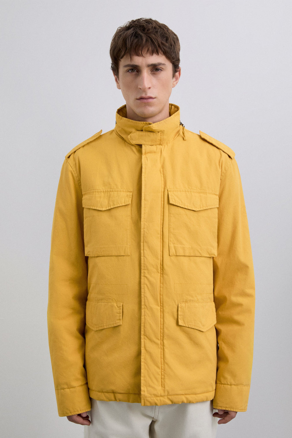 Jacket made of organic cotton. Military style. Four front pockets. Fastening at the neck. Adjustable inner drawstring. Front zip fastening and contrast hood concealed in the collar. Lined with diamond print. Adjustable cuffs. High-density logo detail on the sleeve.