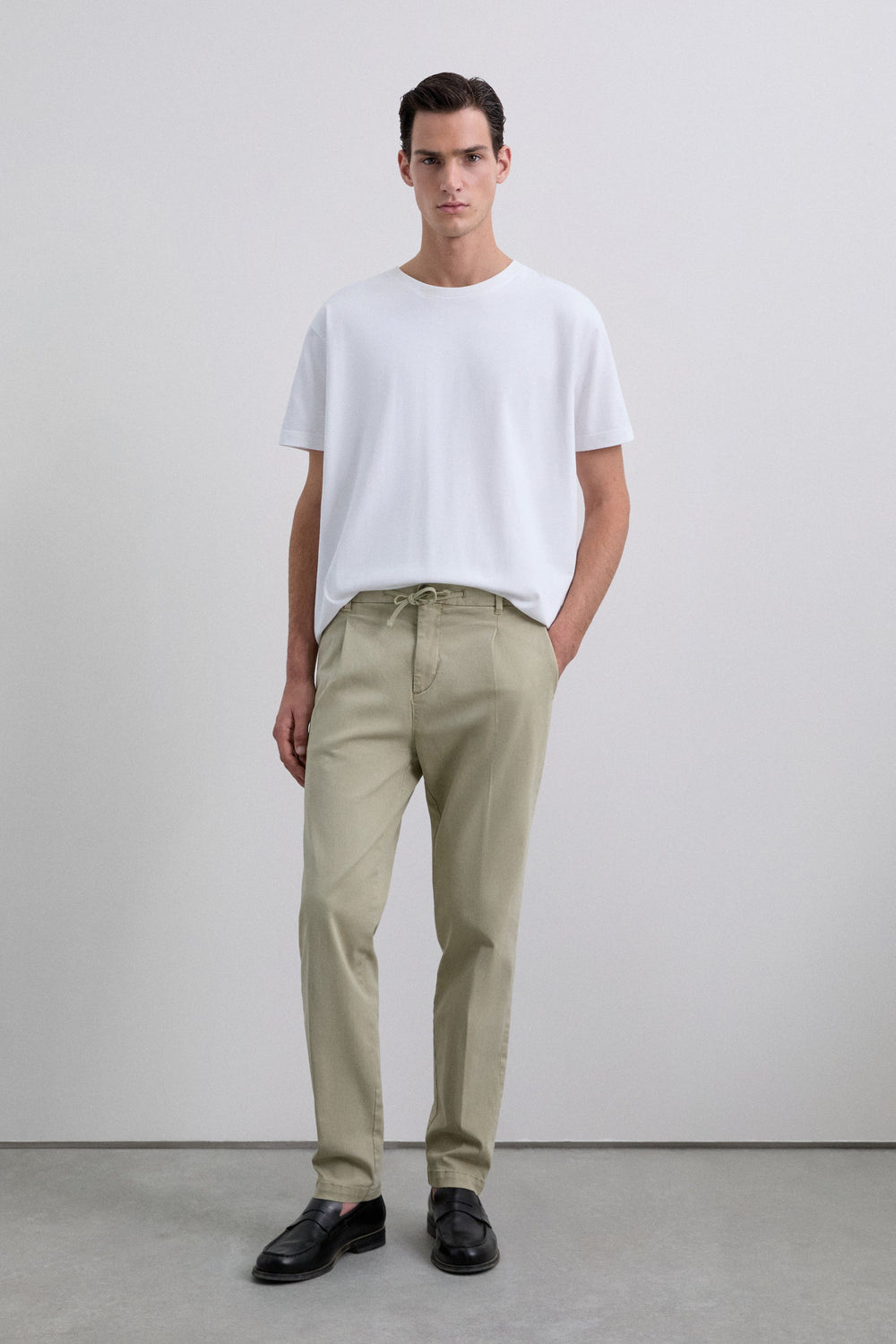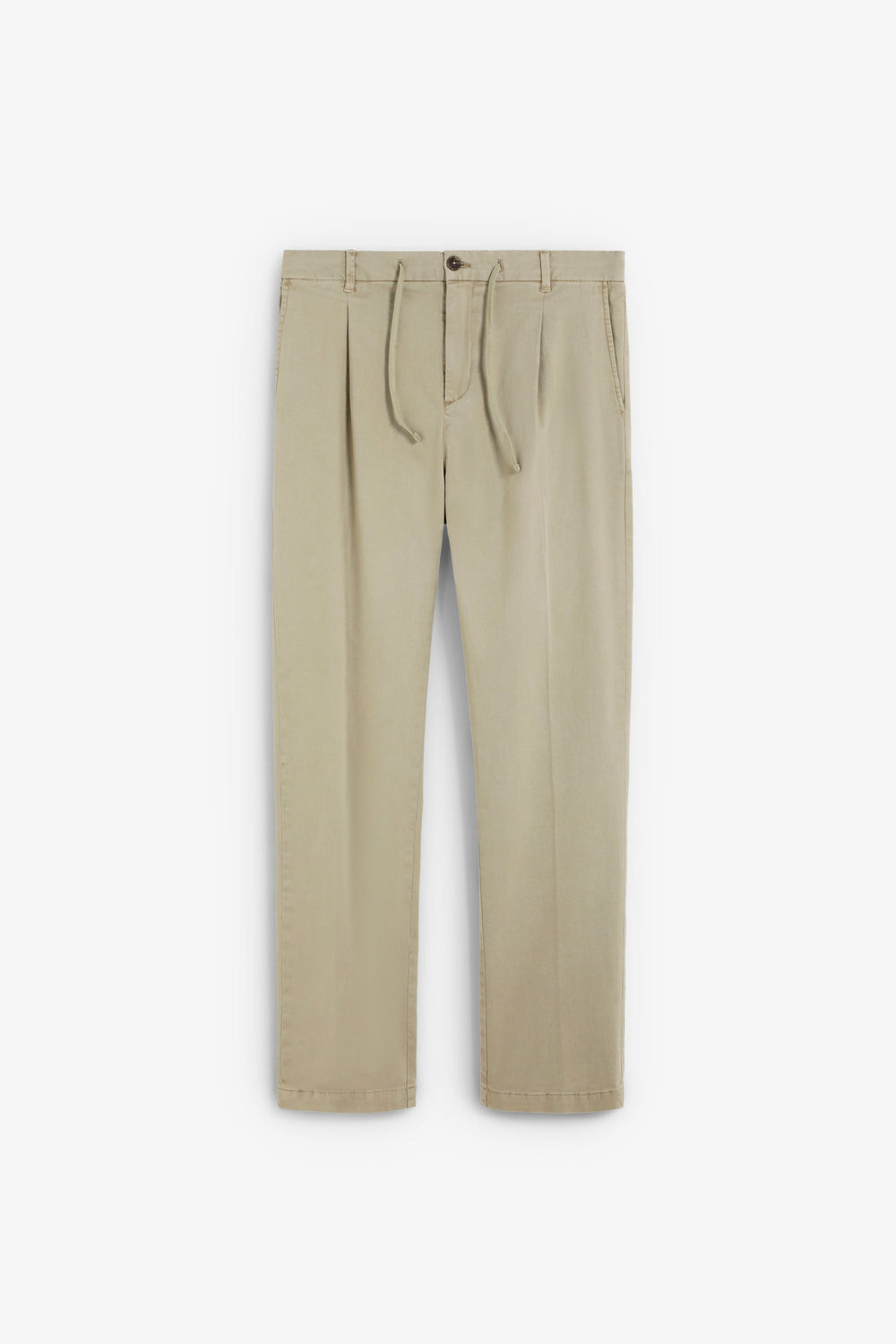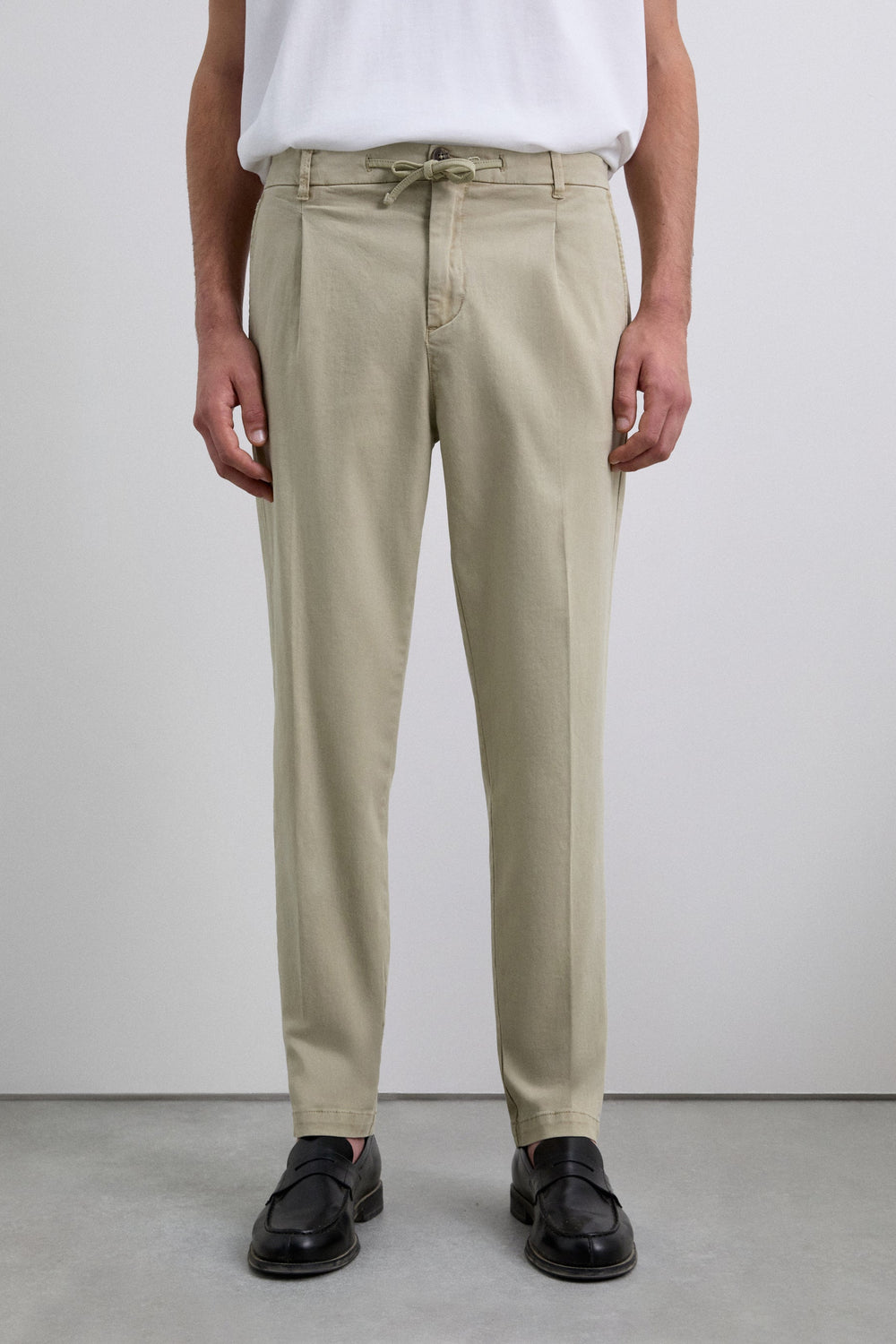 Trousers made of BCI cotton. Relaxed fit Adjustable fastening with drawstring and button at the waist. Two side pockets, back pockets with button fastening and front pleats. Belt loops at the waist.