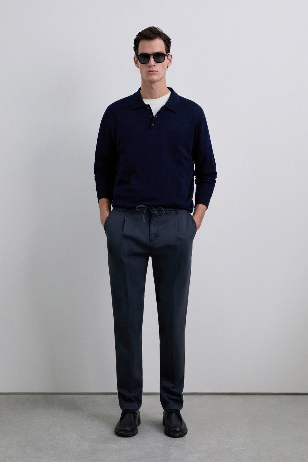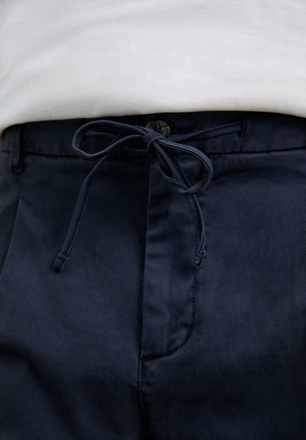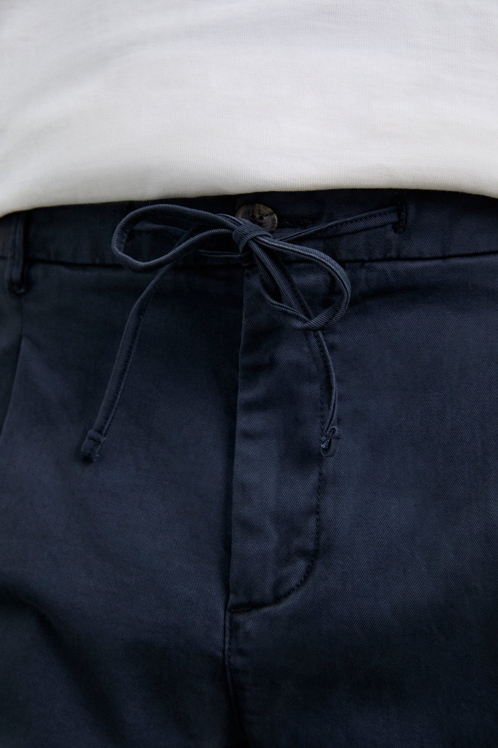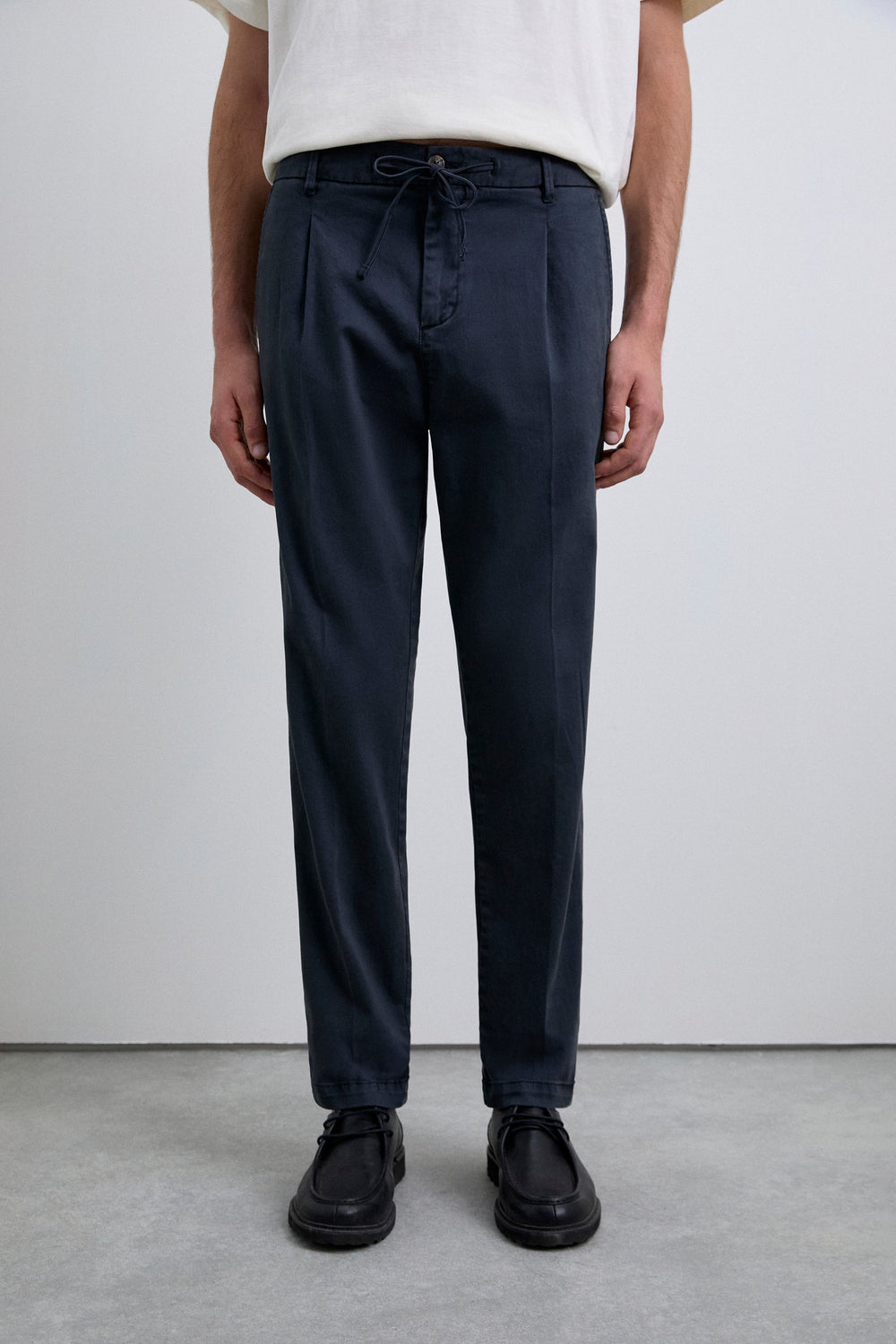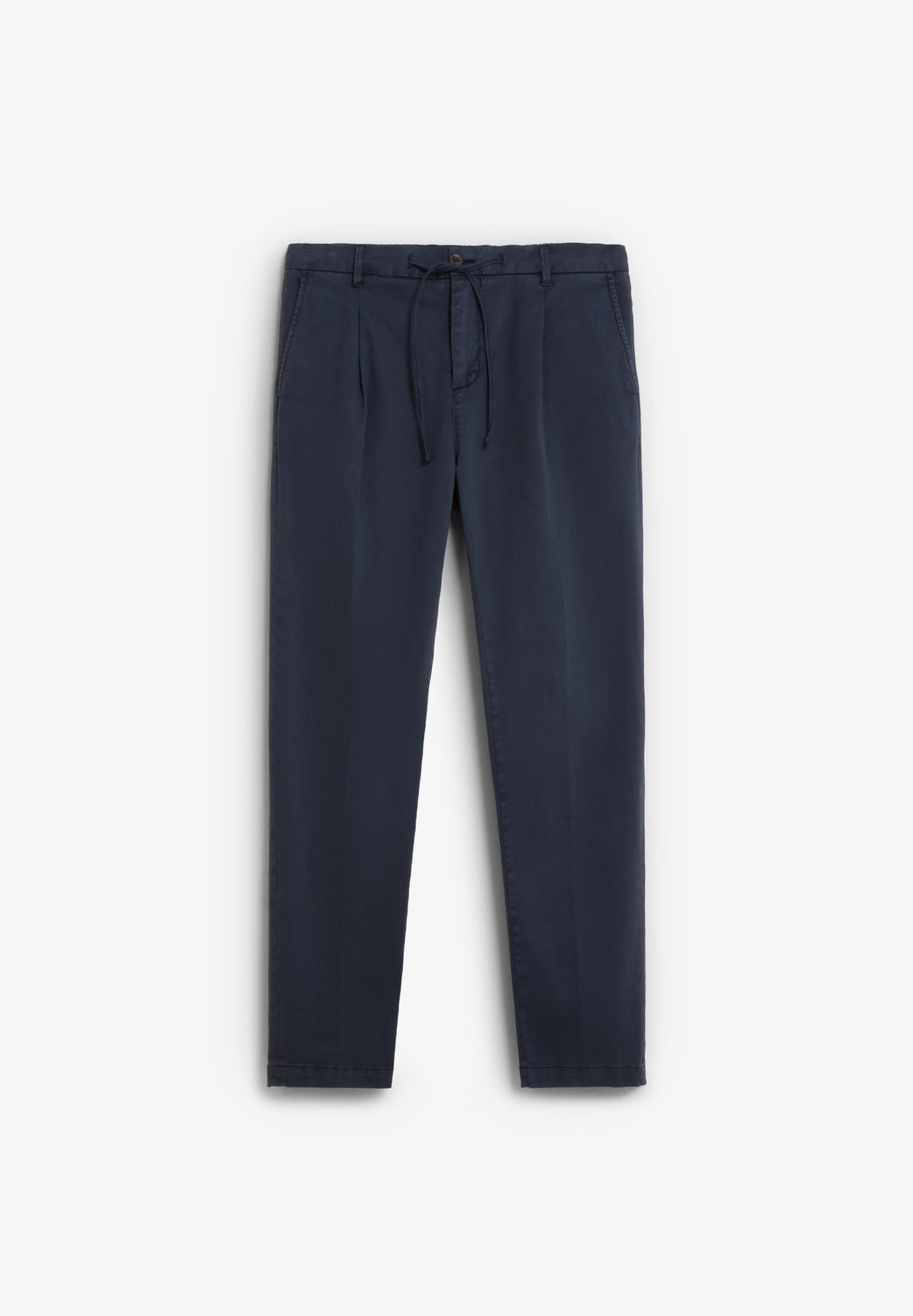 Trousers made of BCI cotton. Relaxed fit Adjustable fastening with drawstring and button at the waist. Two side pockets, back pockets with button fastening and front pleats. Belt loops at the waist.