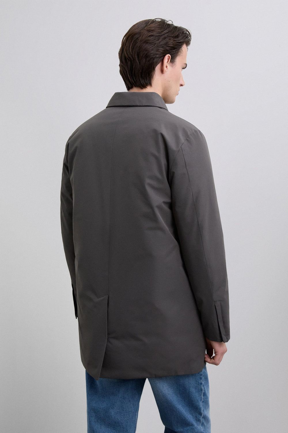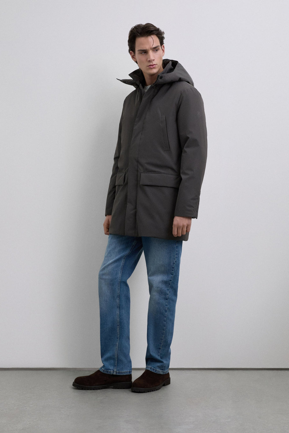 Hooded technical parka. Long sleeves. Four front pockets, two slanted top pockets and two lower flap pockets. Adjustable zip fastening on the cuffs.
