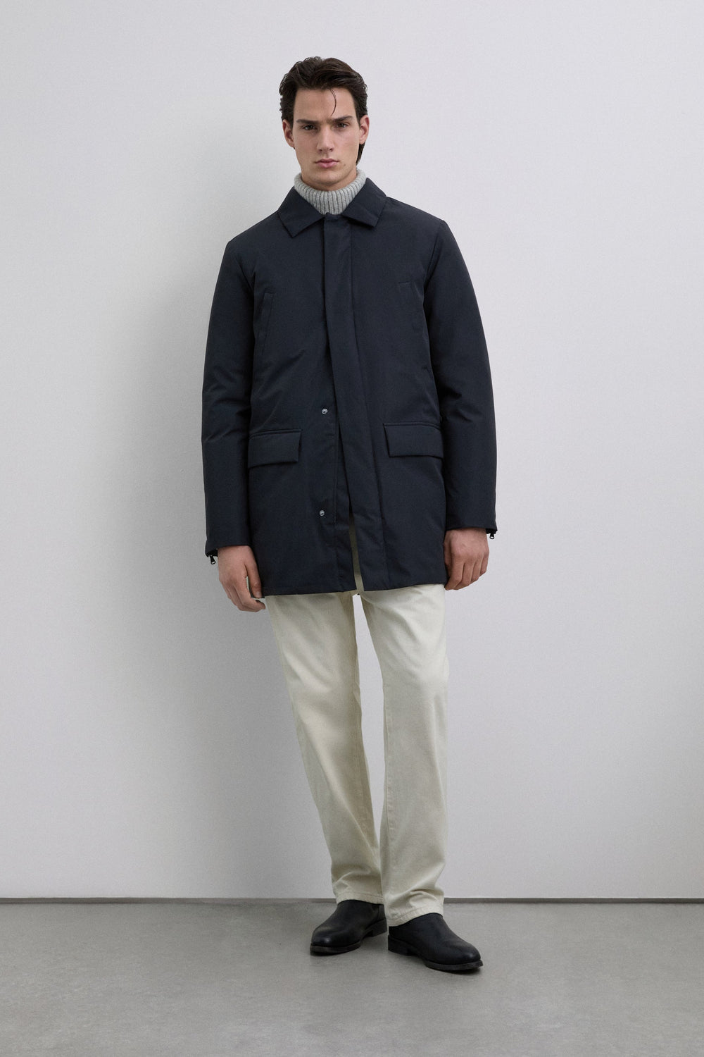 Hooded technical parka. Long sleeves. Four front pockets, two slanted top pockets and two lower flap pockets. Adjustable zip fastening on the cuffs.