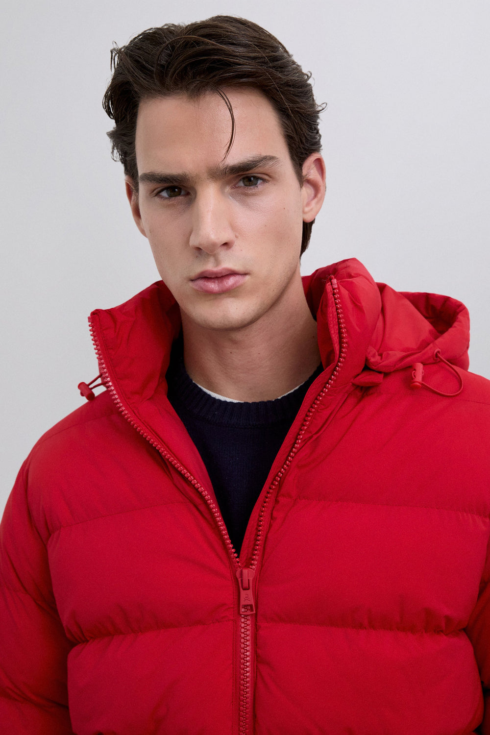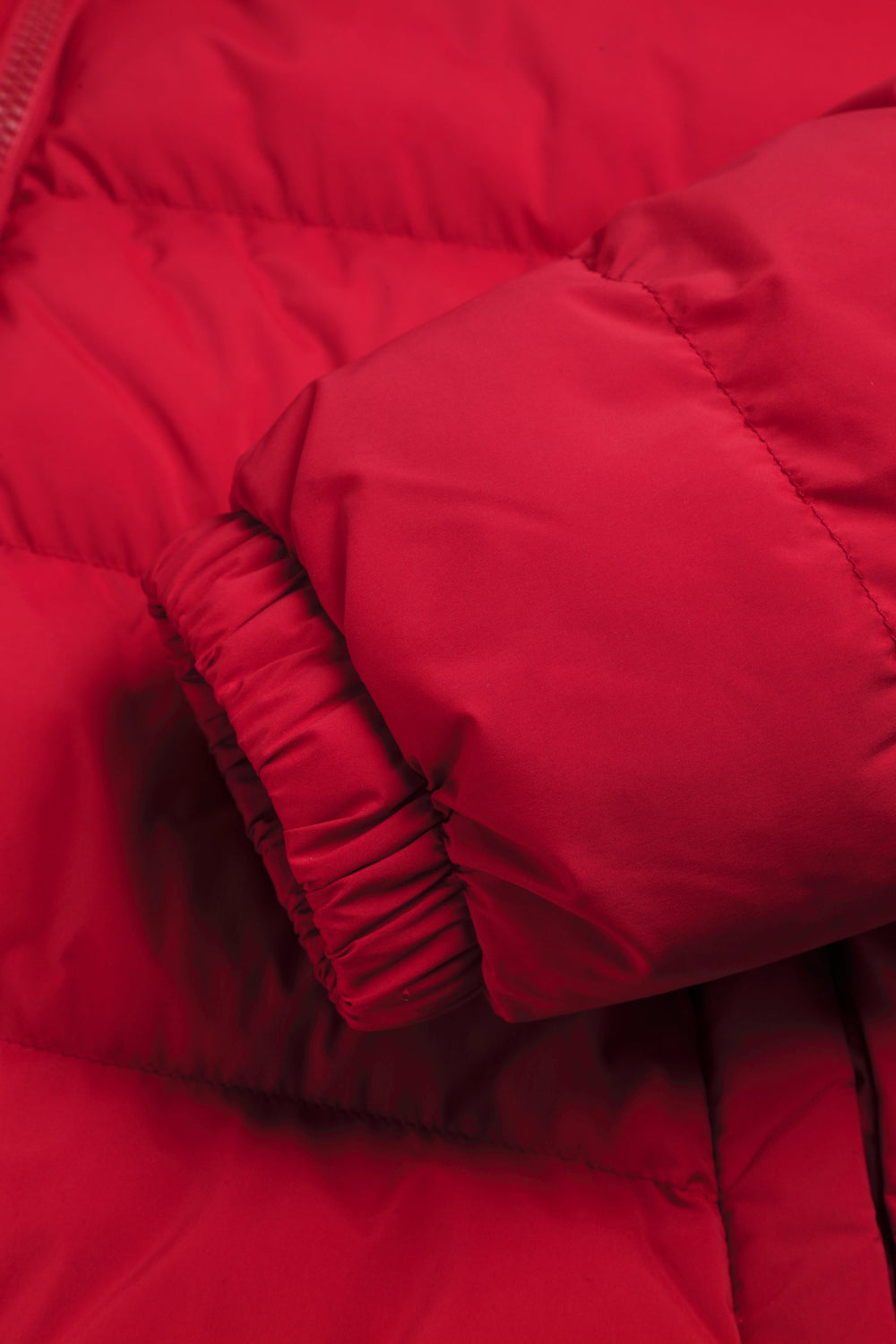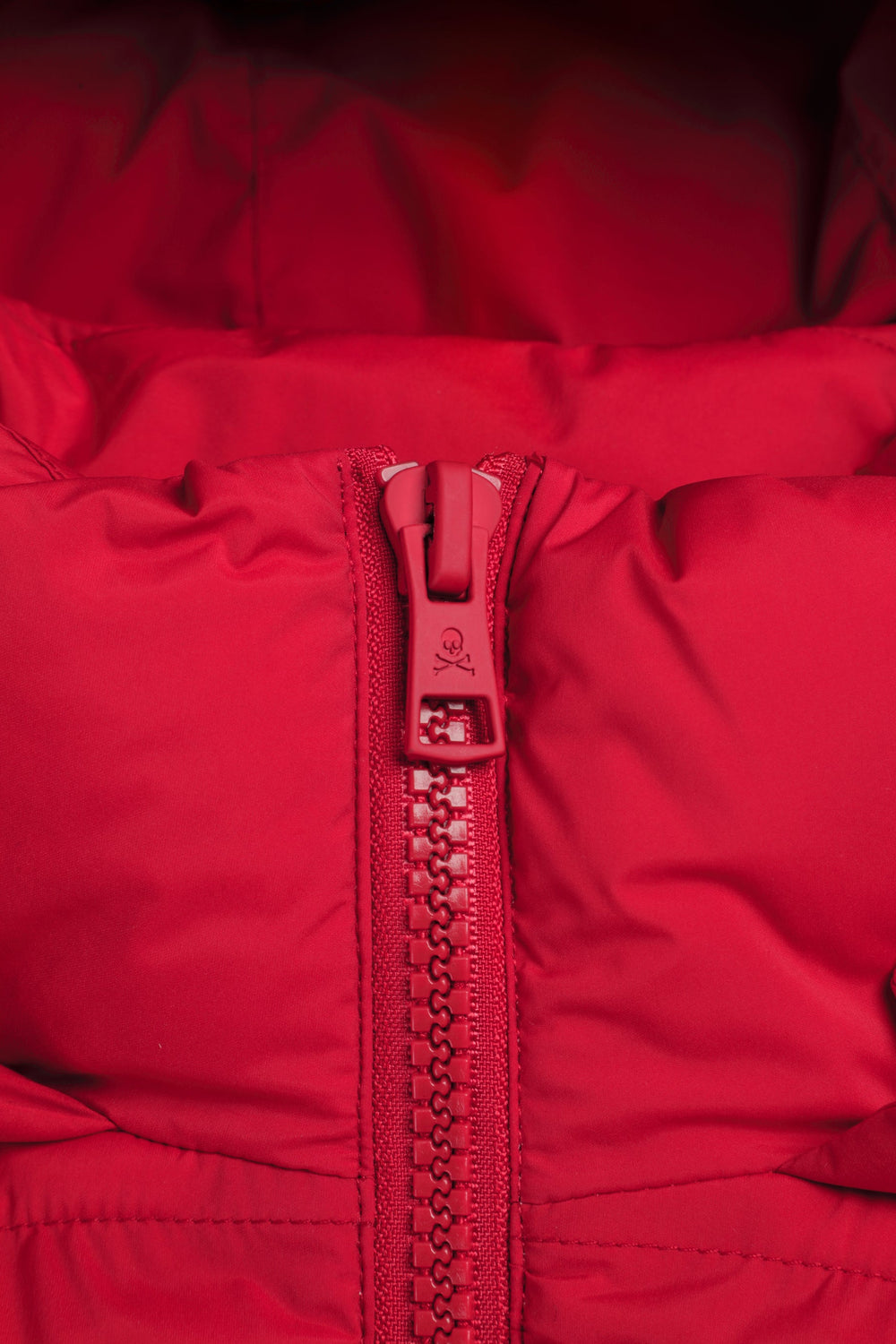 Padded jacket with skull detail on the arm. Two front pockets. Front zip fastening with customised pull. Customised aglets on the hood. Adjustable cuffs and hem. Thermolite filling. Detachable hood. Lining with diamond quilted detail.