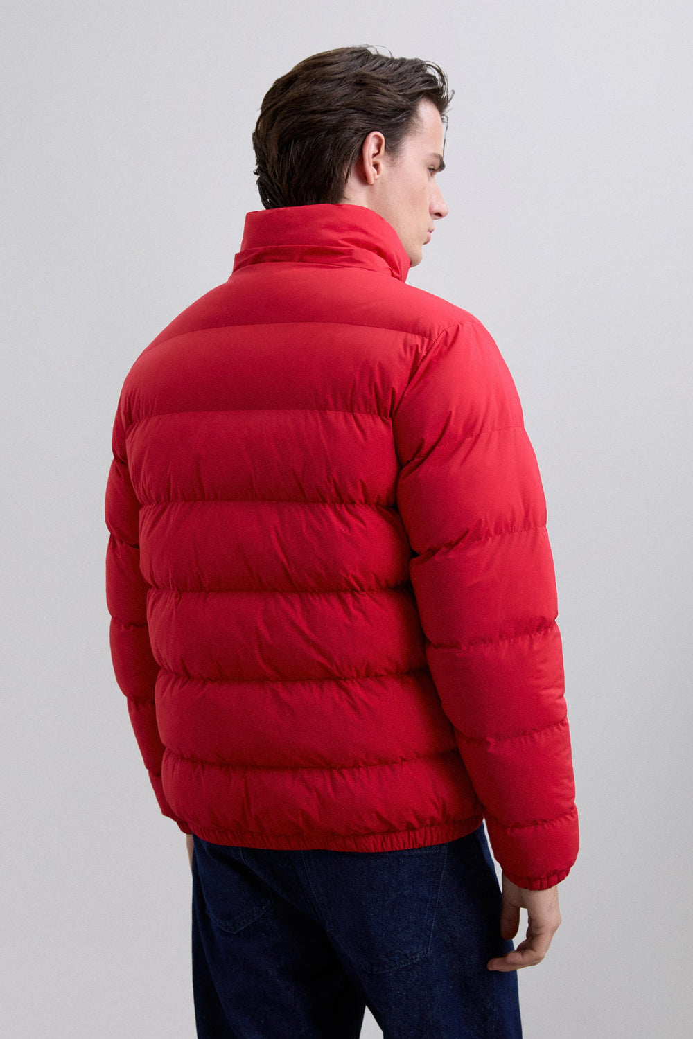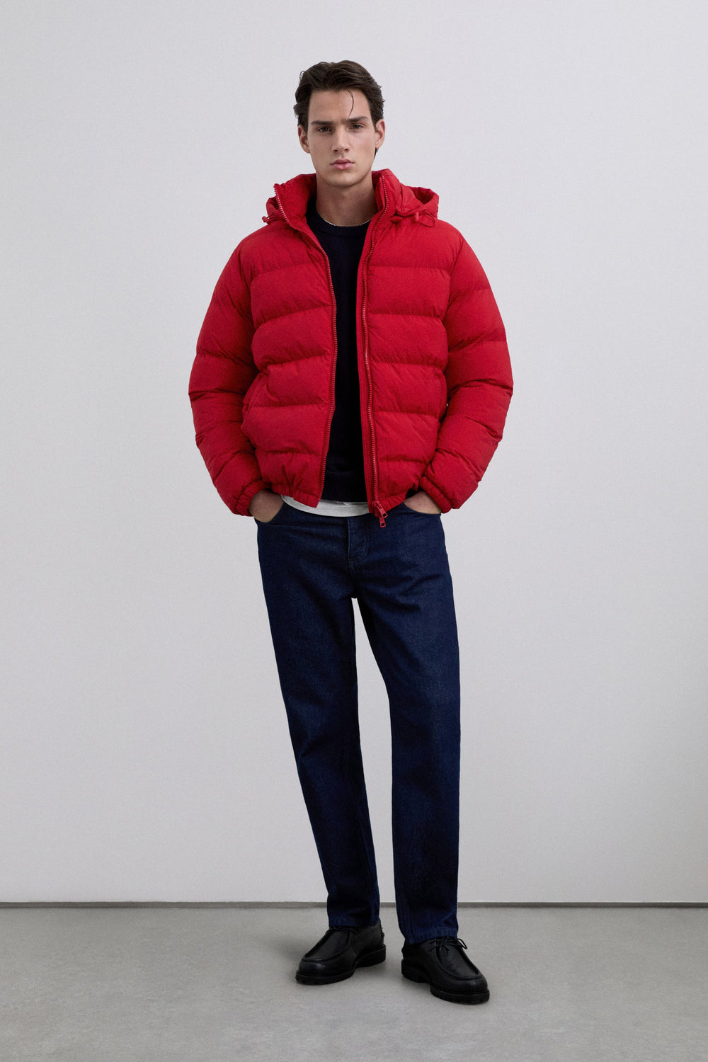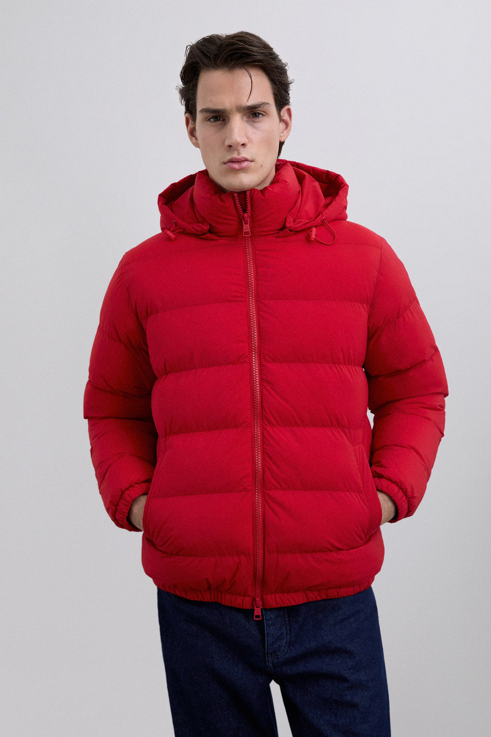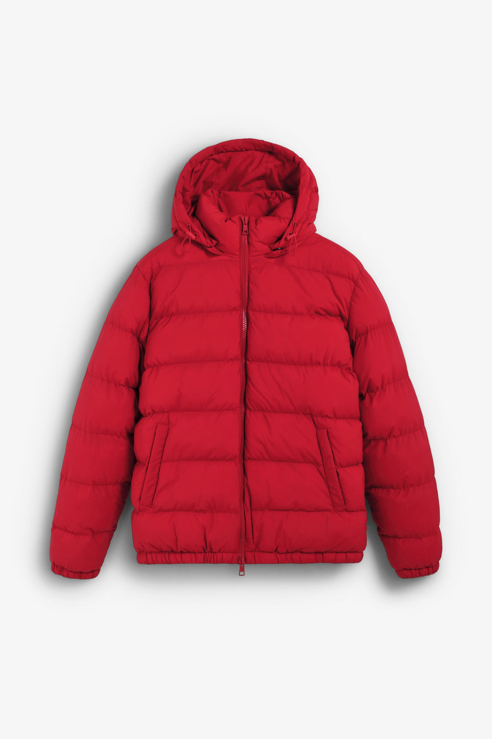 Padded jacket with skull detail on the arm. Two front pockets. Front zip fastening with customised pull. Customised aglets on the hood. Adjustable cuffs and hem. Thermolite filling. Detachable hood. Lining with diamond quilted detail.