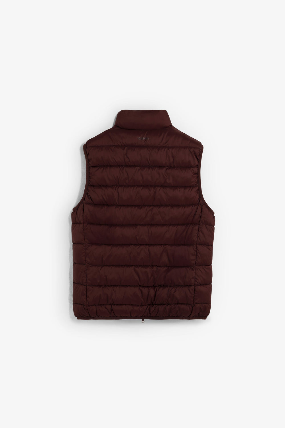 Puffer vest. Water repellent. Inner lining made of technical fabric. Concealed side pockets with fleece lining. Engraved double slider zip fastening. Rubberised patch with matching logo on chest.