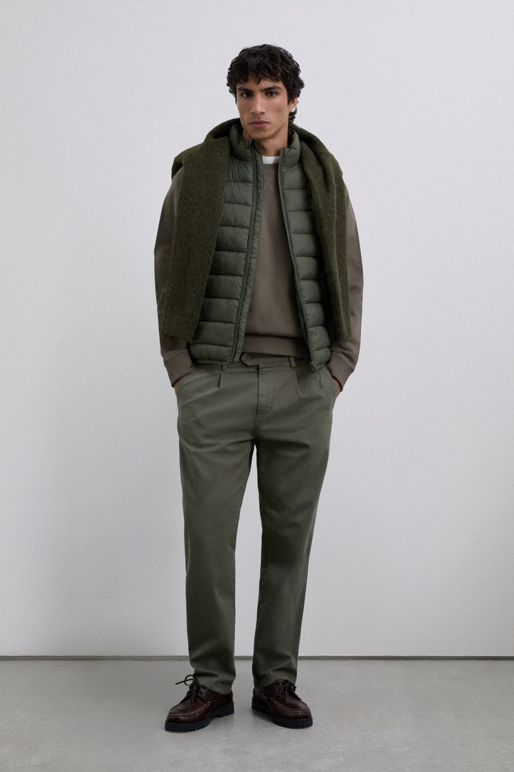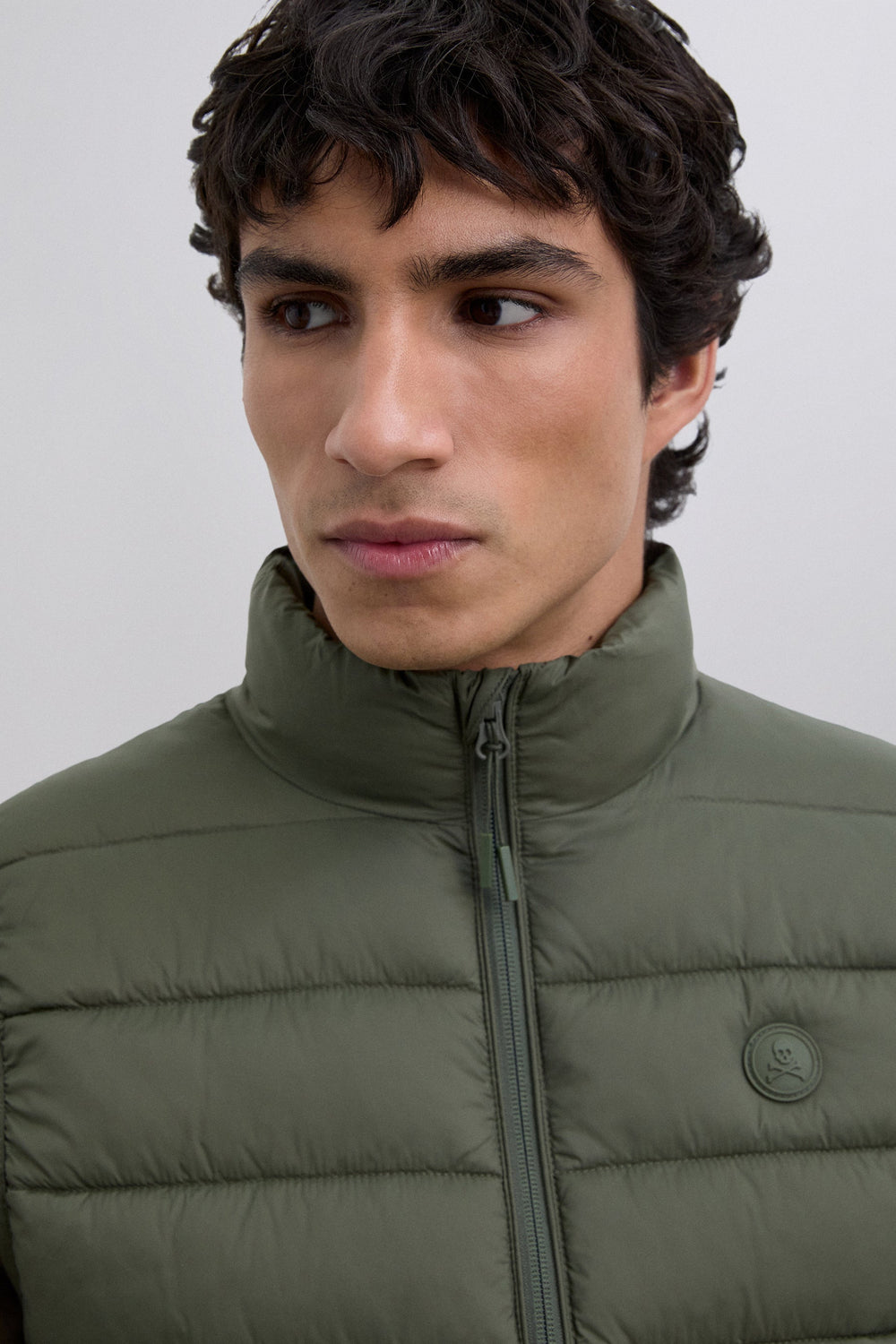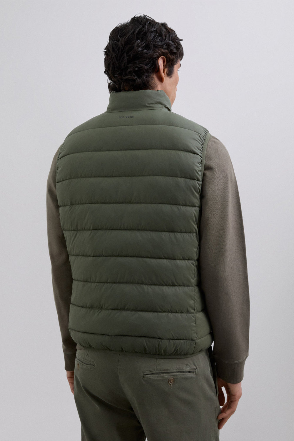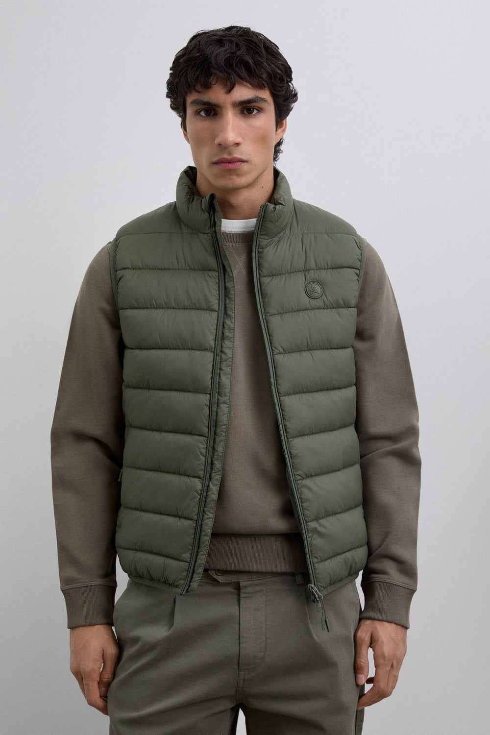 Puffer vest. Water repellent. Inner lining made of technical fabric. Concealed side pockets with fleece lining. Engraved double slider zip fastening. Rubberised patch with matching logo on chest.