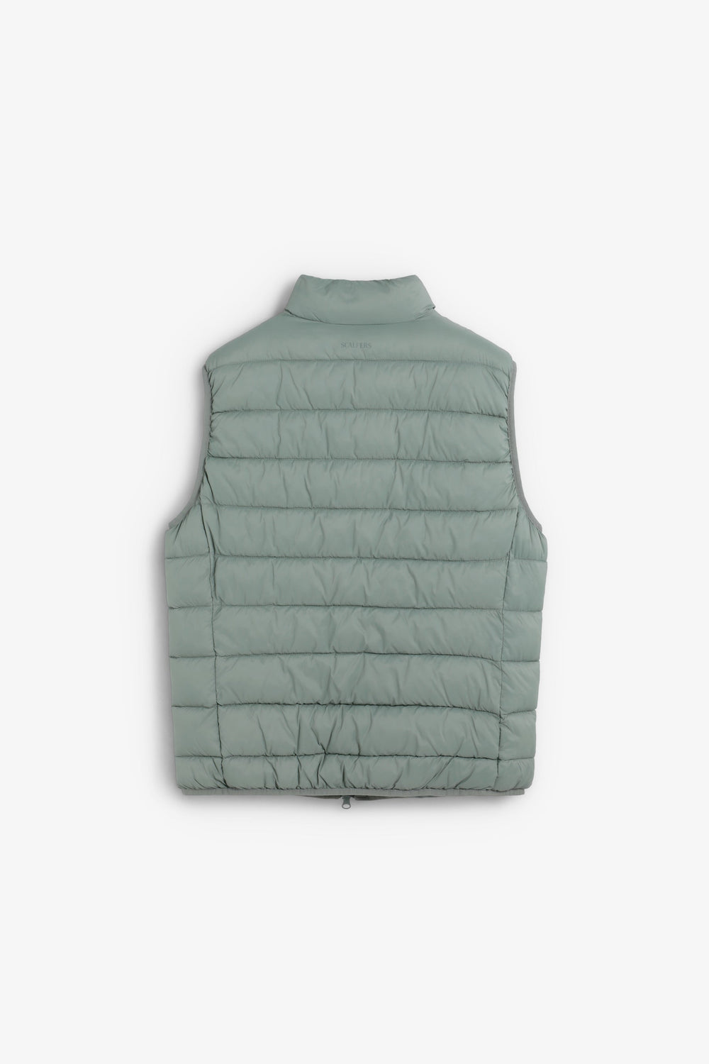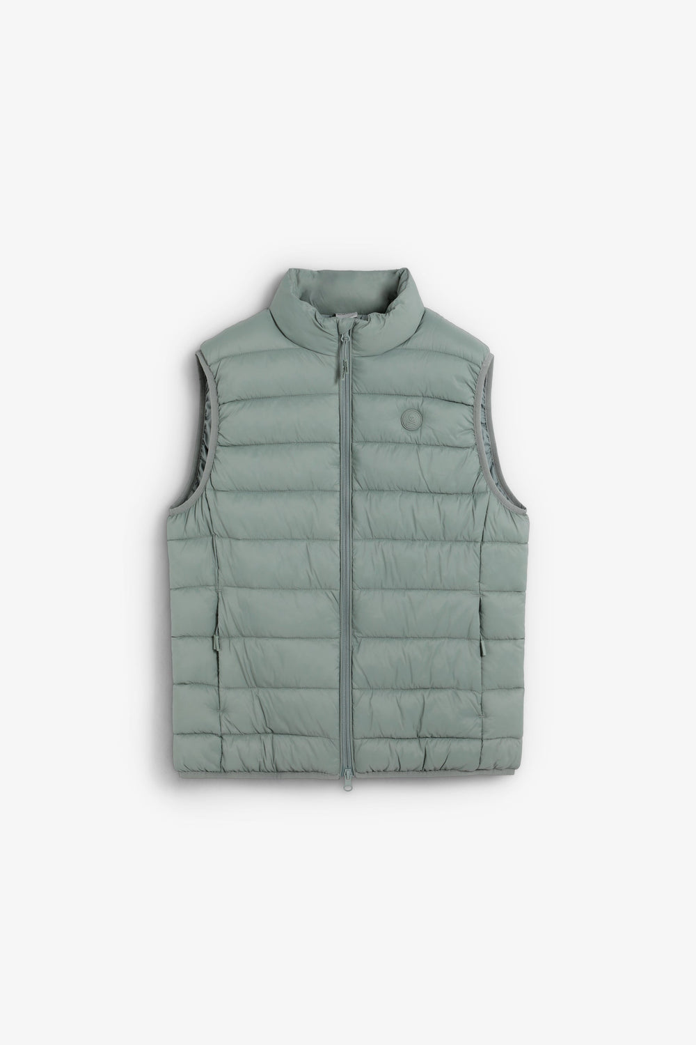 Puffer vest. Water repellent. Inner lining made of technical fabric. Concealed side pockets with fleece lining. Engraved double slider zip fastening. Rubberised patch with matching logo on chest.